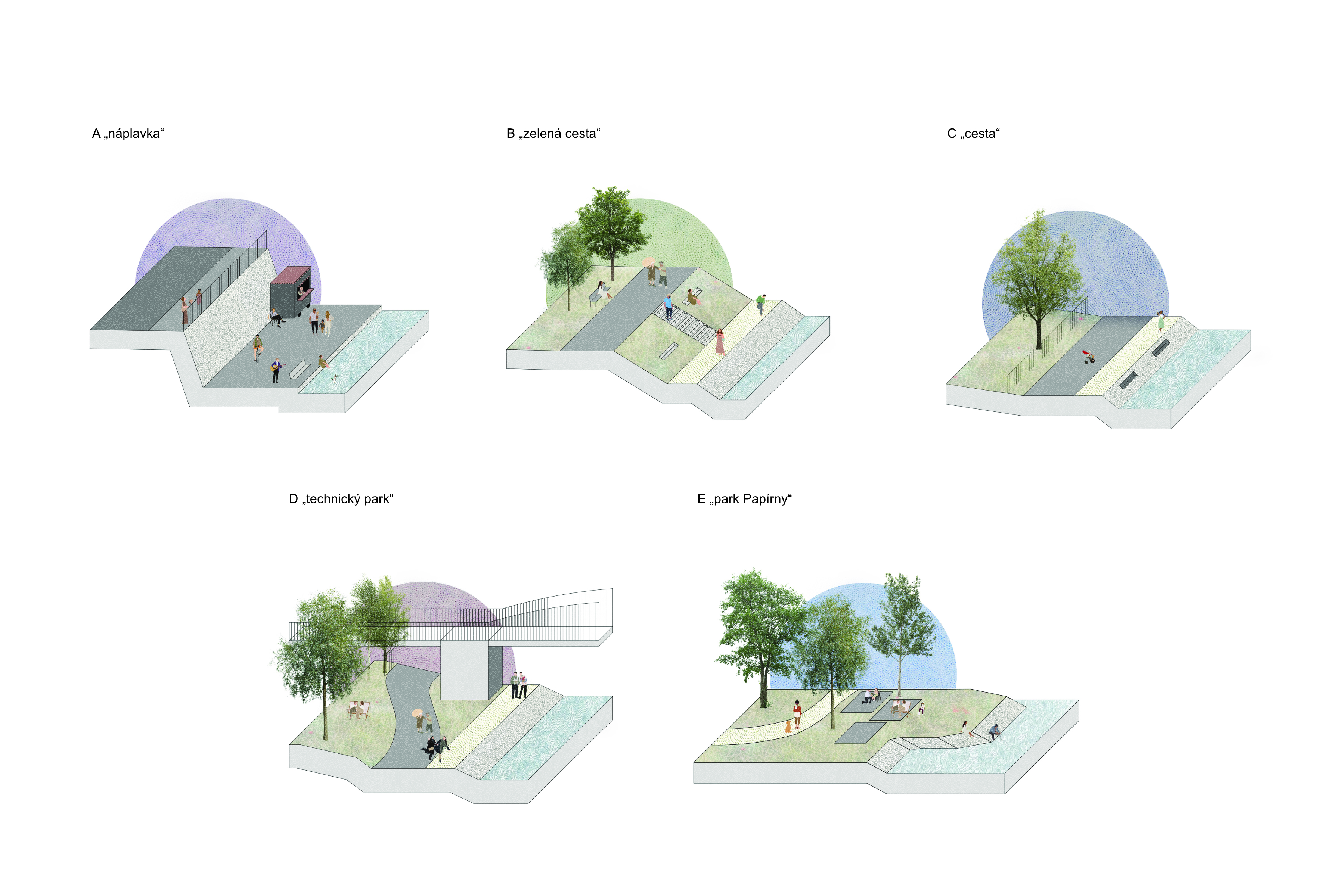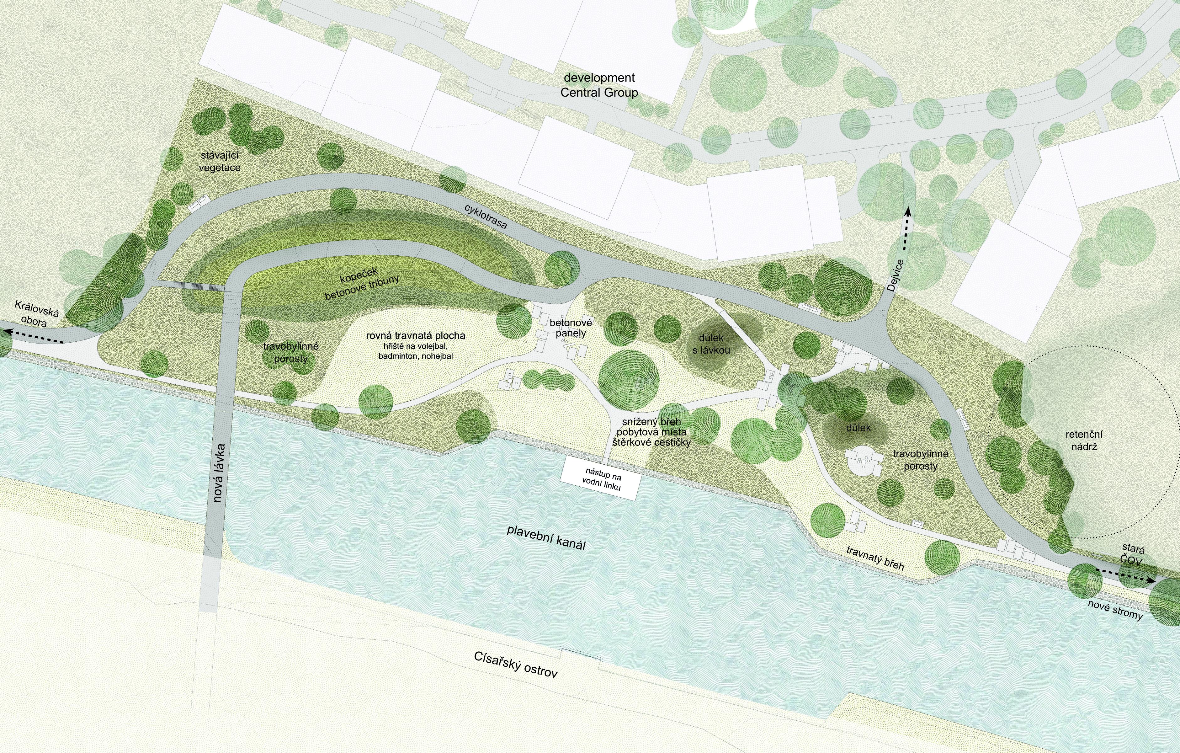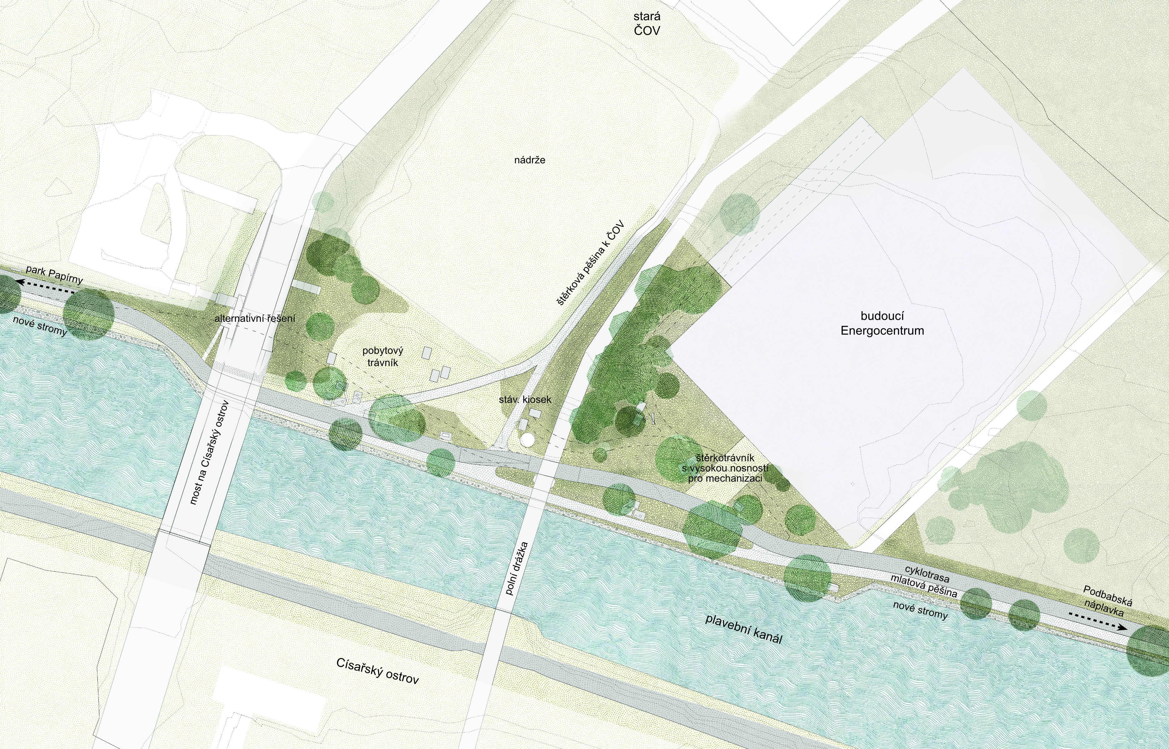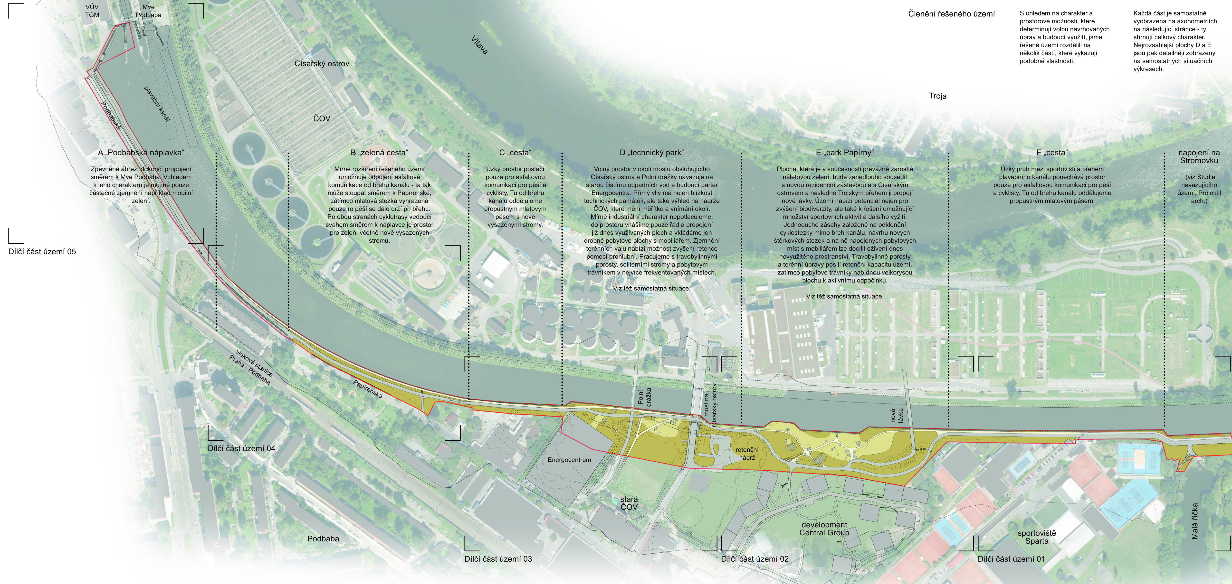 Osou území je vedení páteřní cyklotrasy A1 kombinované s pohybem pěších. Nový profil nábřeží nabídne čtyřmetrovou stezku doplněnou o paralelní pěšiny a pobytové plochy. Urbanistický rozvoj území úzce souvisí s konverzí historického areálu bývalých papíren na polyfunkční centrum a aktivním zapojením národní kulturní památky Staré čistírny odpadních vod. Krajinářská koncepce posiluje charakter nivní krajiny prostřednictvím náhradních výsadeb, které respektují hydraulické vlastnosti území při povodních. Celková vize zahrnuje i nová propojení na Císařský ostrov a do Troji pomocí lávek, čímž projekt navazuje na historický Engelův zelený pás. Výsledkem bude moderní nábřežní promenáda s dětskými hřišti, skateparkem a novou schodišťovou náplavkou u Podbaby.