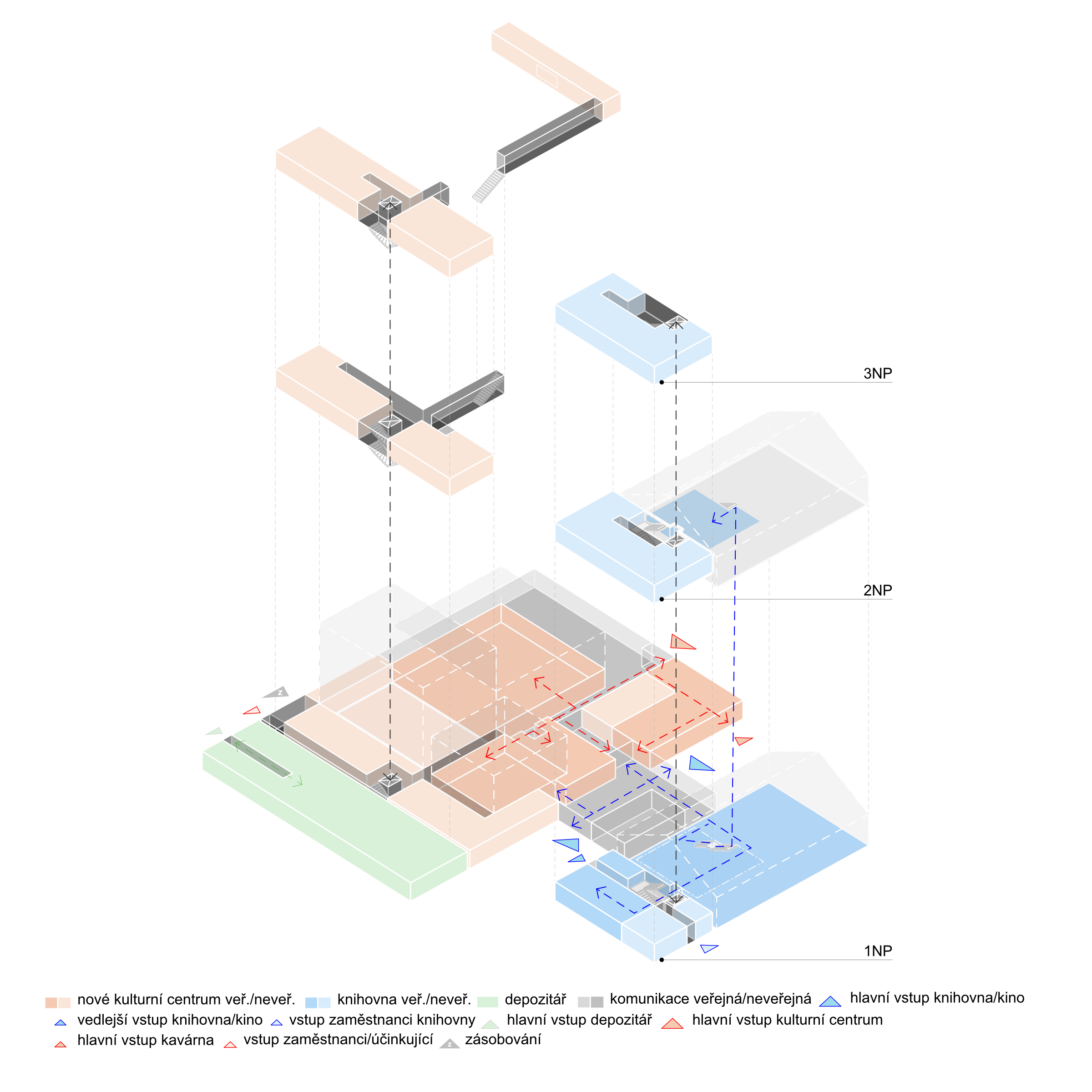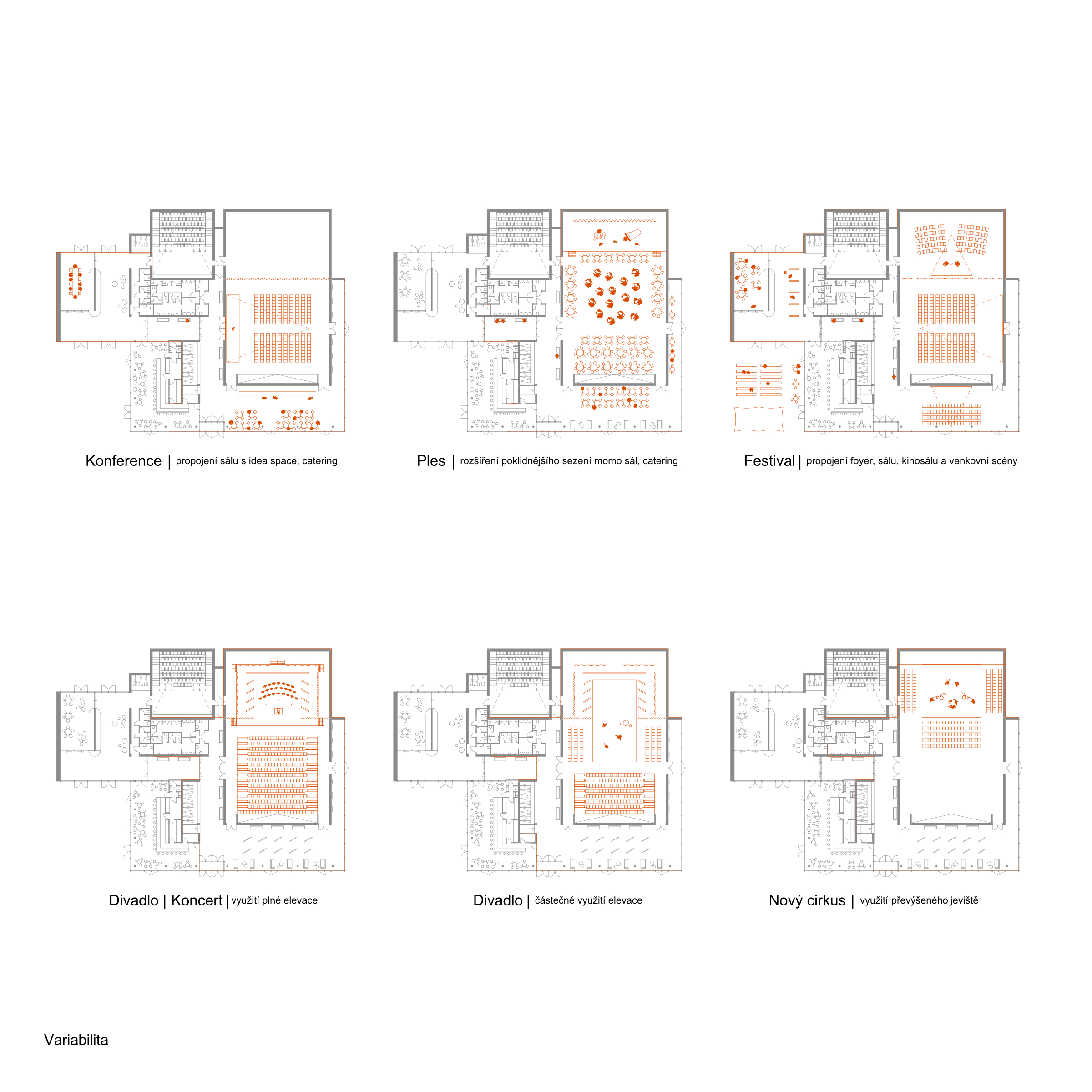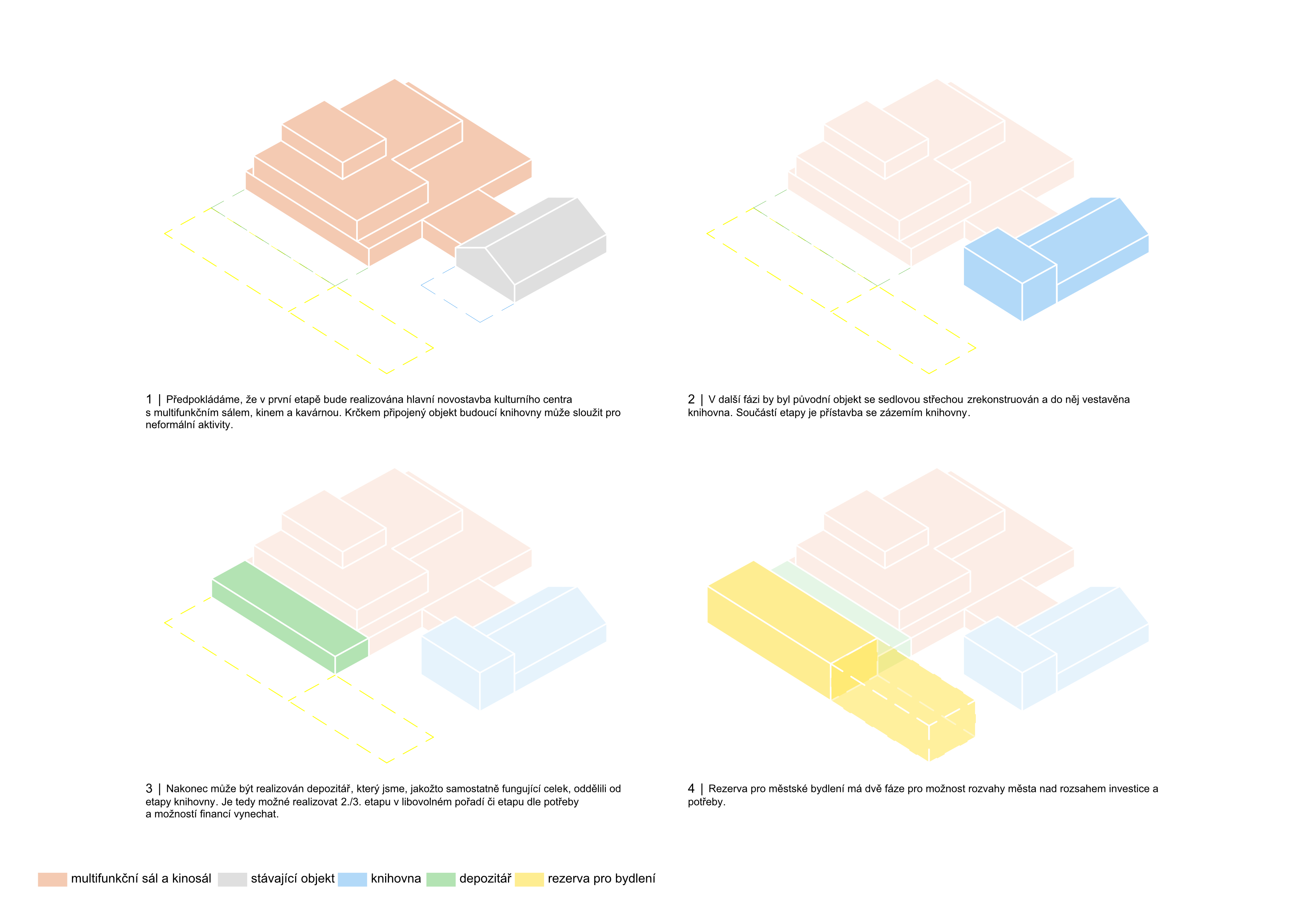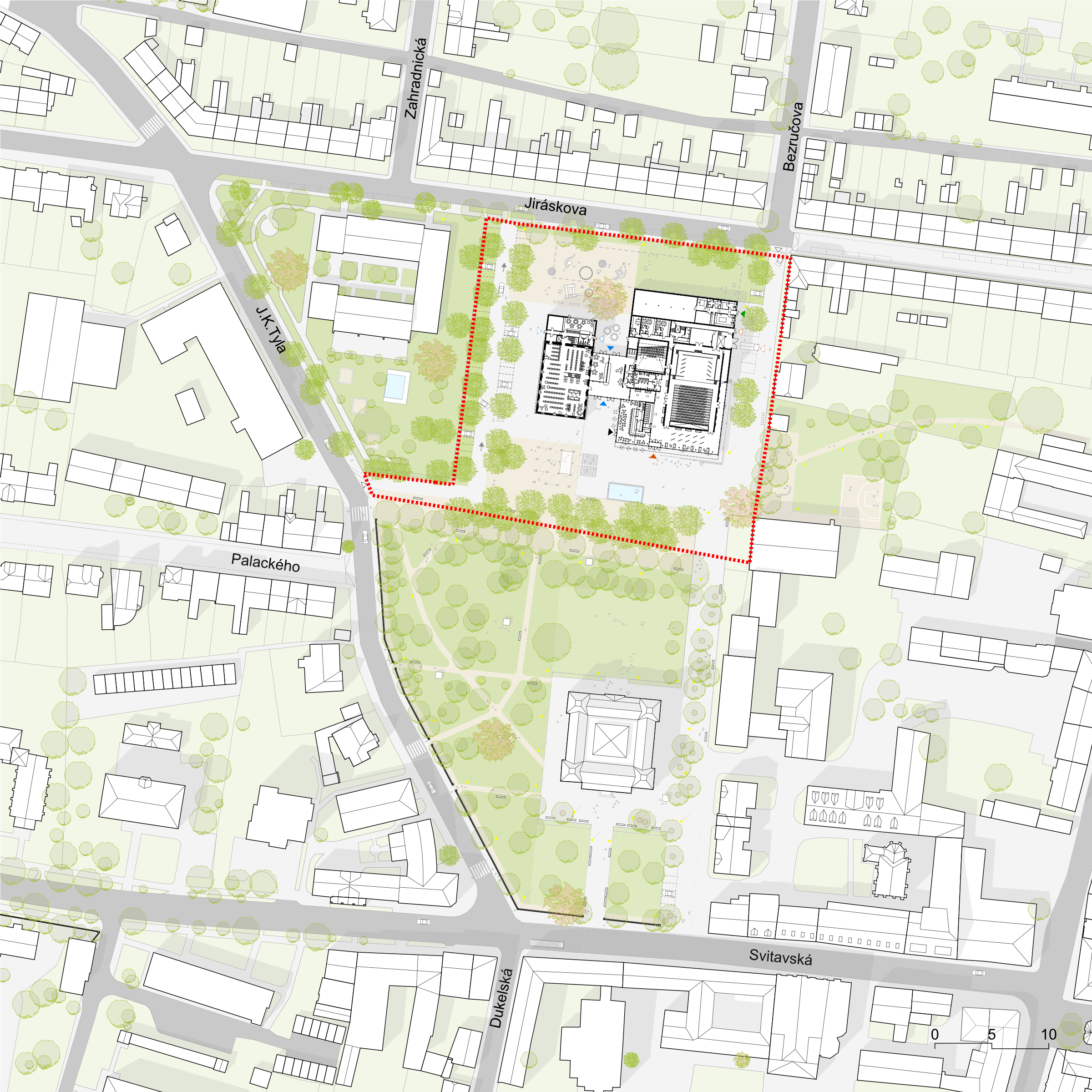Považujeme parkový charakter území za silný motiv a potvrzujeme jej spolu s prostupností, přehledností a novými druhy prostředí pro více generací. Spojnici Svitavské a Jiráskovy ulice povyšujeme z obslužné komunikace a pěší spojky na pěší korzo, které propojuje všechny stávající i nové veřejné budovy. Z původní továrny využíváme starou halu pro knihovnu a litinové sloupy pro venkovní amfiteátr. Motiv textilu/hedvábí používáme pro hlavní poznávací znamení nového kulturního centra na fasádě i v interiéru. Veřejné prostory jsou v přízemí, což umožňuje bezbariérovost a velkou variabilitu jejich propojování a rozšíření i do exteriéru. Horizontální vrstvení objektu je vstřícné k okolní zástavbě a vhodně reprezentativní. Blyštivá koruna jeviště ukazuje význam nové instituce města.