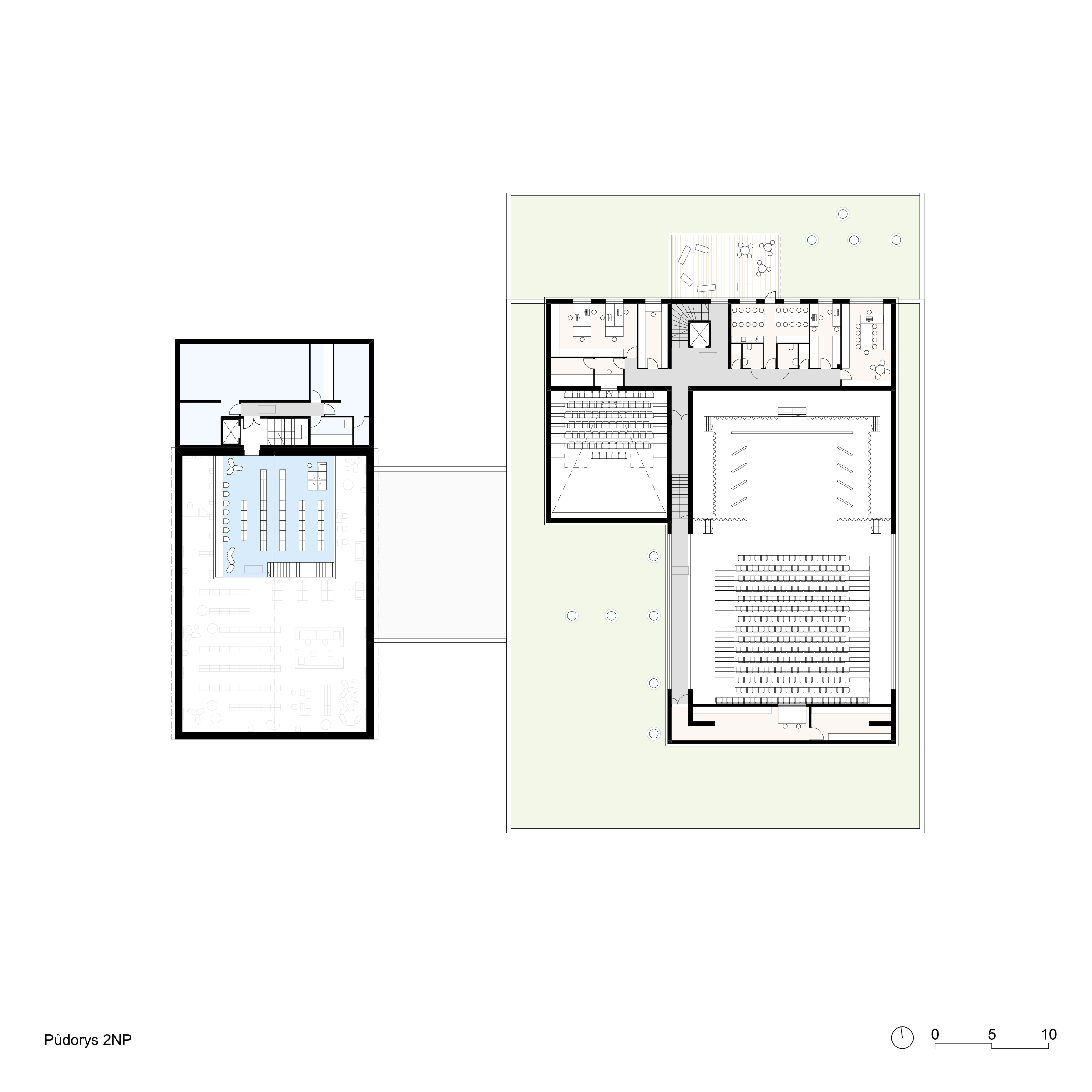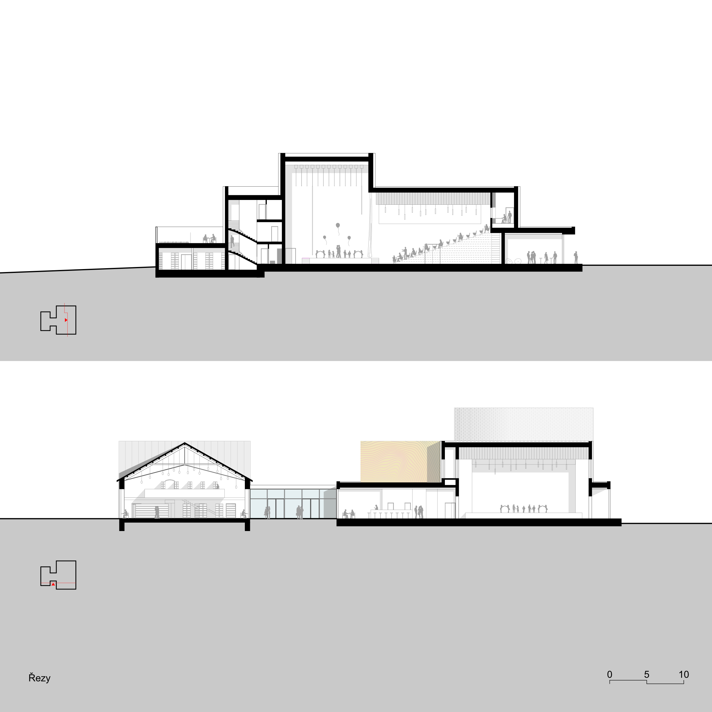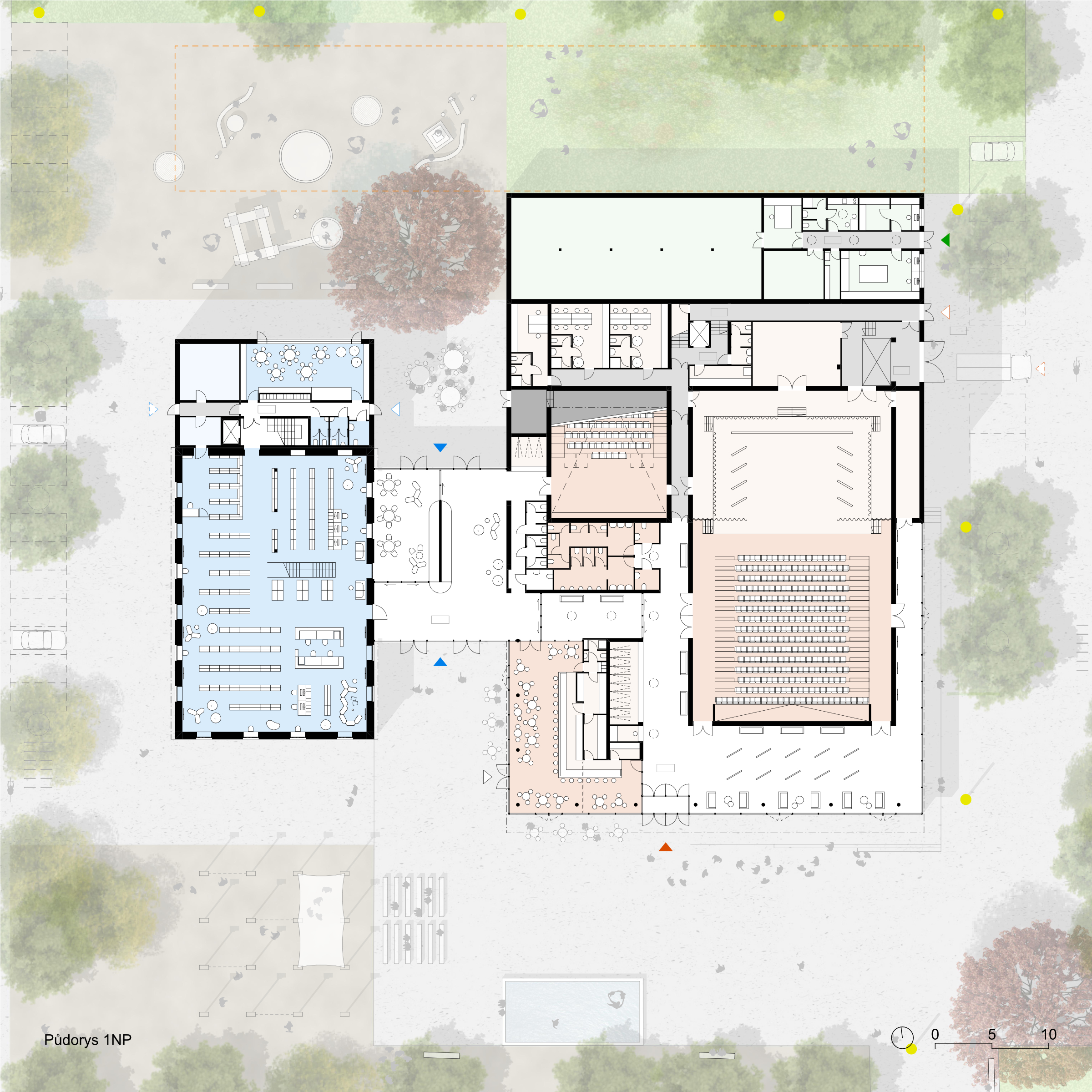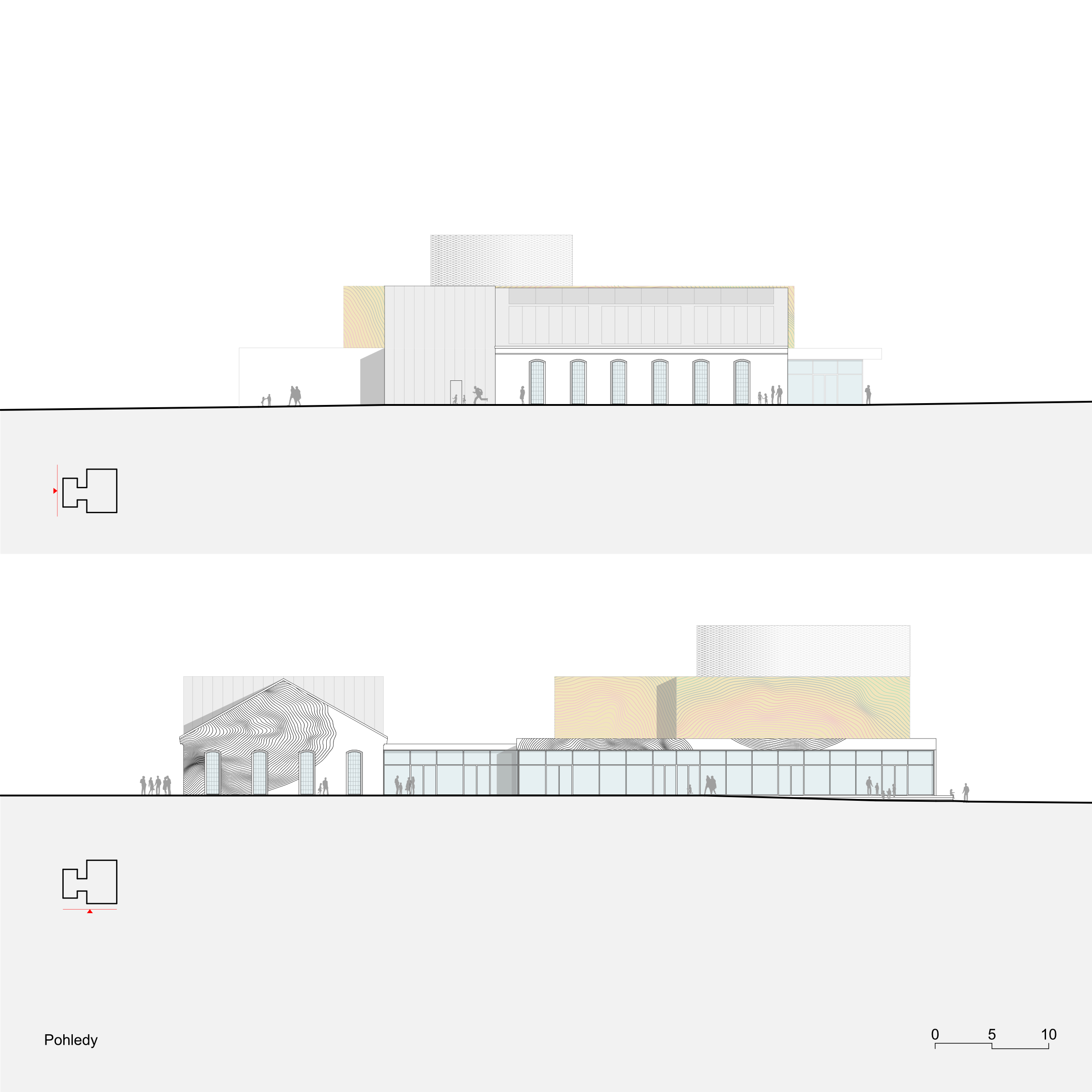 Považujeme parkový charakter území za silný motiv a potvrzujeme jej spolu s prostupností, přehledností a novými druhy prostředí pro více generací. Spojnici Svitavské a Jiráskovy ulice povyšujeme z obslužné komunikace a pěší spojky na pěší korzo, které propojuje všechny stávající i nové veřejné budovy. Z původní továrny využíváme starou halu pro knihovnu a litinové sloupy pro venkovní amfiteátr. Motiv textilu/hedvábí používáme pro hlavní poznávací znamení nového kulturního centra na fasádě i v interiéru. Veřejné prostory jsou v přízemí, což umožňuje bezbariérovost a velkou variabilitu jejich propojování a rozšíření i do exteriéru. Horizontální vrstvení objektu je vstřícné k okolní zástavbě a vhodně reprezentativní. Blyštivá koruna jeviště ukazuje význam nové instituce města.