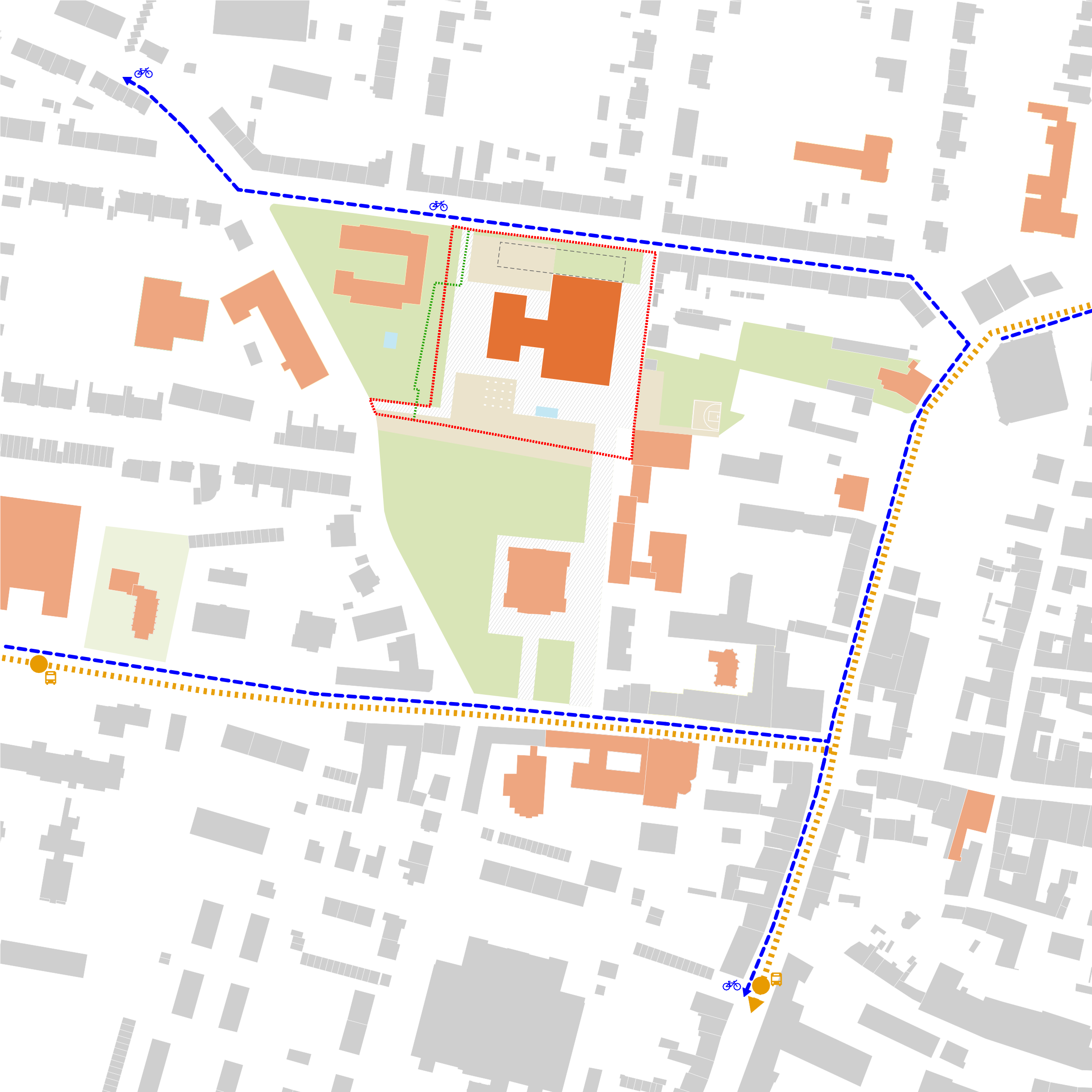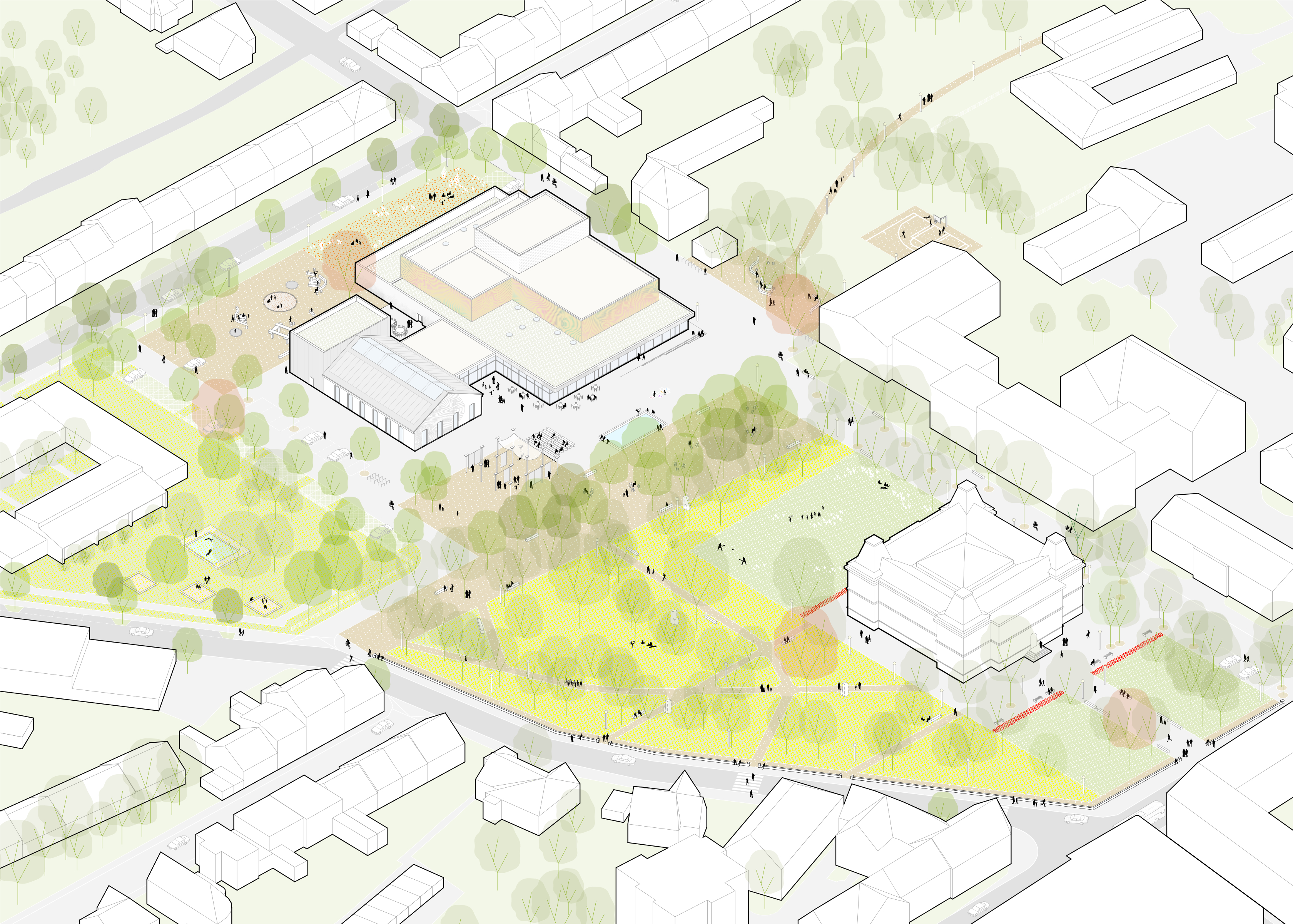 Doplňujeme průchodnost a příjemnost parku mlatovým korzem, stromy, obvodovou zídkou na sezení a vodním prvkem. Podporujeme scelení území solitérními stromy. Potřebná parkovací stání ukrýváme v zeleni. Scelujeme pozemek mateřské školy. Nabízíme více variant etapizace včetně rezervy pro městské nájemní bydlení a umožňujeme různé scénáře vývoje území.