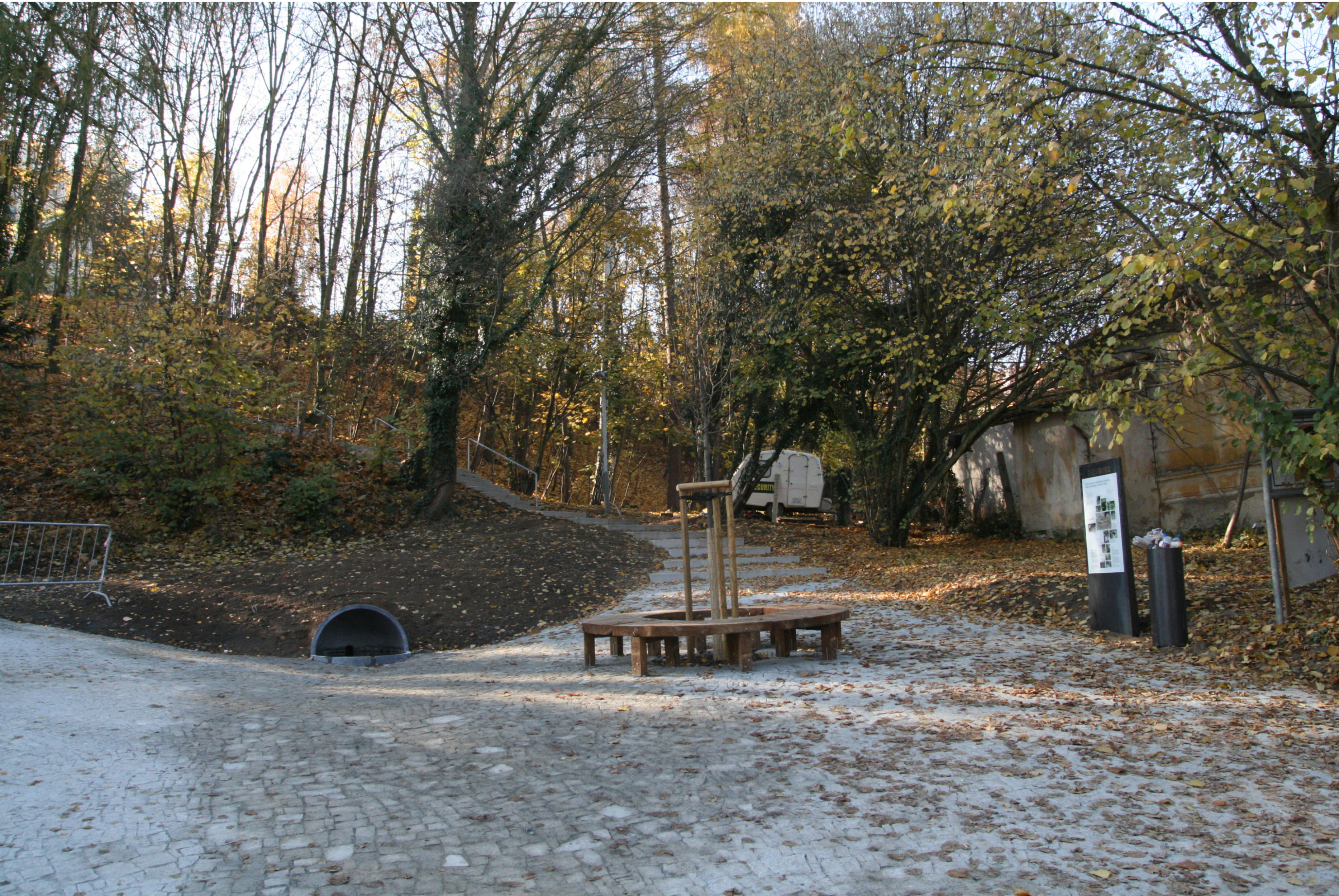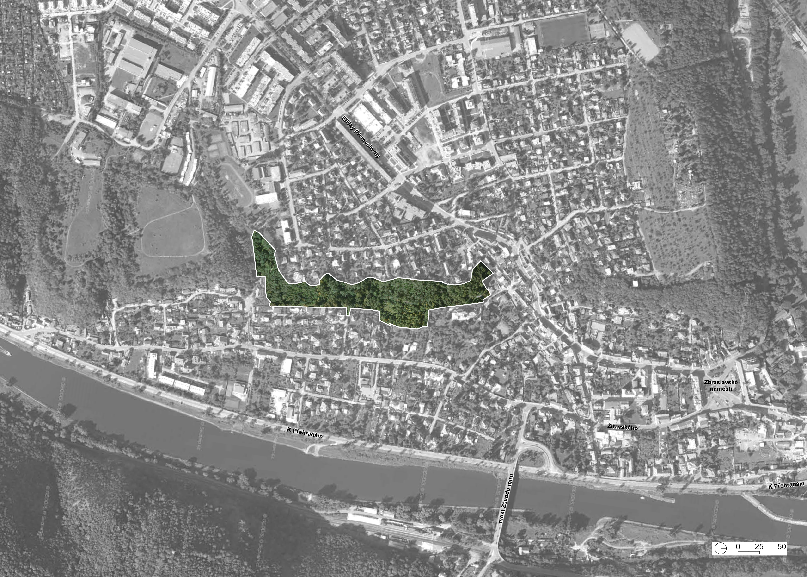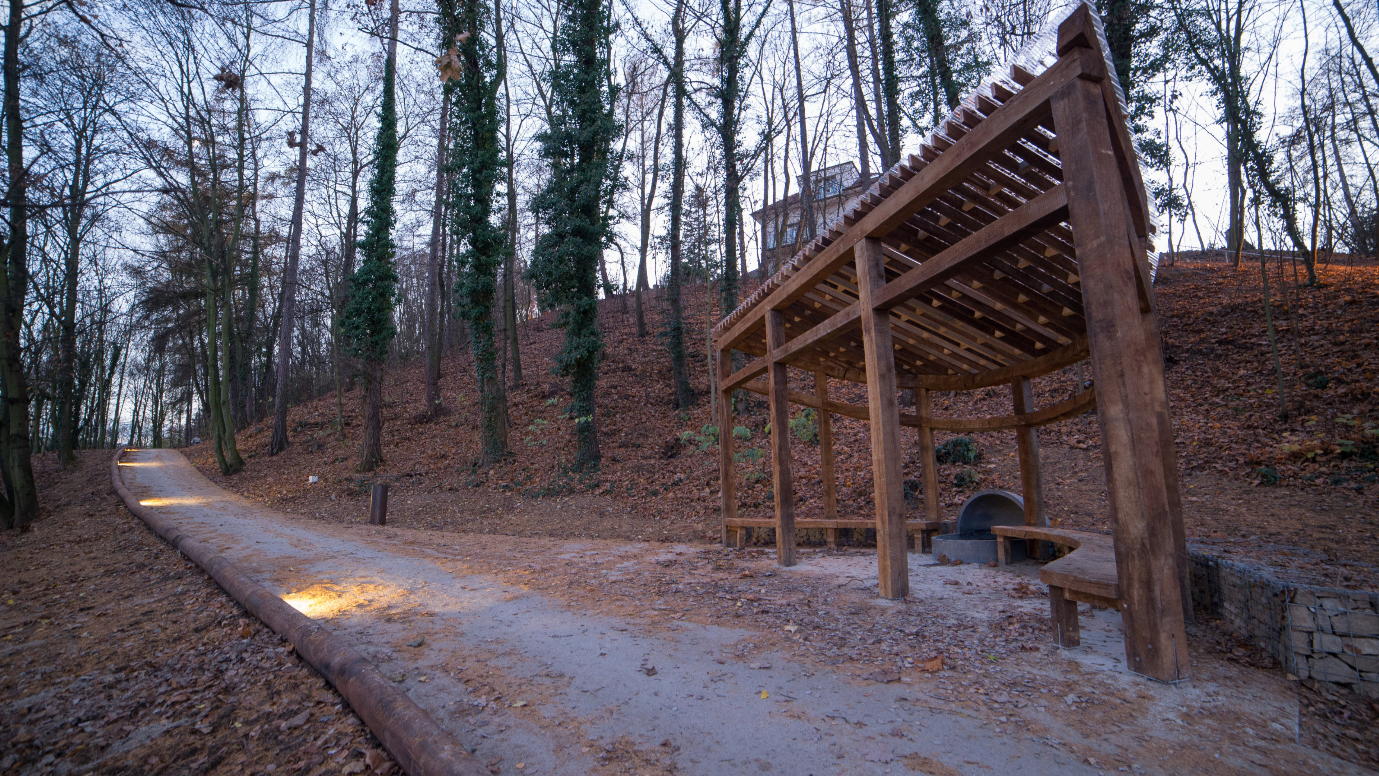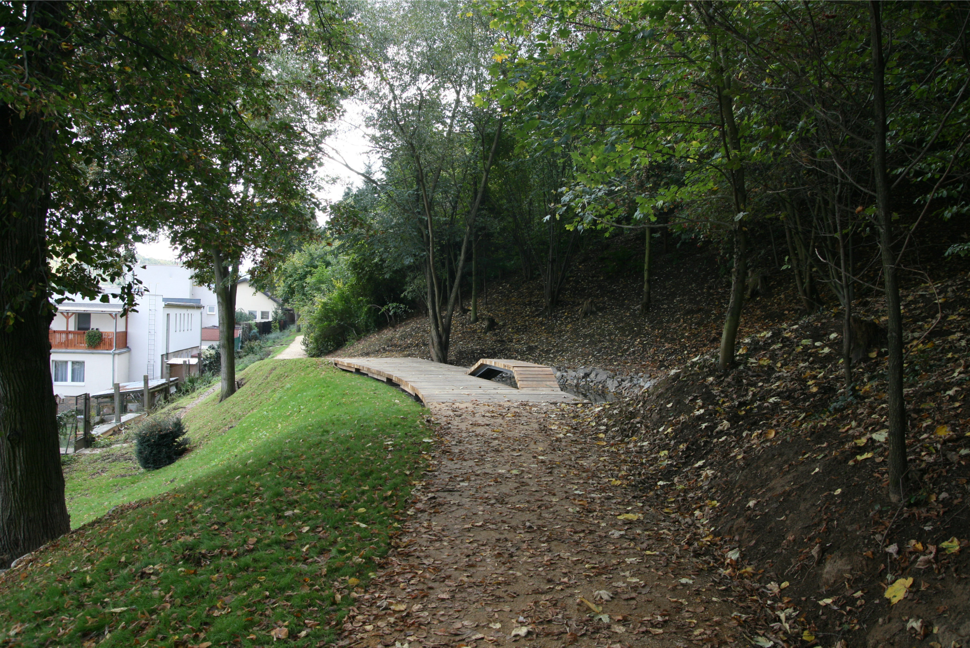 The Belveder Forest Park is green wedge of wild nature embedded in a small residential district on the outskirts of Prague. Its character balances on the border between authentic nature and urban greenery. Here you can run in to a cyclist, a gentleman with a dog, a pair of lovers, but also a roe deer or a wild boar. It's dramatic morphology makes it a natural barrier, that divides the residential district in two separate parts. The main aim of the revitalization of forest park was therefore to improve it's accessability and to expand the range of leisure outdoor activities. The residential area itself is seamingly surrounded by nature, but it is unfortunately difficult to access due to the massive traffic infrastructure.