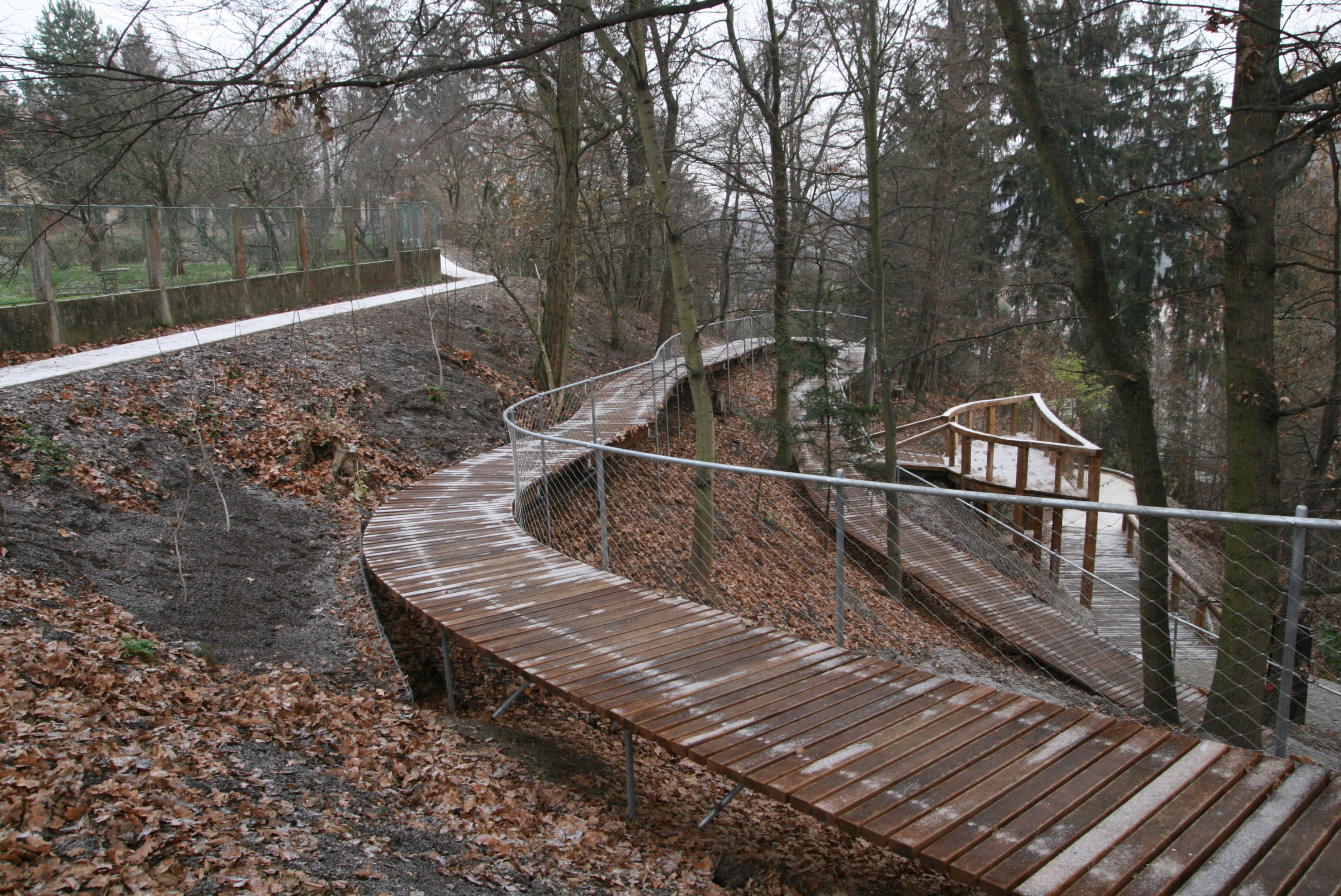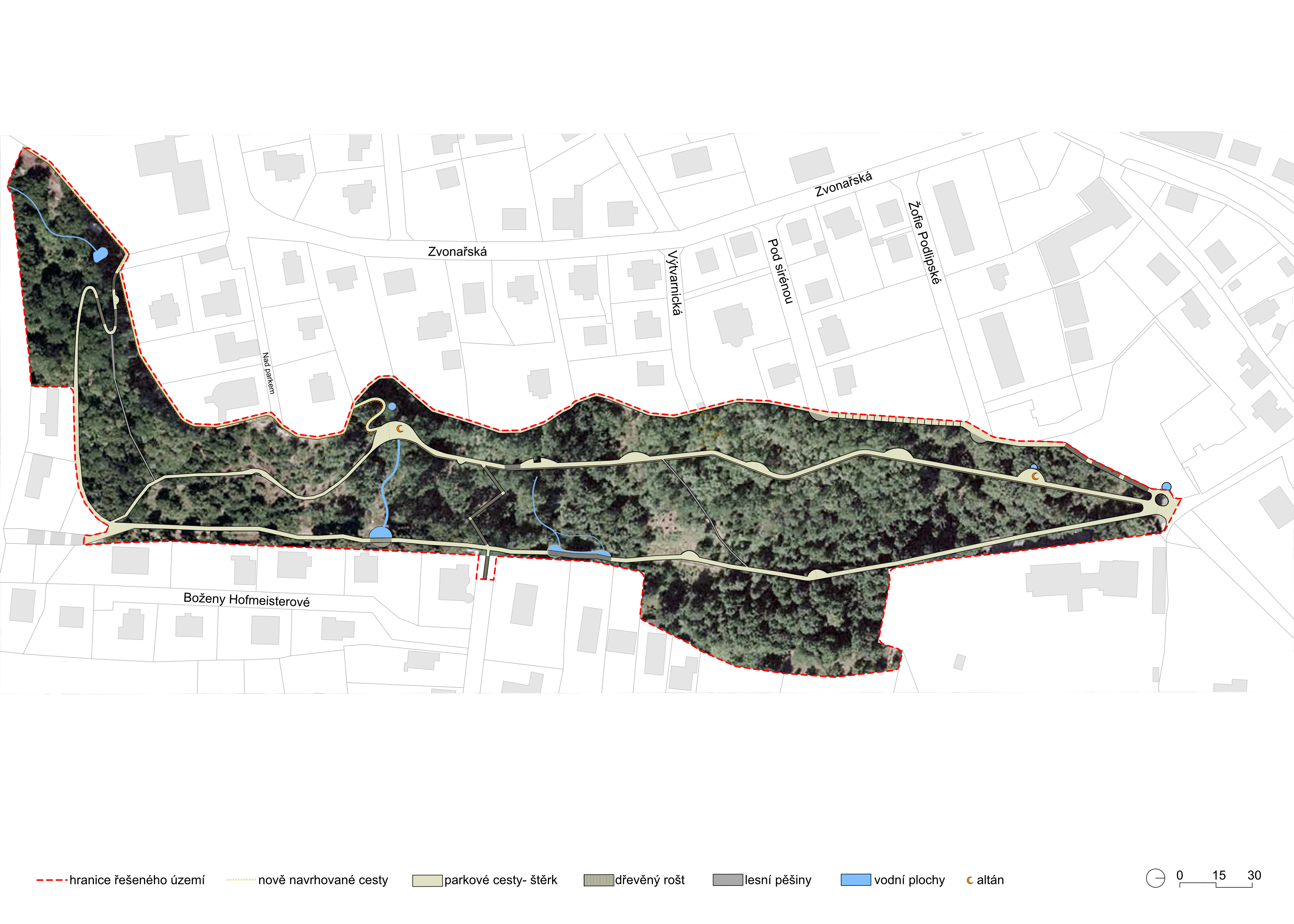 The principal intention was to make the dramatically shaped landscape of the forest park better connected to the surrounding streets and enriched with places where people would like to spend their leisure time. The proposal is a attempt to answers the question: "What to do with a long-neglected park that nobody needs and nobody goes to?" The design of the planting and maintenance plan for the greenery was the integral part of the proposal. Given the size of the area, its current "wild" state and limited investment funds, the maintanance plan was divided into phases that could be implemented gradually according to the financial framework. Furthermore, the decision to concentrate on transformation of the nodal points and to leave most of the area in a natural "wilderness" with low maintenance was essential for keeping park's athmosfere naturally authentic.