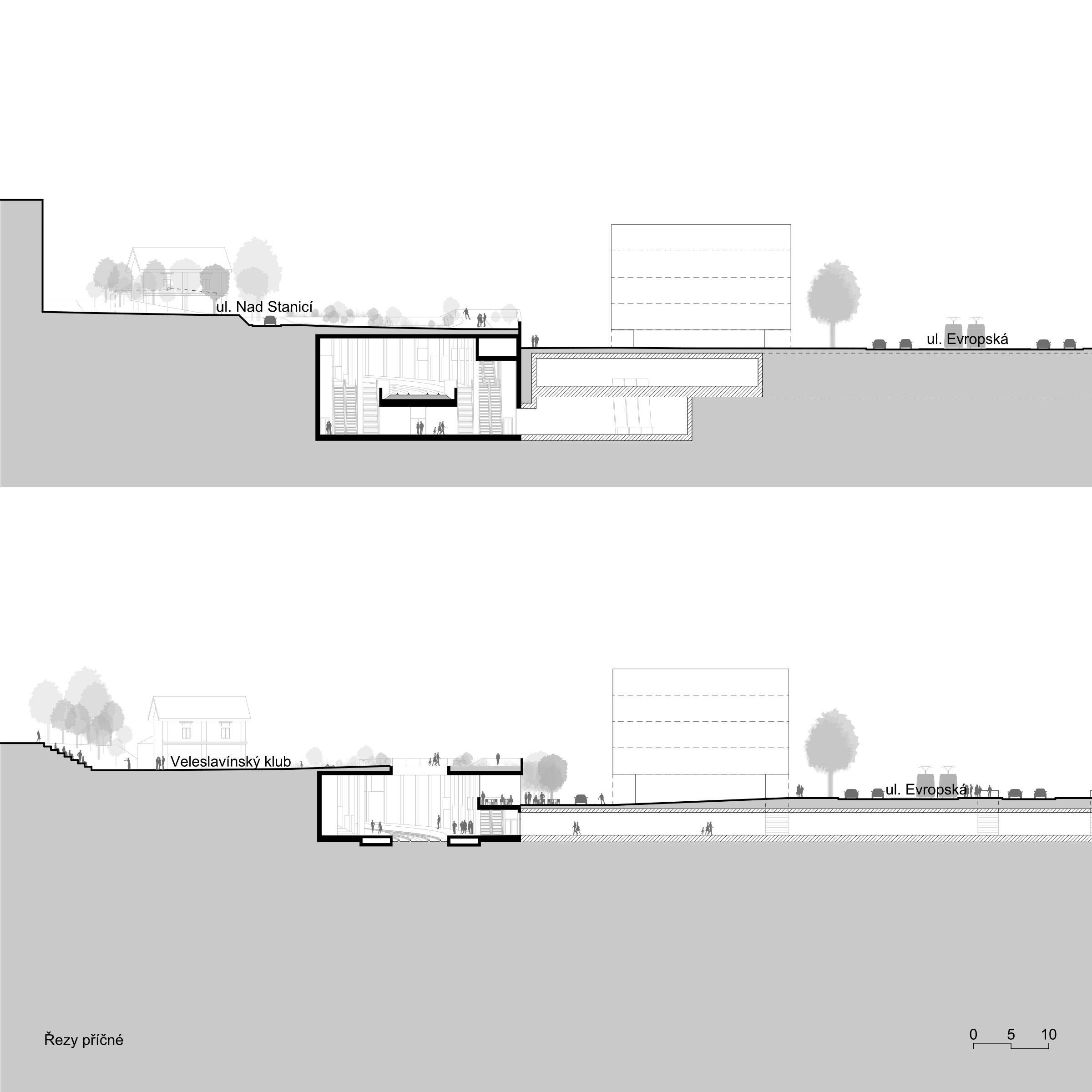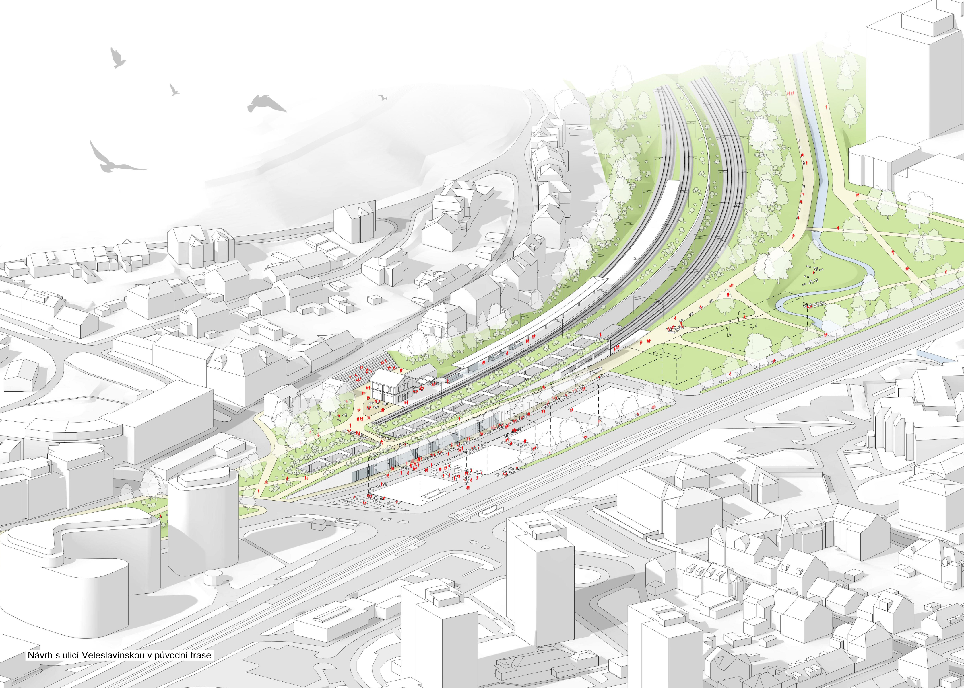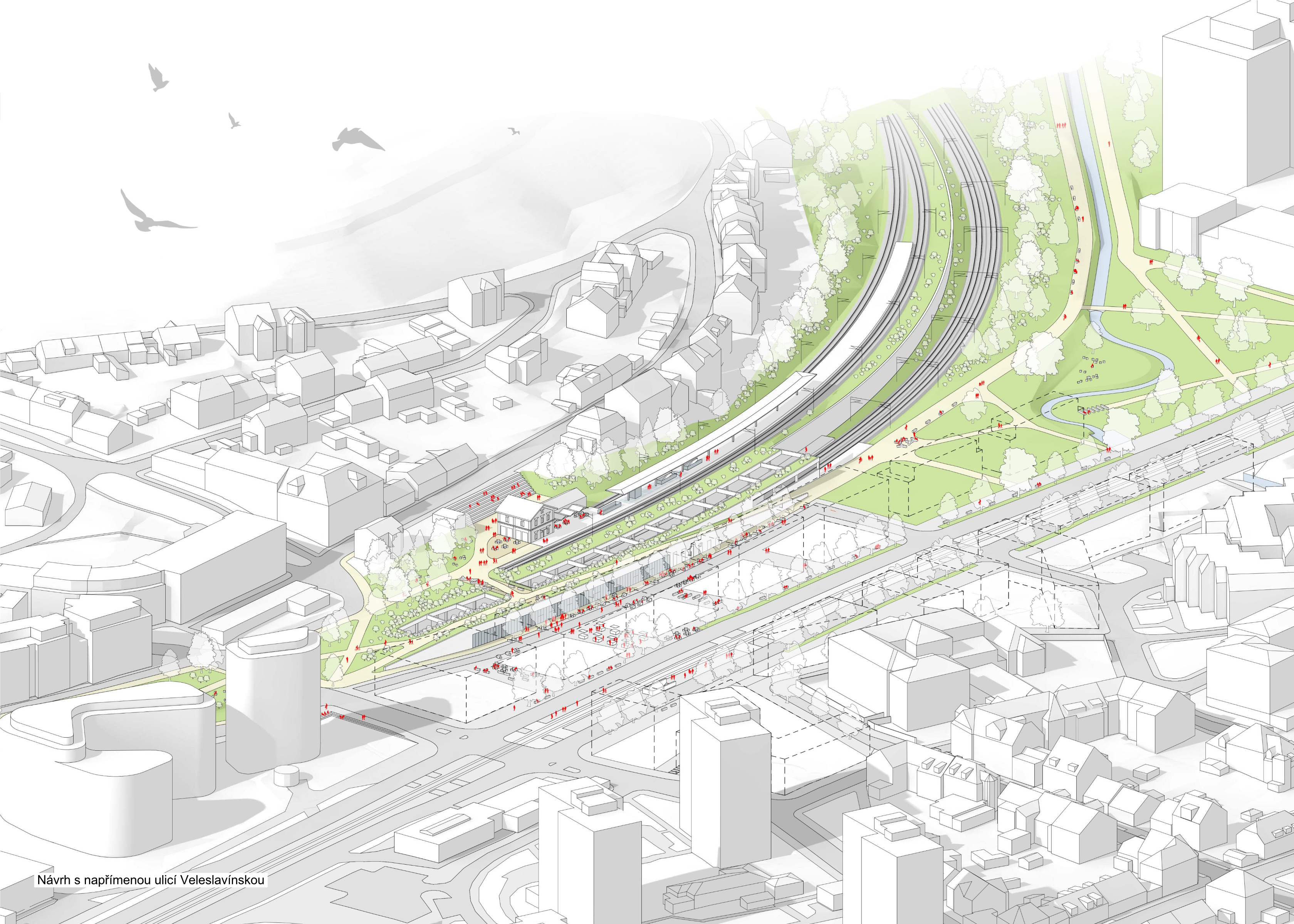 We propose the Veleslavín railway station as a functional and sensitive complement to the newly proposed urban development at the junction of three locations Vokovice, Veleslavín and Starý Veleslavín. We are redefining the entire wider area in urban terms. The area around Evropska Street in this area currently suffers from the gradual congestion of urban space due to the steadily increasing demands of all modes of transport. Until 10 years ago, fragments of the original settlement structure were still visible here, but they have almost disappeared as a result of the emerging public transport hub. The change in the character of the built-up area has brought a number of negative aspects to the area. The aim of the proposal is to heal the scarred urban fabric here, to enable the town to develop in a predictable quality and to reduce the negative impacts of the transit interchange to an acceptable level.
