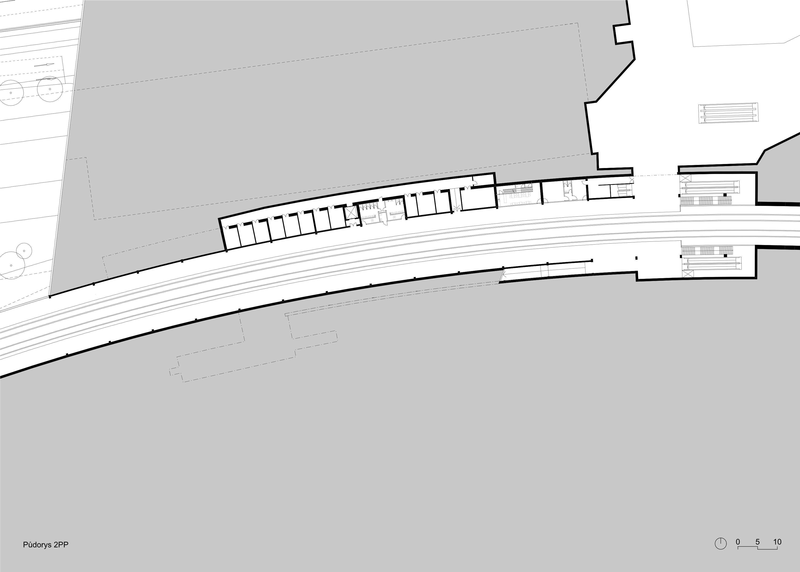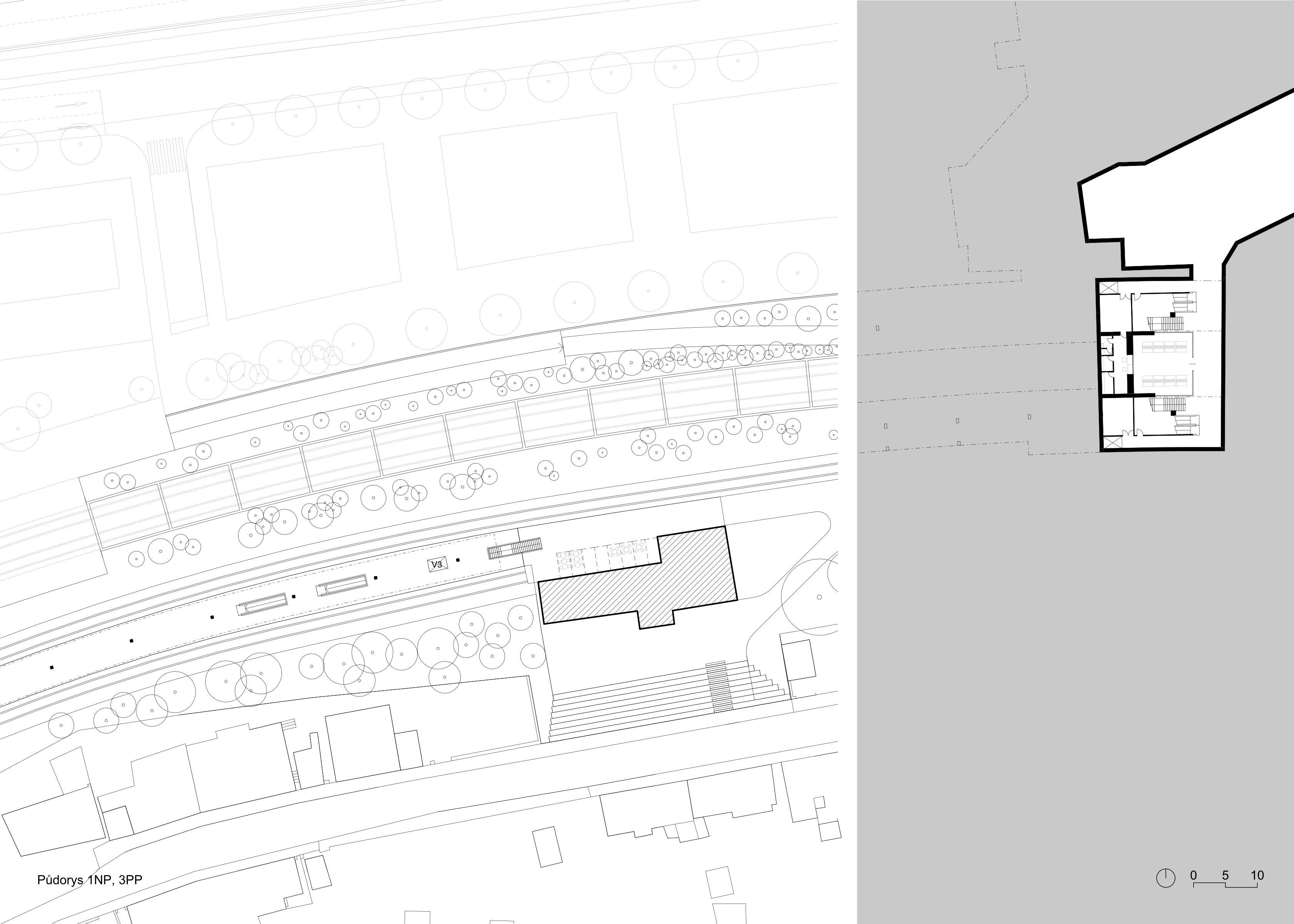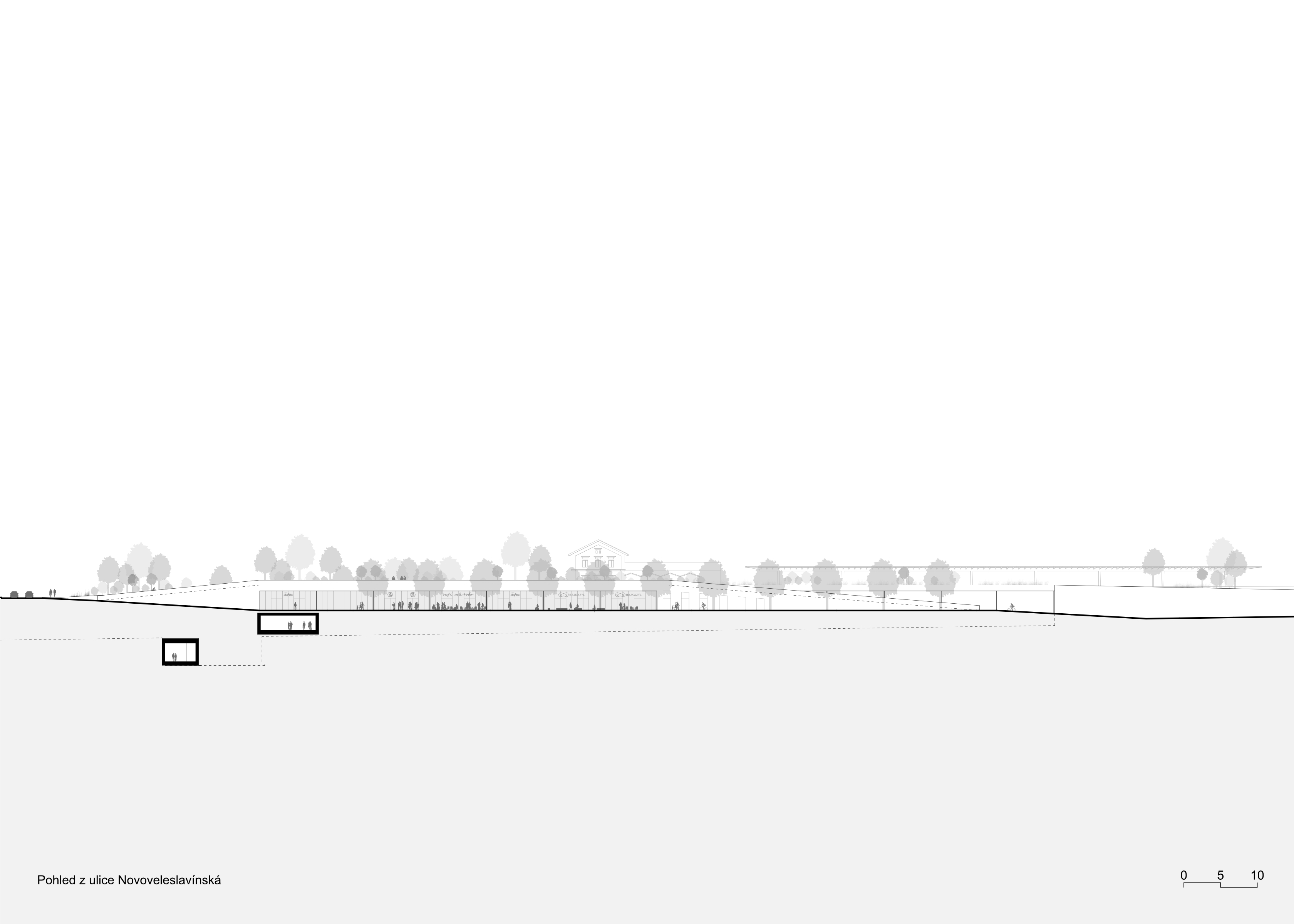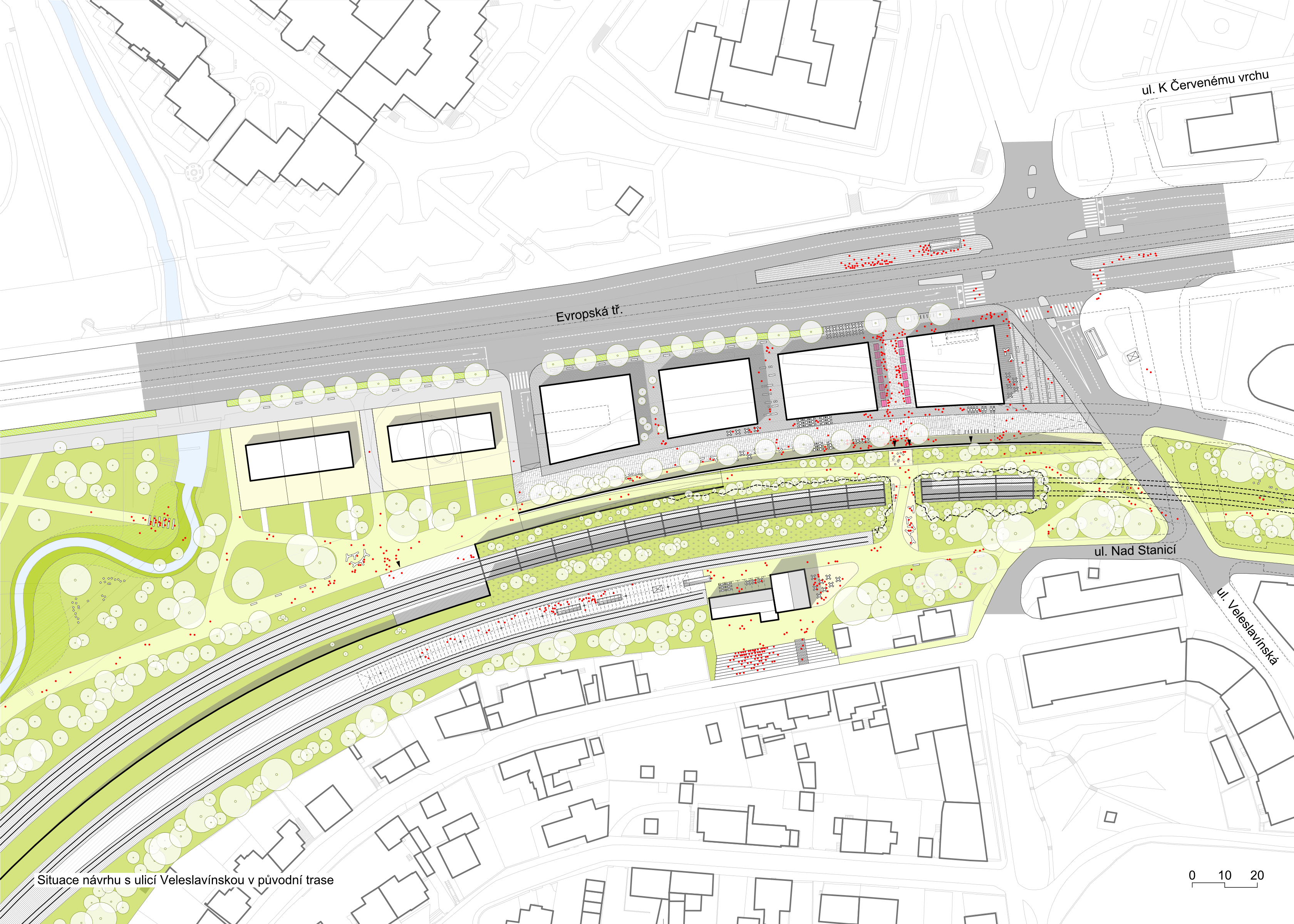 We propose the Veleslavín railway station as a functional and sensitive complement to the newly proposed urban development at the junction of three locations Vokovice, Veleslavín and Starý Veleslavín. We are redefining the entire wider area in urban terms. The area around Evropska Street in this area currently suffers from the gradual congestion of urban space due to the steadily increasing demands of all modes of transport. Until 10 years ago, fragments of the original settlement structure were still visible here, but they have almost disappeared as a result of the emerging public transport hub. The change in the character of the built-up area has brought a number of negative aspects to the area. The aim of the proposal is to heal the scarred urban fabric here, to enable the town to develop in a predictable quality and to reduce the negative impacts of the transit interchange to an acceptable level.
