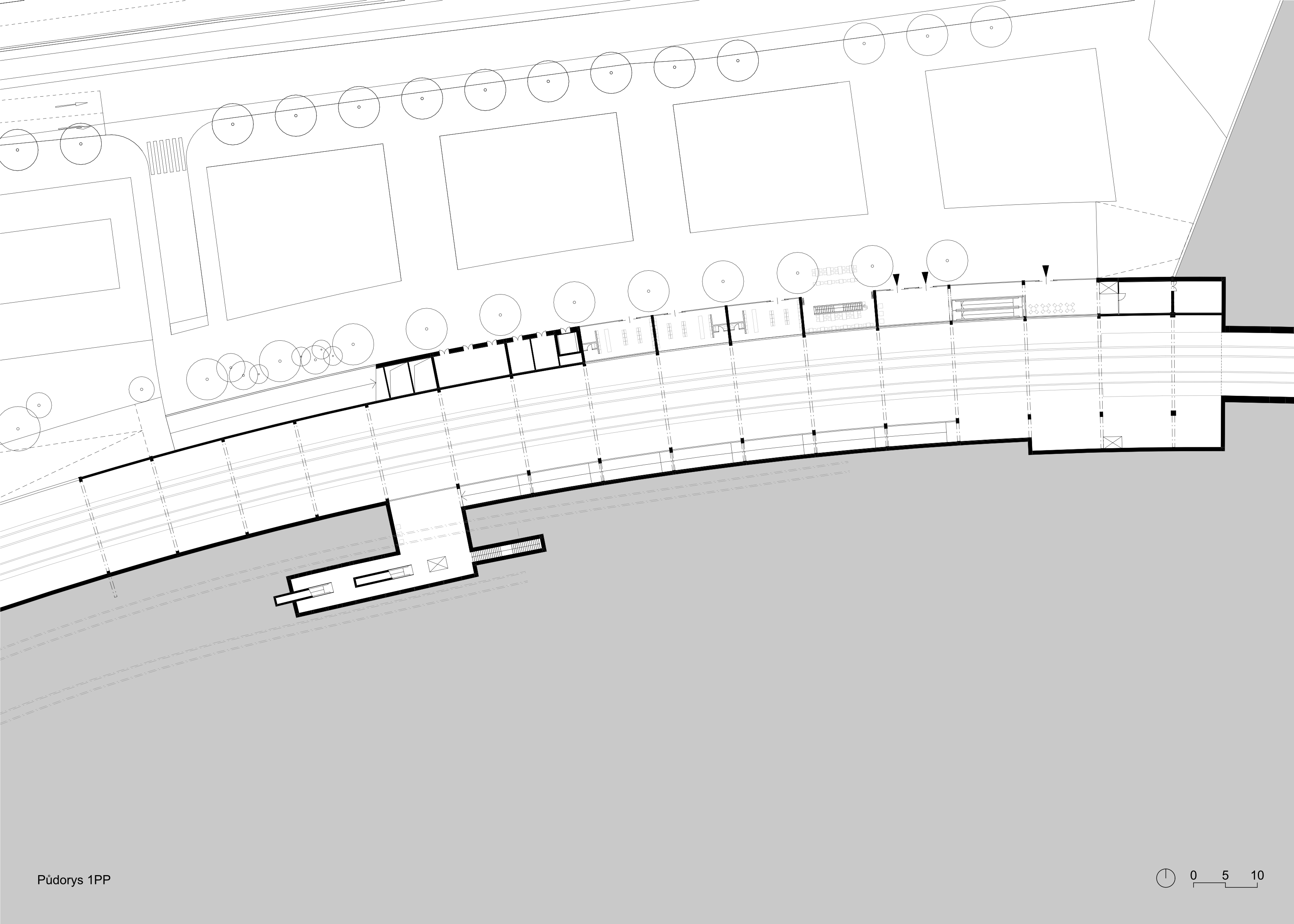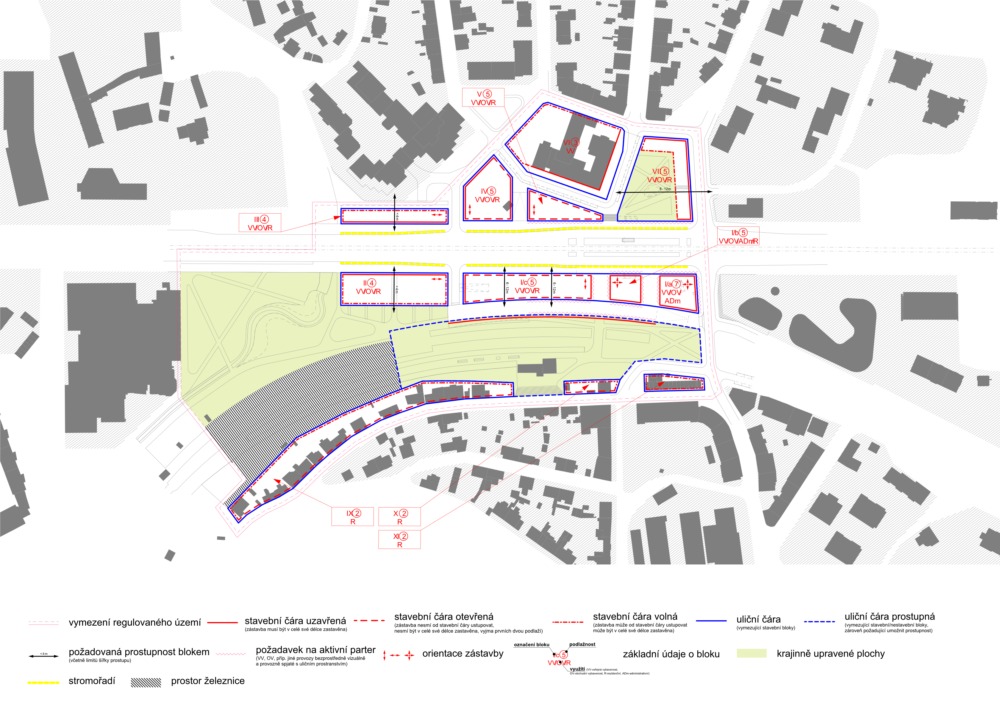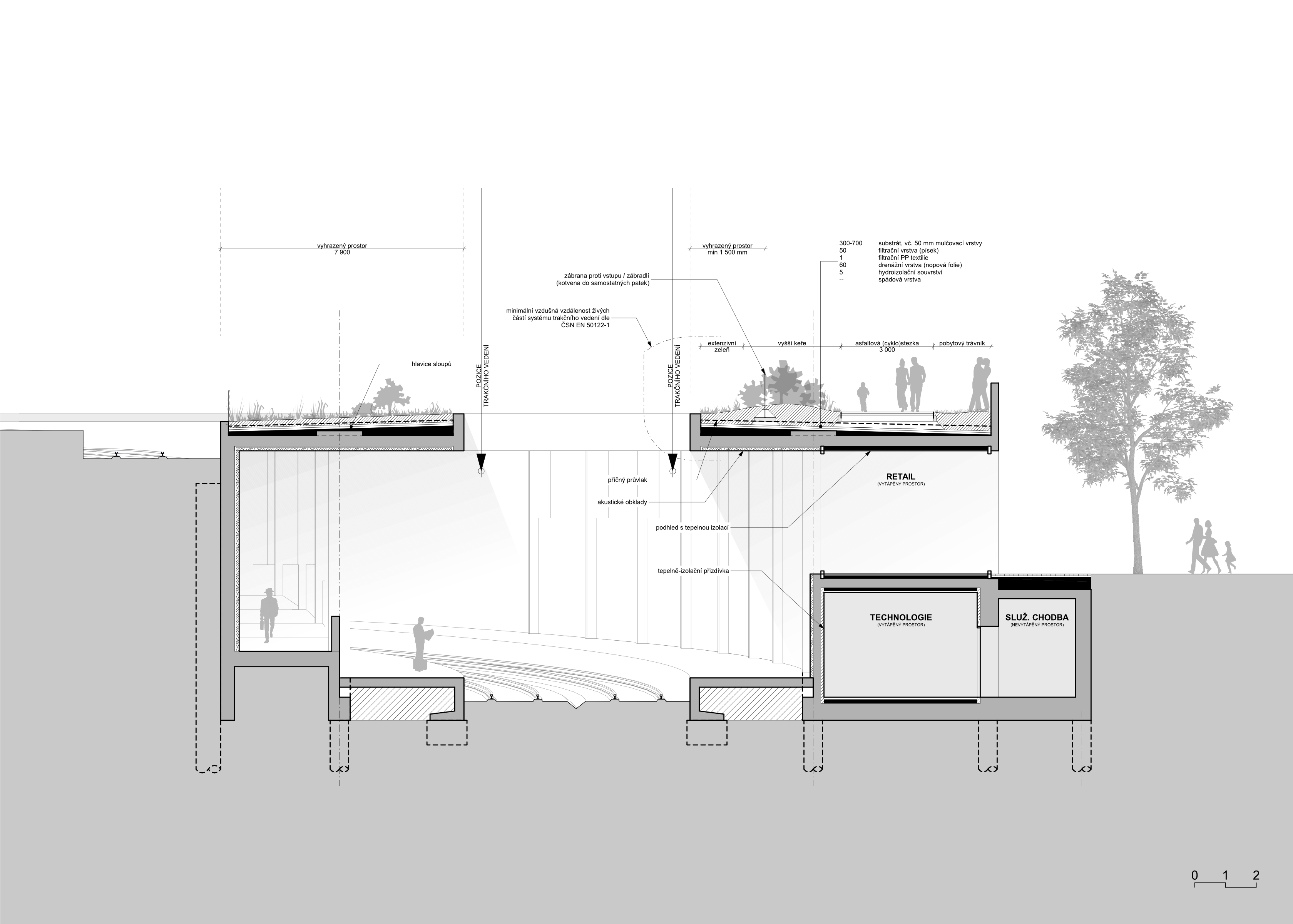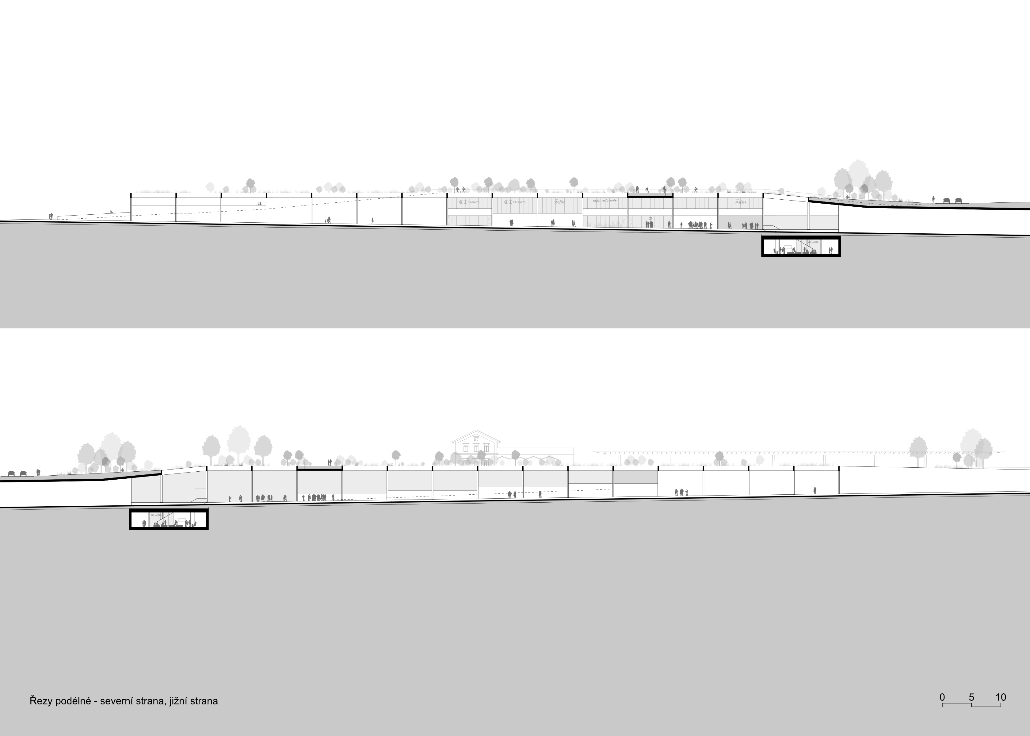 Interventions in the area will significantly affect the wider links to Prague 6 and beyond. The area is currently used for transit by a large number of people whose destinations are at Václav Havel Airport, in the Central Bohemia region or in residential areas in the north-western corner of Prague. The transit movements will largely move underground as a result of the modernisation of the railway line and its connection to the metro stations, but the planned construction of residential areas in the vicinity will generate new clientele who will also use this public transport node in the urban parterre. In the design, we will also consider the intensive relationship of the new development to the local stabilised neighbourhoods. Today, between Veleslavín and Vokovice, there is a traffic artery with peripheral areas of traffic buildings that will have to be given back their life and substance. We are doing so with a new urban structure with a commercial parterre.