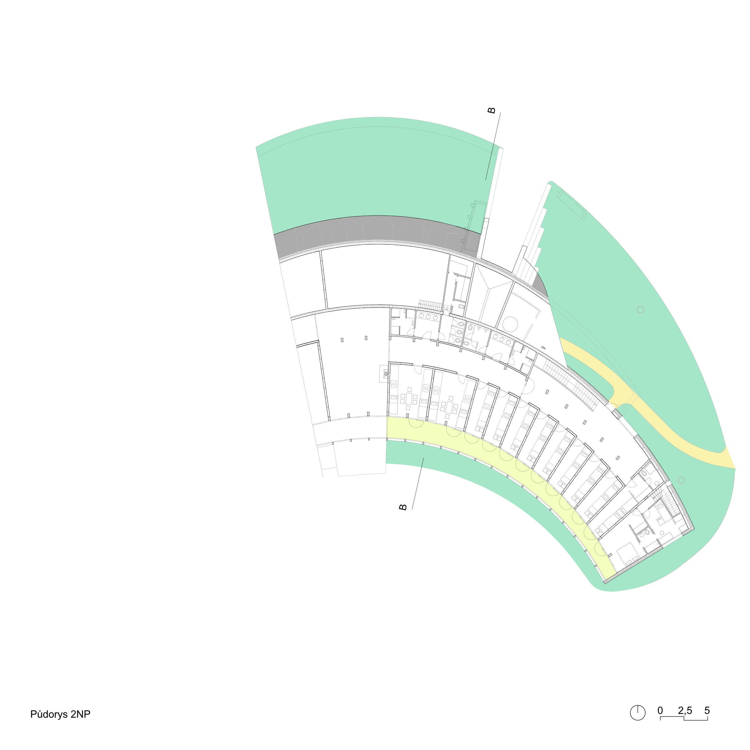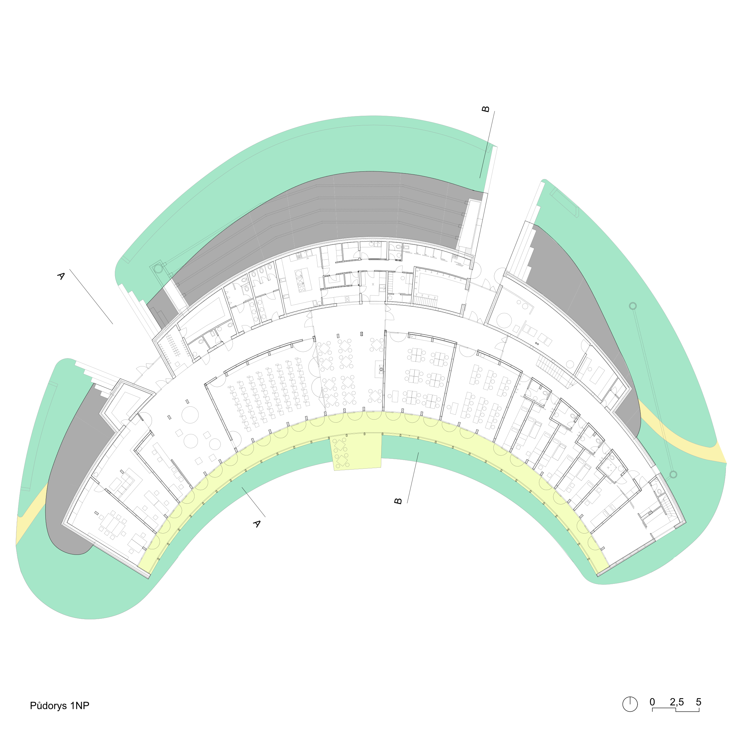 The building was conceived of as a curved, inhabitable land wave that fluidly blends into the surrounding terrain and symmetrically follows the North-South axis. The architectural design addresses southern orientation with a south-facing glass façade with movable sun shades. Two recessed entrances are situated at the north side. The eastern side of the building symbolically ascends from the ground plane to enhance the display of the southwestern sunlight. The earth-sheltered northern side of the building fluidly adjoins the building’s earth-covered roof, which gradually increases in height from west to east. A path from the main entrance over the “ridge” of the building to the “top” lookout point provides a unique view of the entire bio-center. The area between the building and the artificial mound in front of the southern façade is used as a living garden.