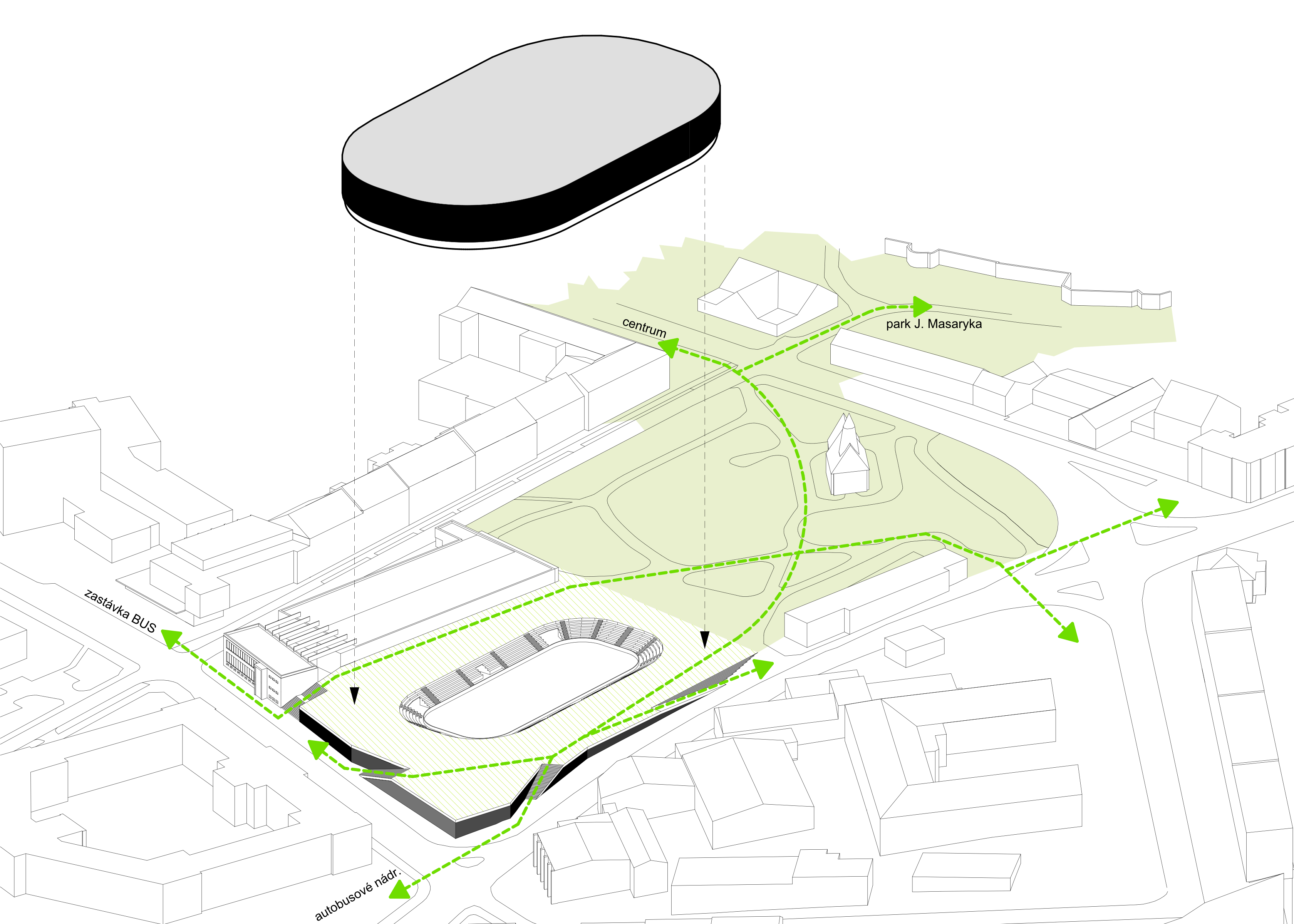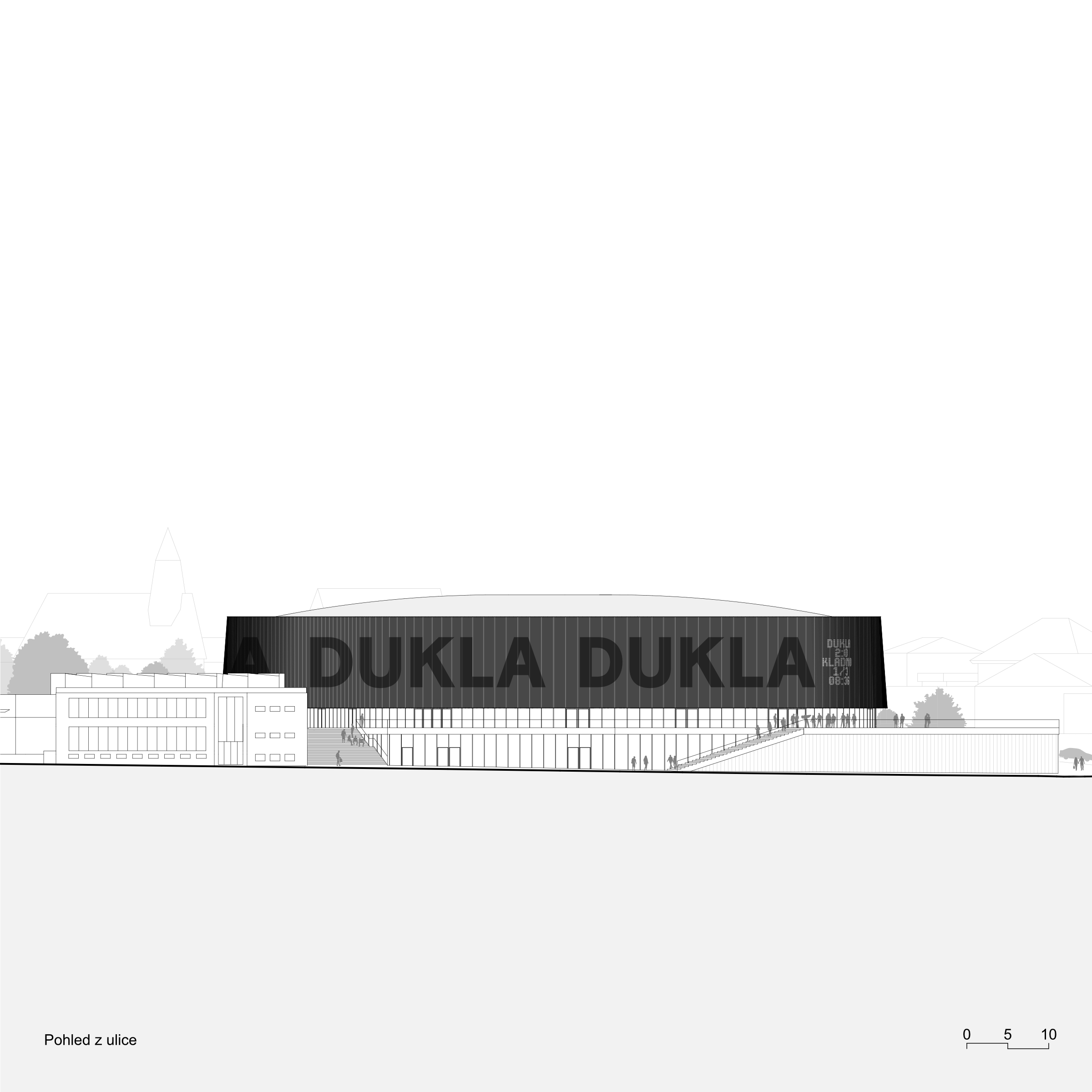 Do městského prostředí navrhujeme halu jako solitér. Město přirozeně proniká ze Smetanových sadů do ochozů haly a na tribuny arény. Dění v aréně se tak stává součástí života ve městě a vyvolává s ním interakci. Architektura haly je inspirována hokejovým pukem letícím nad ledovou plochou – přihrávka žabkou. Hala má jednolitý jemný obal s vylisovaným nápisem DUKLA. Prosklený parter zprostředkovává maximální vizuální komunikaci exteriéru s interiérem.
