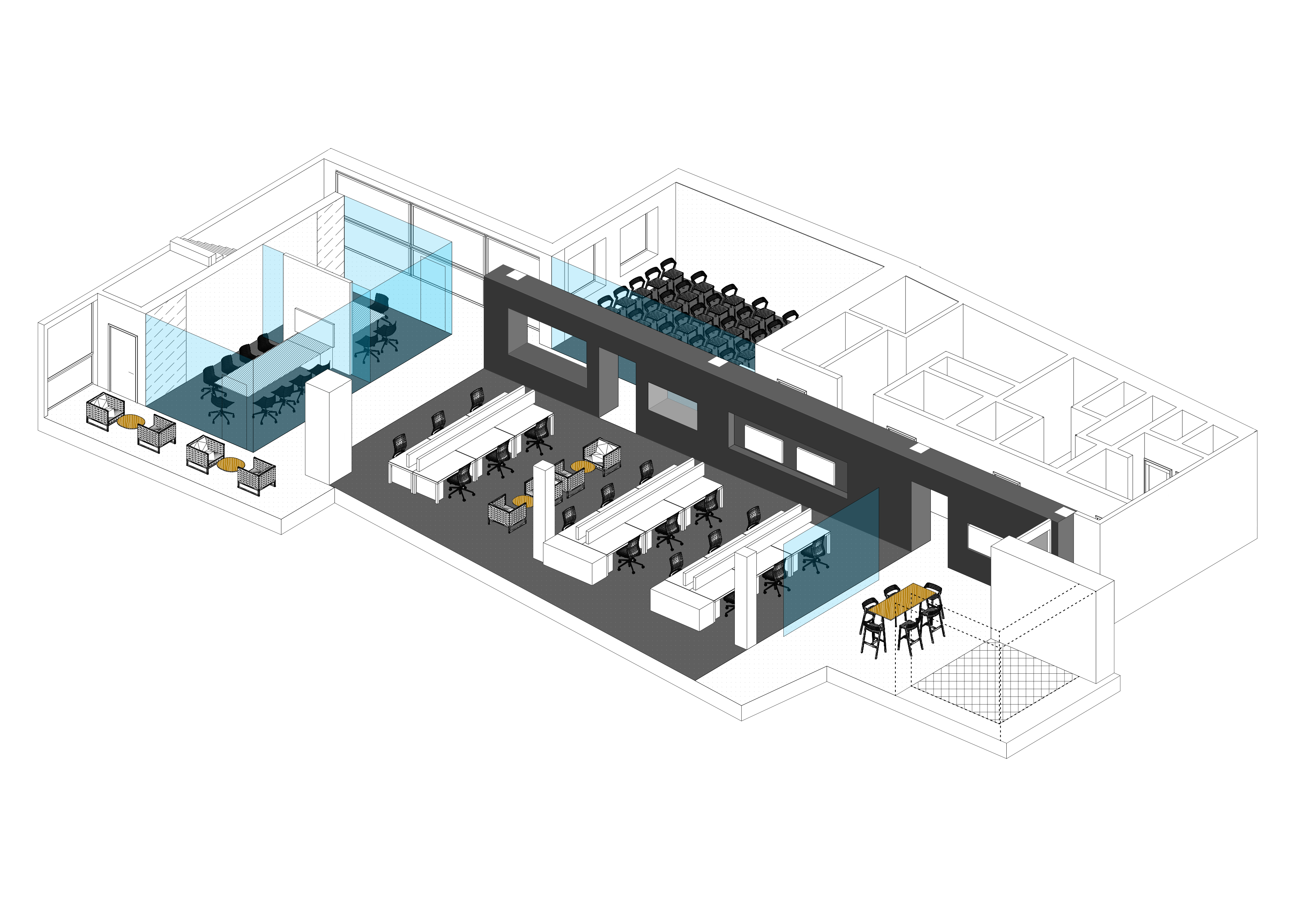 Interier byl navržen do již existující budovy z 90. let. Vytvořili jsme přehledný a velkorysý pocit již při vstupu do kanceláře. Hlavní dojmový účinek vyvolává samotné pracovní prostředí představené již od vstupu jako jeden velkorysý prostor. Za ním jsou viditelné meeting rooms a relax area. Část news a sales je opticky oddělena relaxačním sezením. Od velkorysého otevřeného prostoru jsou servisní místnosti oddělené hlavním vizuálním prvkem interiéru – dlouhou černou stěnou. V ní je inkorporováno akvárium, monitory, prostor pro kopírky a skladovací police. Za stěnou je druhý užší koridor, který vede od toalet, přes šatnu s laktační místností a kuchyňkou zaměstnanců k auditoriu. Zajímavý je průhled z pracovních míst do auditoria přes akvárium. Zasedací místnosti jsou od sebe oddělené stěnou s monitory. Jejich boční stěna kryje zadní schodiště. Na druhém podlaží je umístěna oddychová zóna s návazností na venkovní terasu s posezením v zeleni.