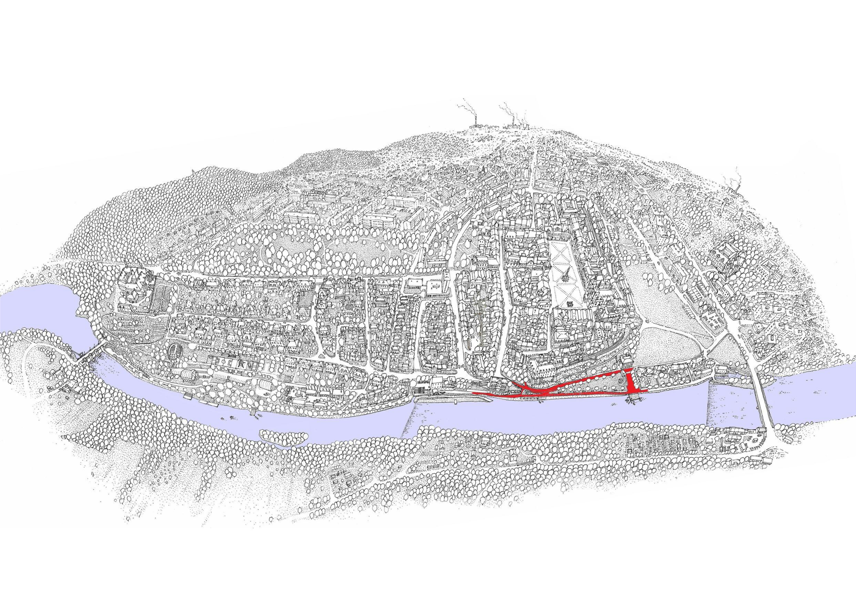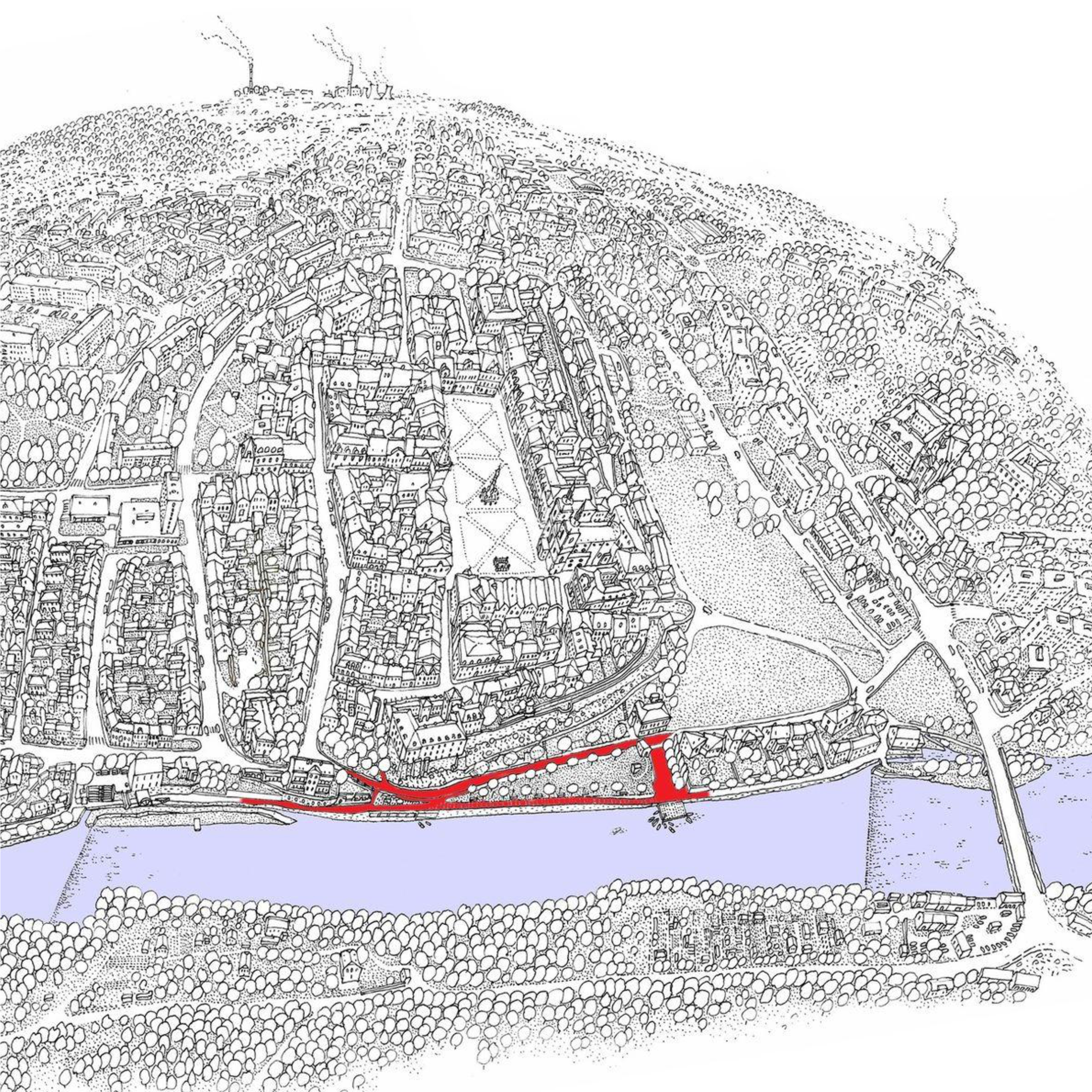V nejužší části území přímo pod hradem se již nacházela historická opěrná zeď, která asanaci přežila. Ta byla při revitalizaci zachována a vytvořila základ celého návrhu. Směrem po proudu byla doplněna a spojena s další nábřežní zdí nad jezem. Směrem proti proudu byla přemostěna novou konstrukcí a stala se boční stěnou nových prostor pod přemostěním nazvaných Zajícův převis. Tyto prostory nejen že umožňují přístup k řece, ale obsahují i veřejné toalety, letní občerstvení a půjčovnu loděk. Vlastní pěší promenáda na hraně nábřežní zdi propojuje celé území. Pod hradem je rozšířena do malého náměstíčka se schodištěm a vstupem dolů do Zajícova převisu. Dále pokračuje po proudu až k nově vybudovanému pobytovému molu a dále až k jezu. Mezi touto pěší cestou a ulicí Říční je kultivována městská pobytová louka, kde se konají open air koncerty. Parkoviště pod hradbami je záměrně rozdělené na více segmentů a ještě odstupňované povrchovou úpravou (kámen, mlat), aby auta nebyla v území výrazná. Skalnatá stráň pod městskými hradbami, nyní spásaná kozami, čeká na svoji úpravu včetně možnost doplnění zástavby v části jejích historických ploch před asanací.