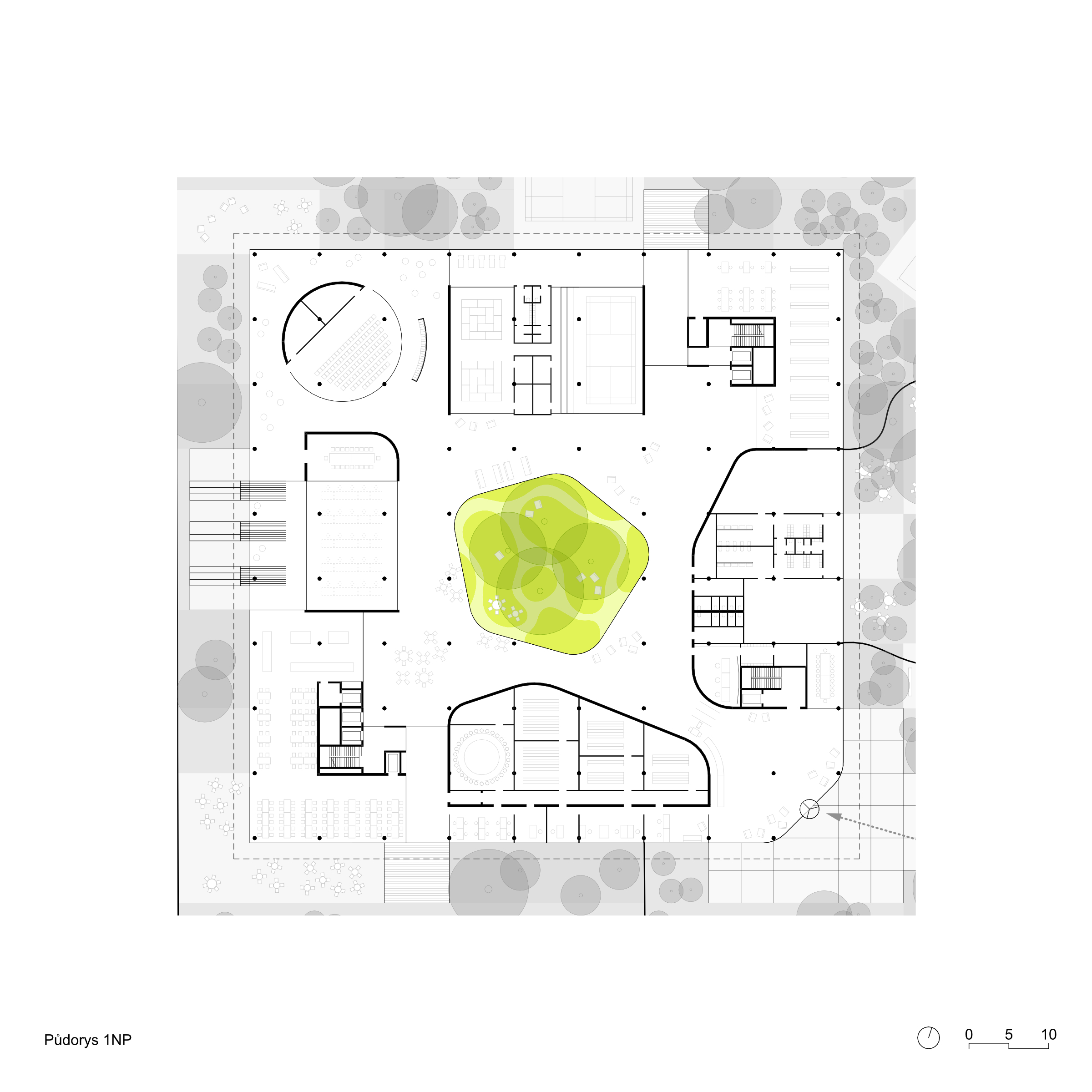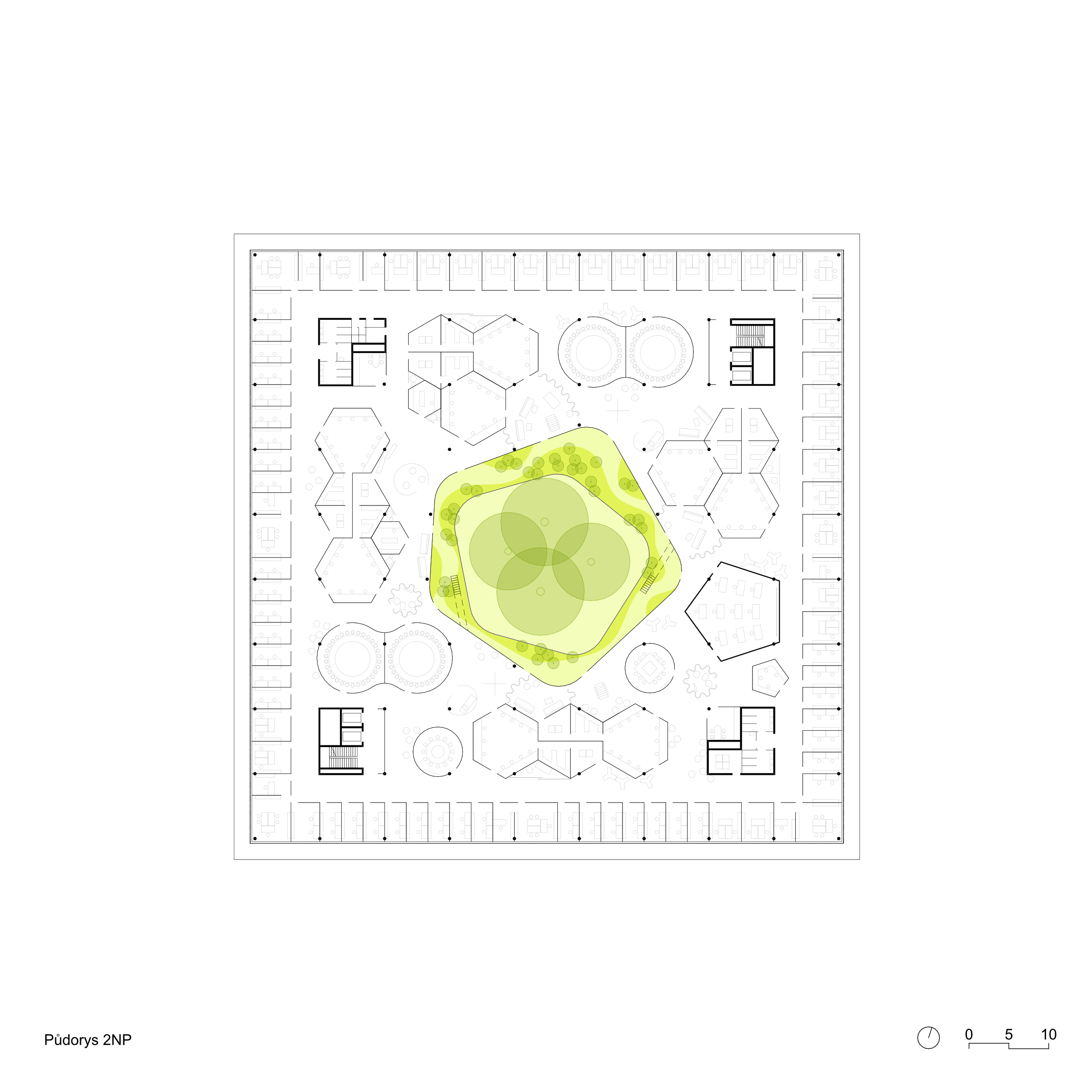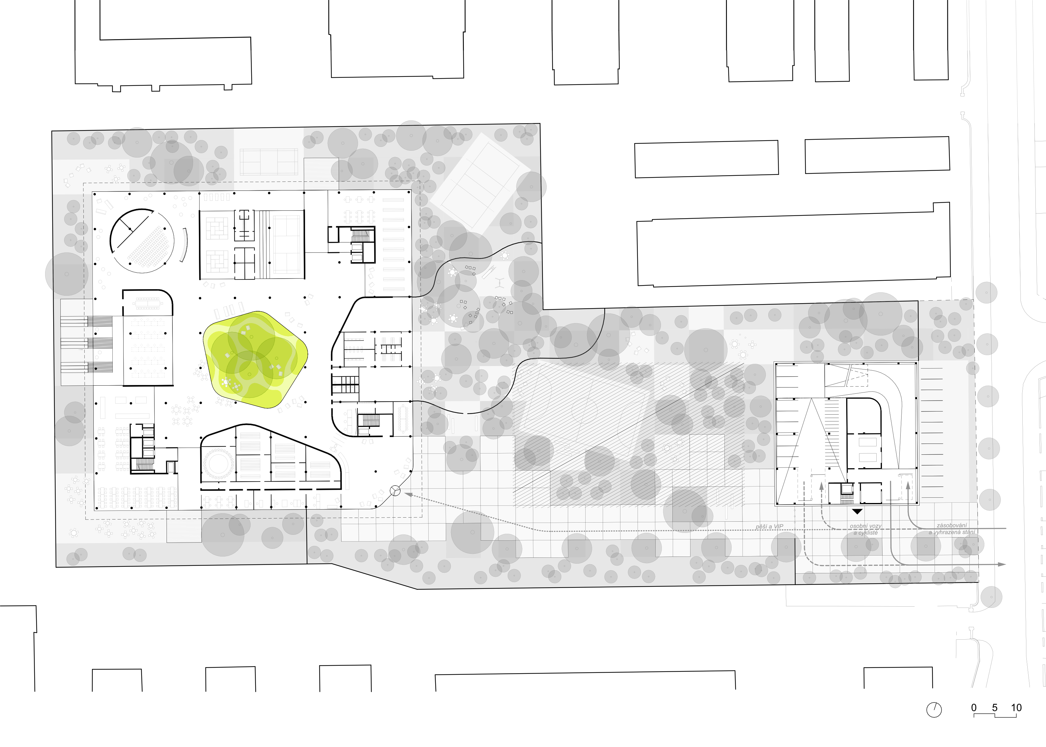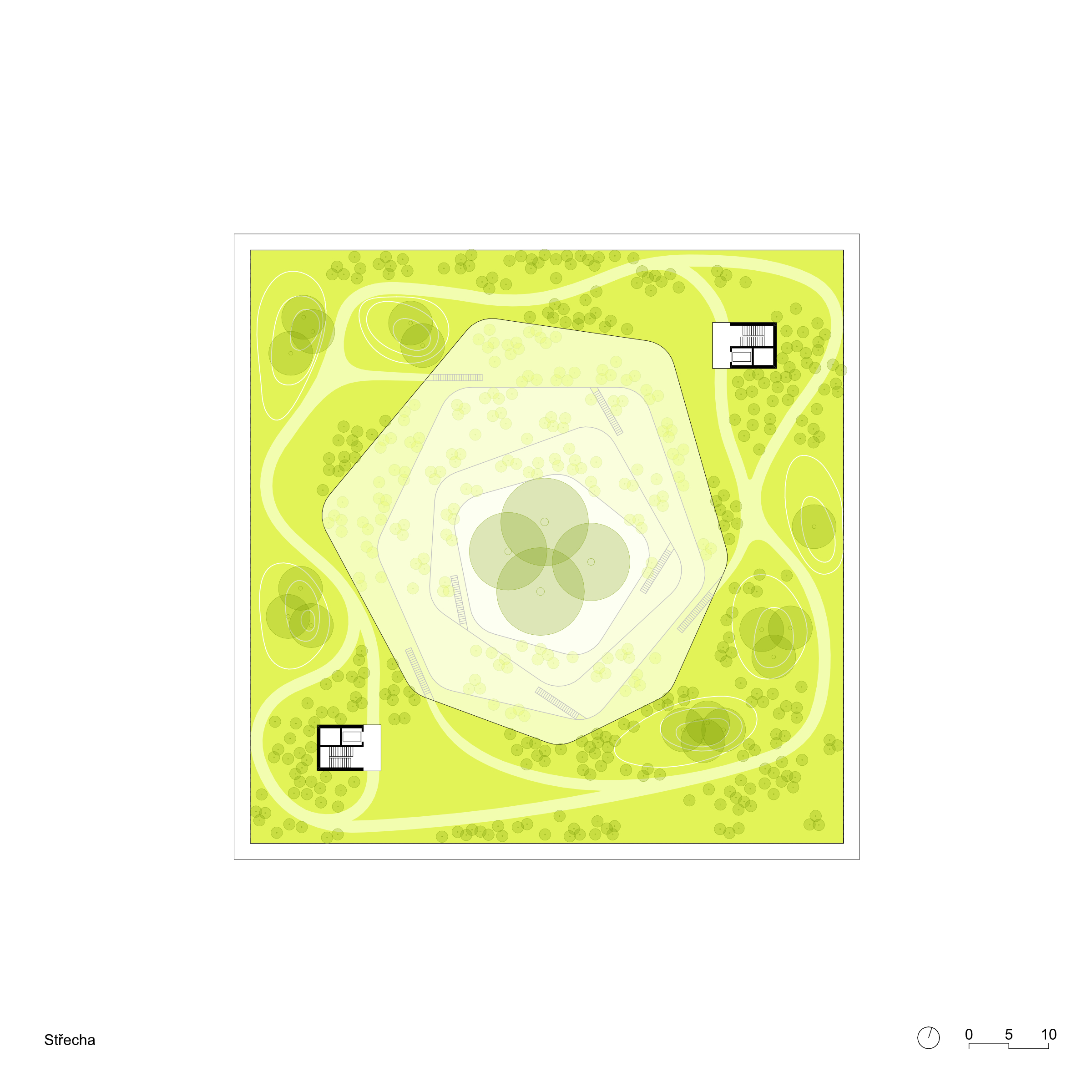 Koncept soutěžního návrhu nového sídla NÚKIB je založen na kontrastu organického v ortogonálním. Racionální uzavřená vnější forma objektu navazuje na inertní okolí a ukrývá v sobě tvarově bohaté a členité atrium. Okolo něj jsou seřazeny pracovní prostory pro požadované specifické funkce. Široká paleta pracovních míst od sdílených prostor, přes skupinové a specializované laboratoře, až po individuální pracovny pro soustředěnou činnost. Hlavní objekt je vnořen do hloubi aktuálně neprostupného areálu. Za hranicí pozemku od ulice Mathonovy je umístěn servisní parkovací a vjezdový objekt, ve kterém je realizována veškerá filtrace a monitoring vjezdů. Prostor mezi hlavní budovou a servisním objektem je rezervován pro budoucí rozšíření kapacity.
