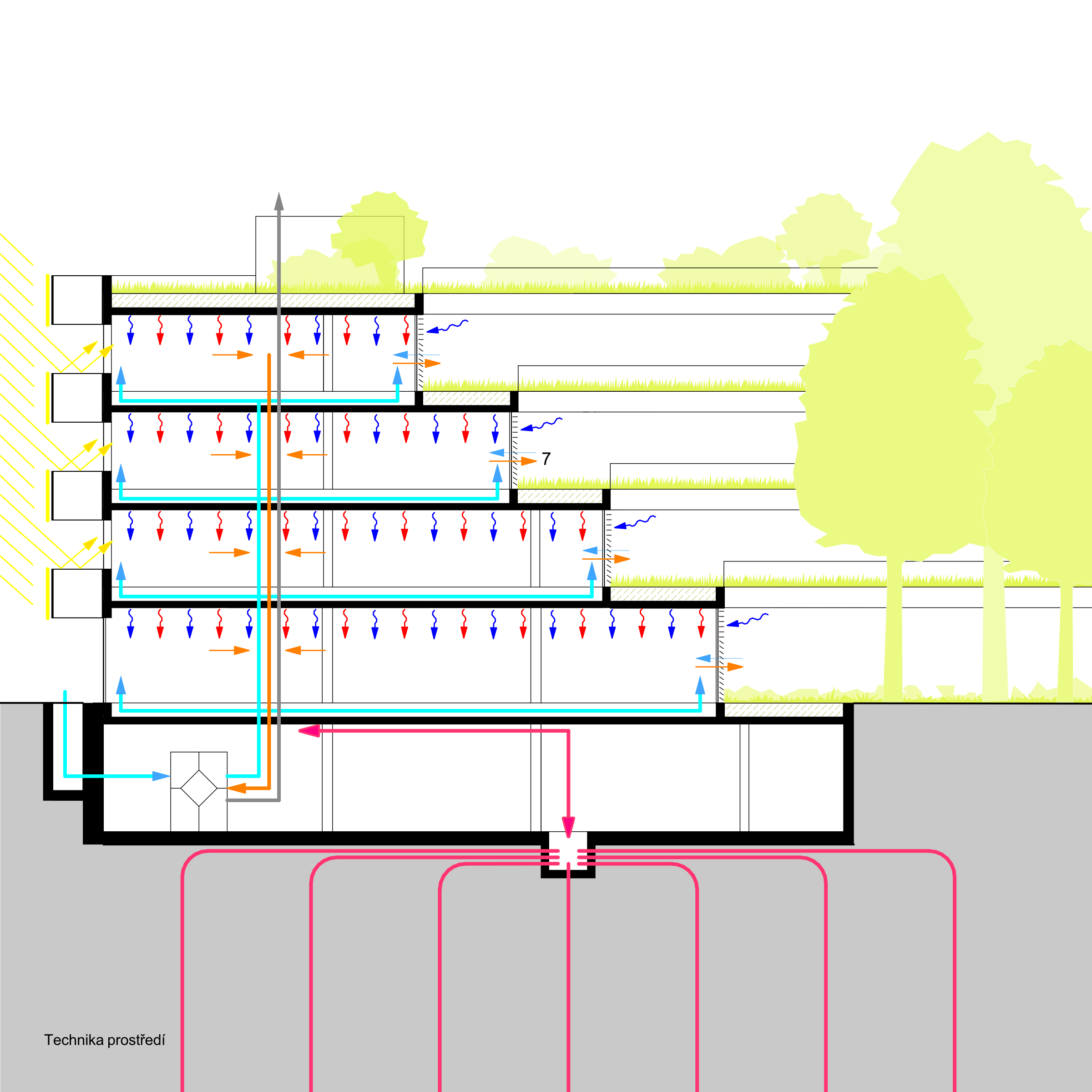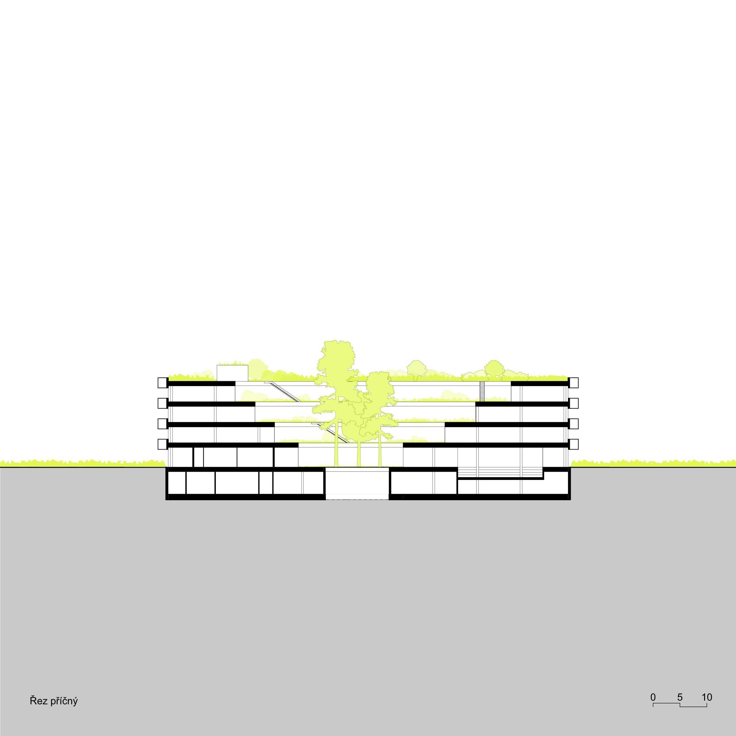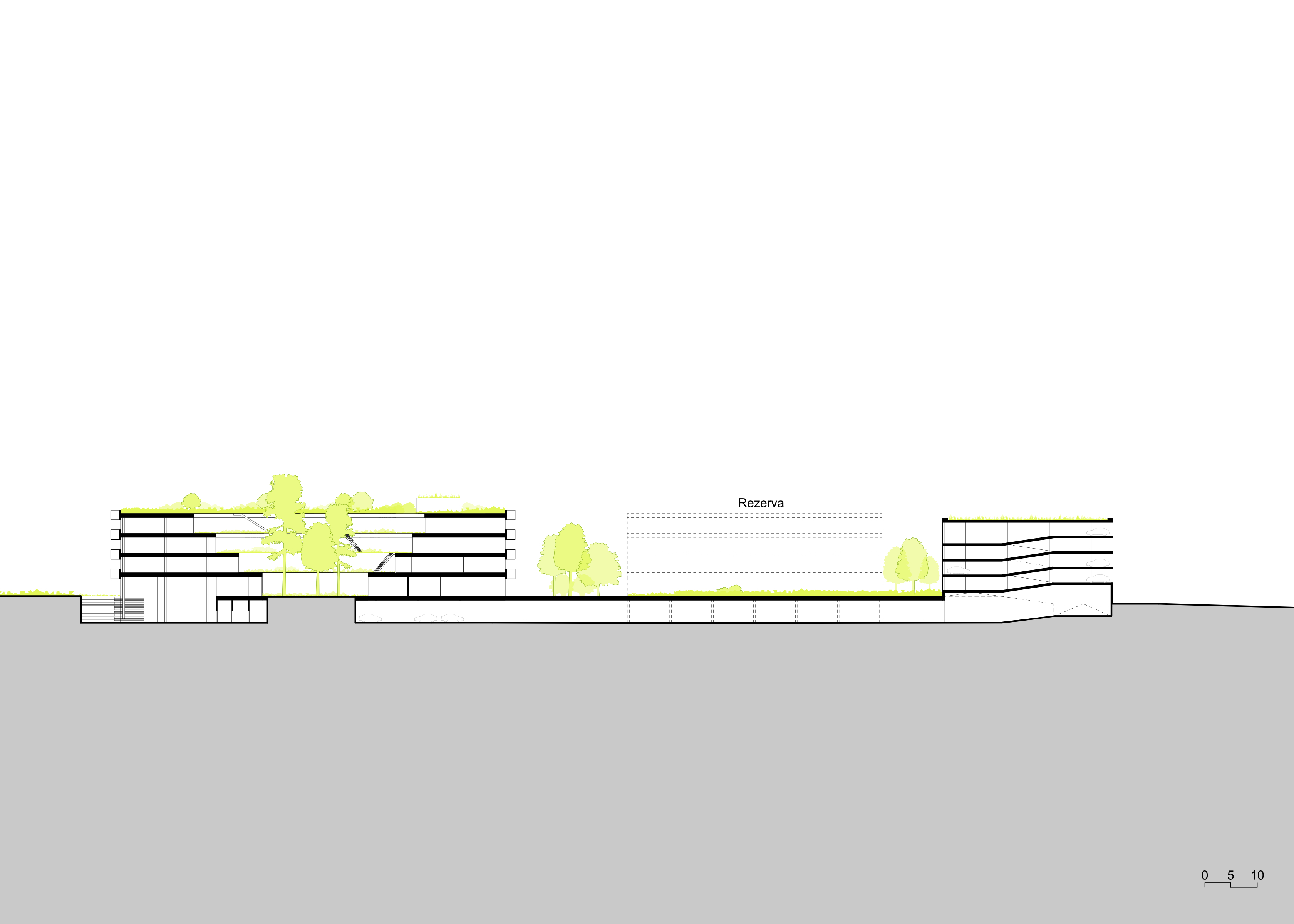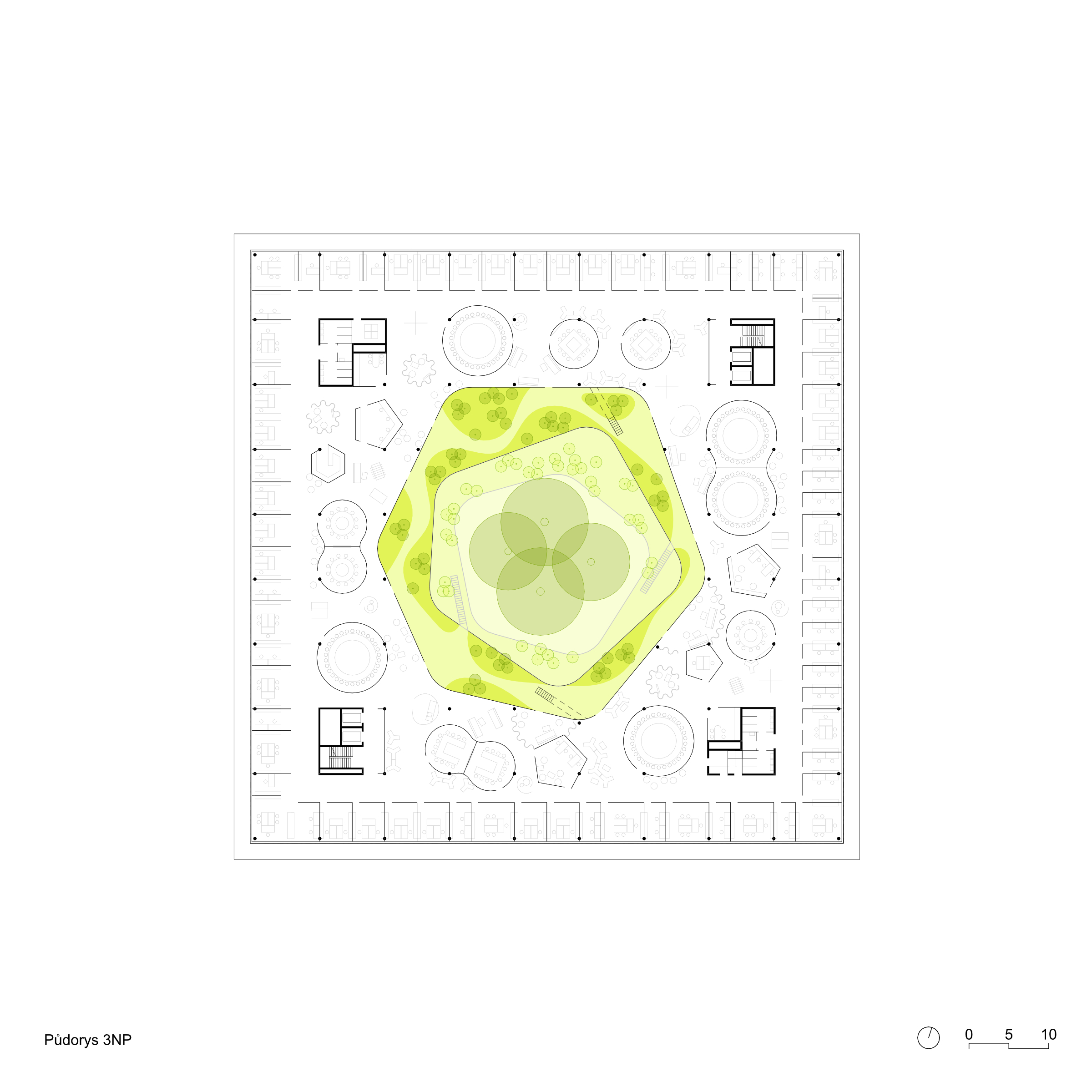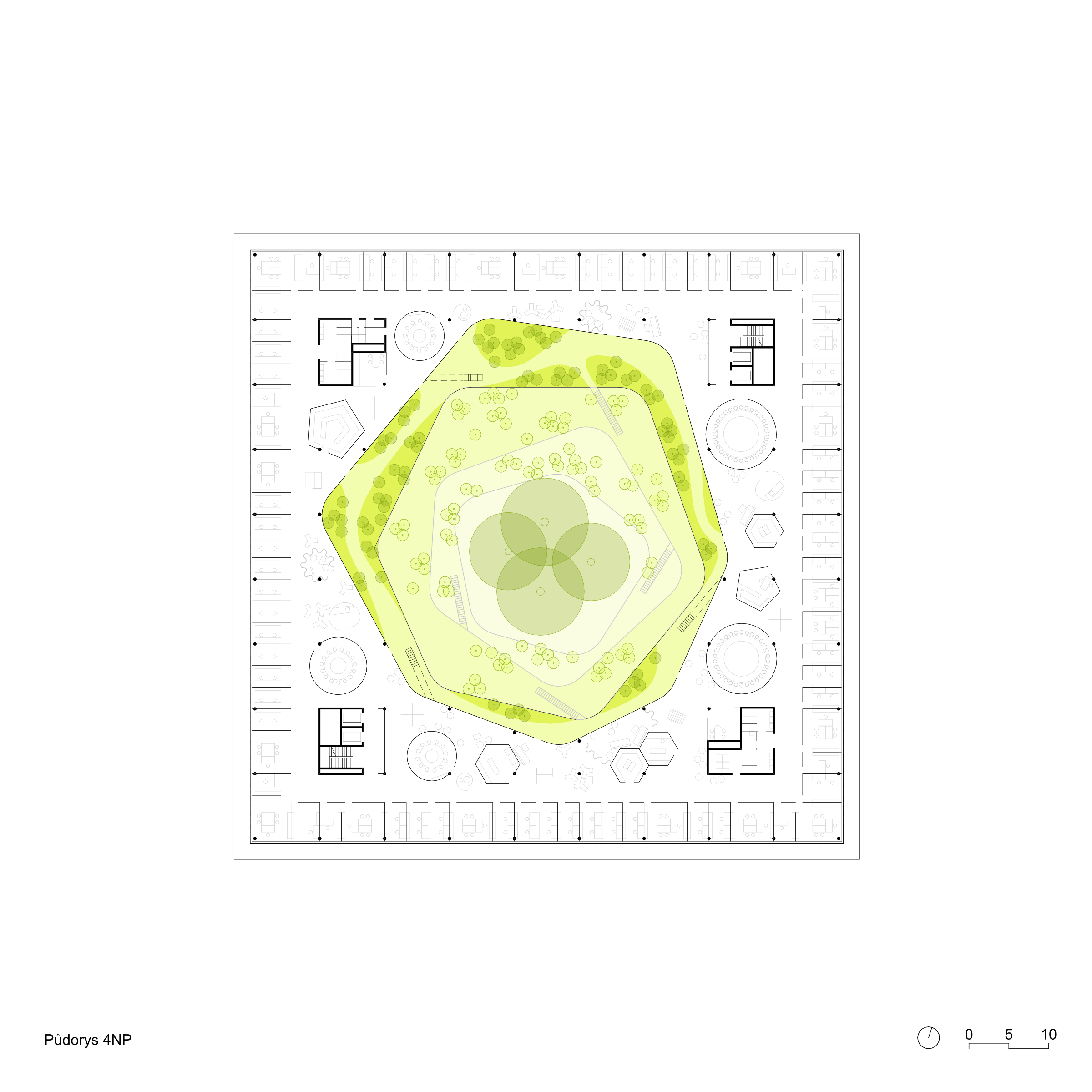Koncept soutěžního návrhu nového sídla NÚKIB je založen na kontrastu organického v ortogonálním. Racionální uzavřená vnější forma objektu navazuje na inertní okolí a ukrývá v sobě tvarově bohaté a členité atrium. Okolo něj jsou seřazeny pracovní prostory pro požadované specifické funkce. Široká paleta pracovních míst od sdílených prostor, přes skupinové a specializované laboratoře, až po individuální pracovny pro soustředěnou činnost. Hlavní objekt je vnořen do hloubi aktuálně neprostupného areálu. Za hranicí pozemku od ulice Mathonovy je umístěn servisní parkovací a vjezdový objekt, ve kterém je realizována veškerá filtrace a monitoring vjezdů. Prostor mezi hlavní budovou a servisním objektem je rezervován pro budoucí rozšíření kapacity.