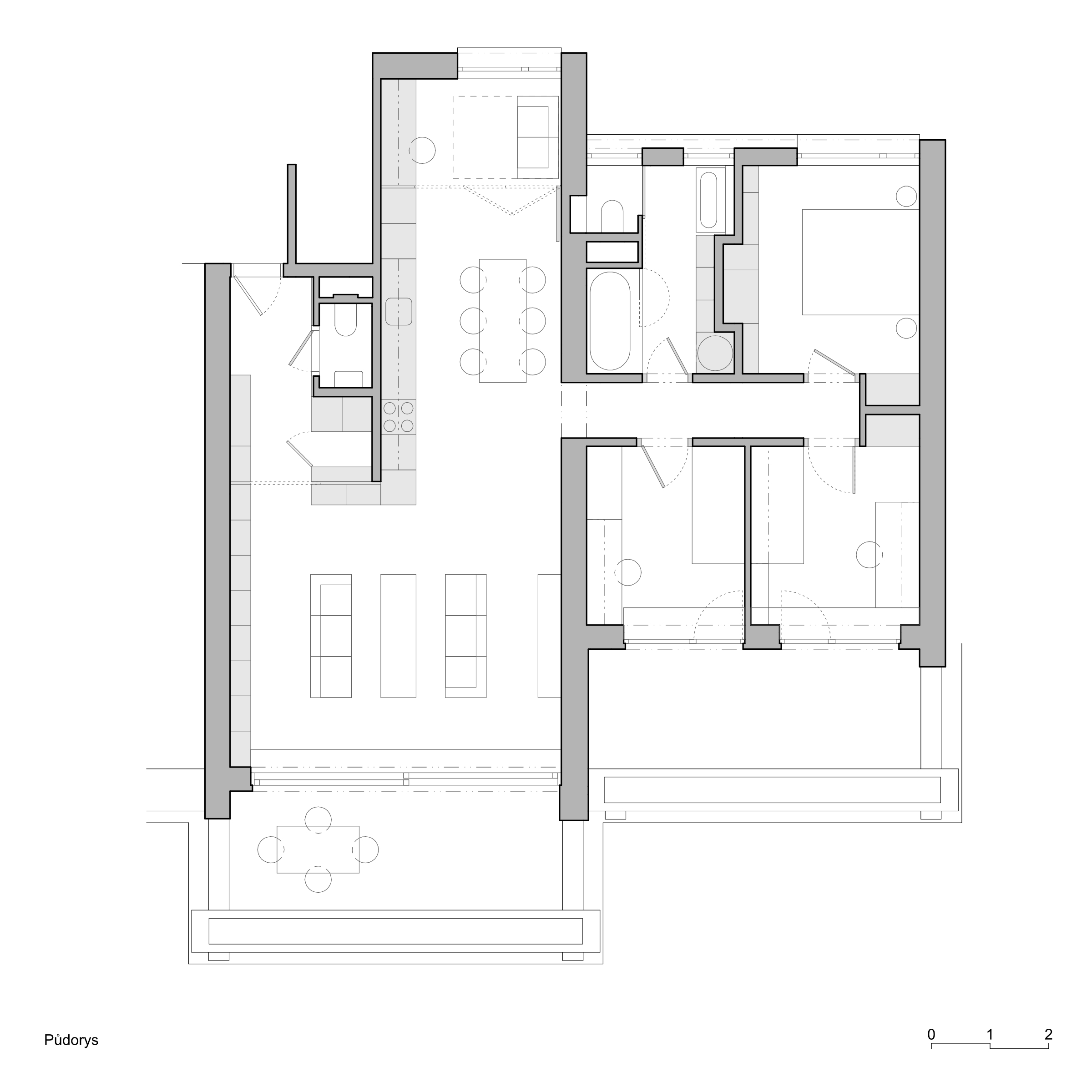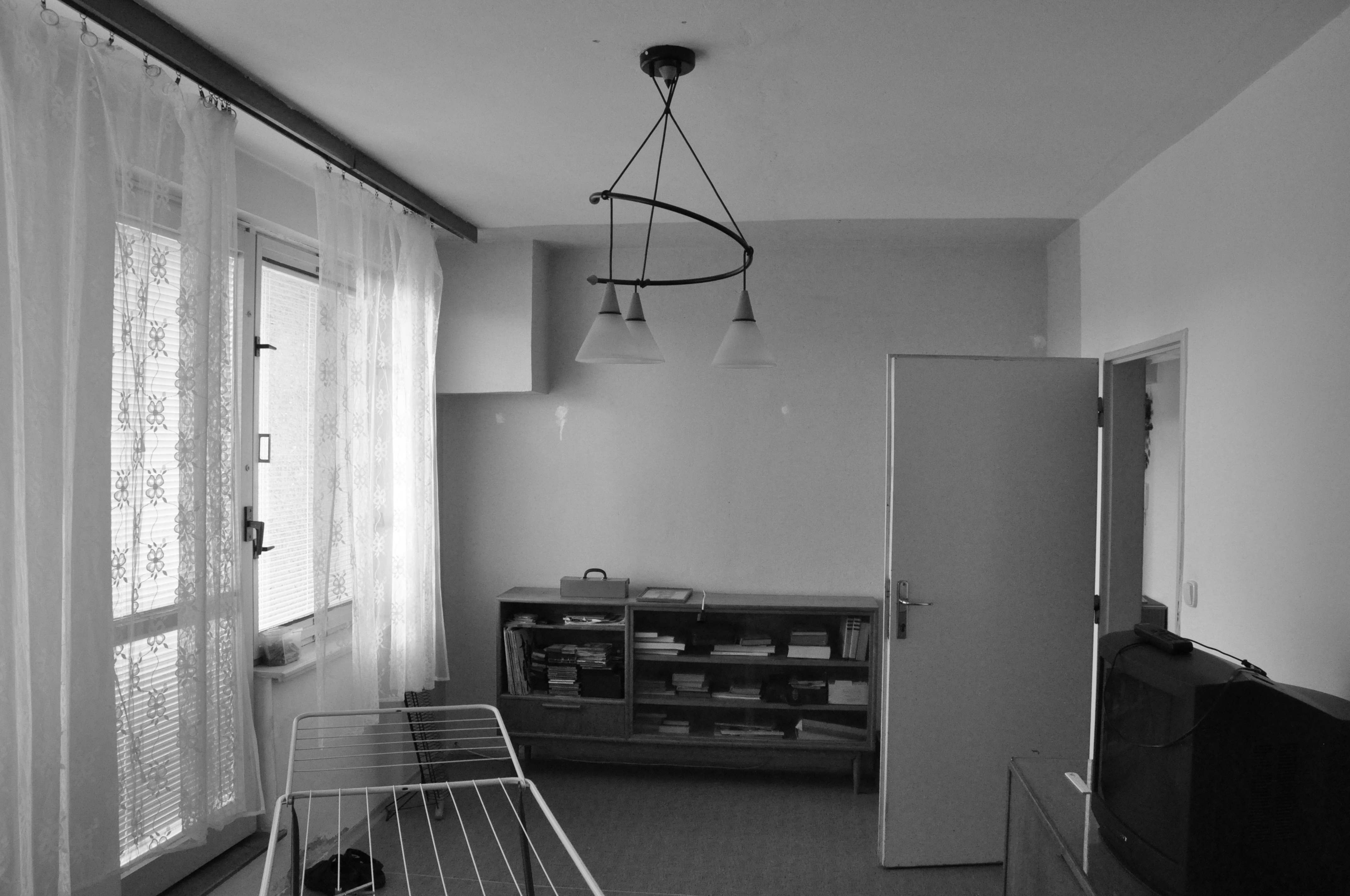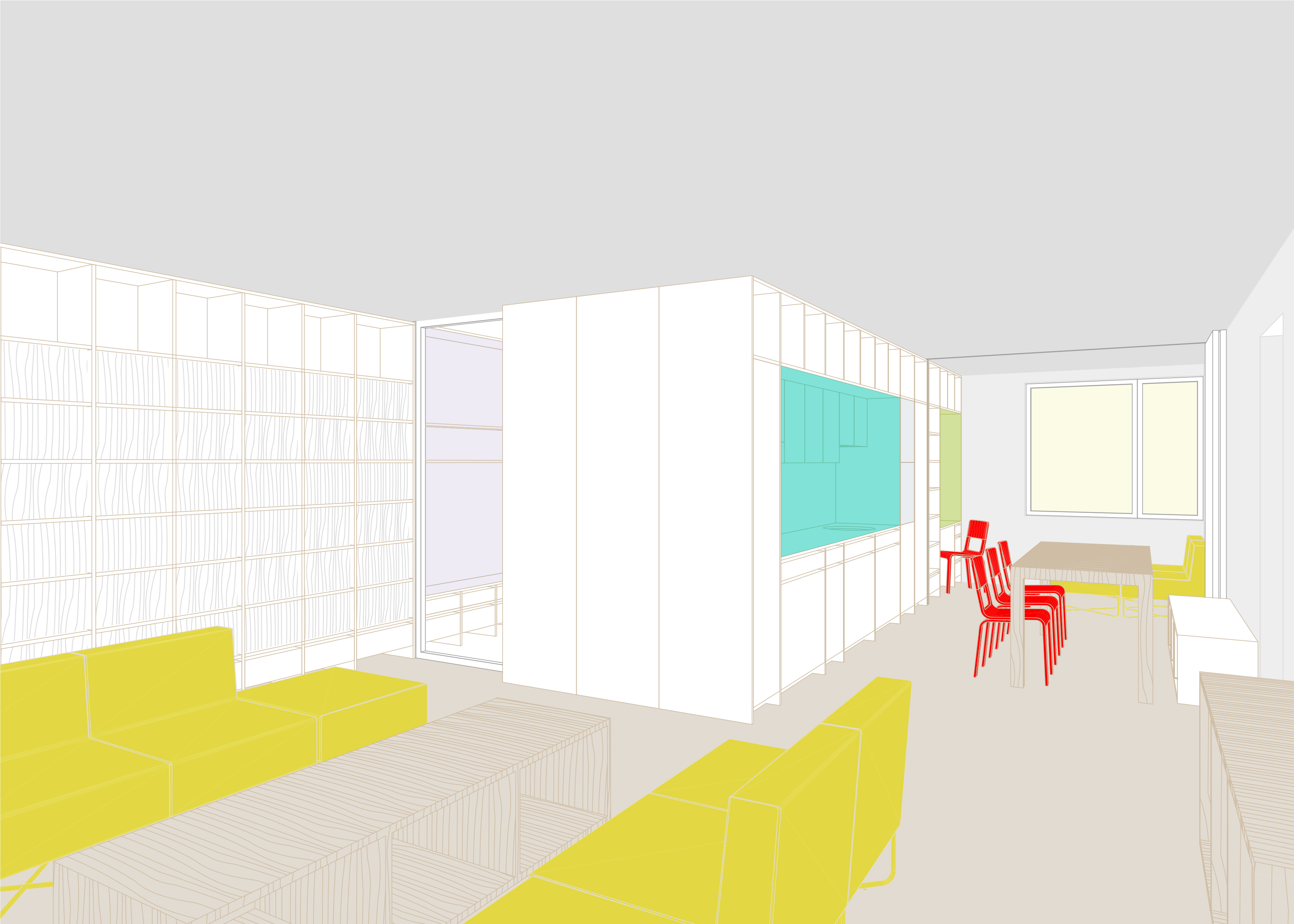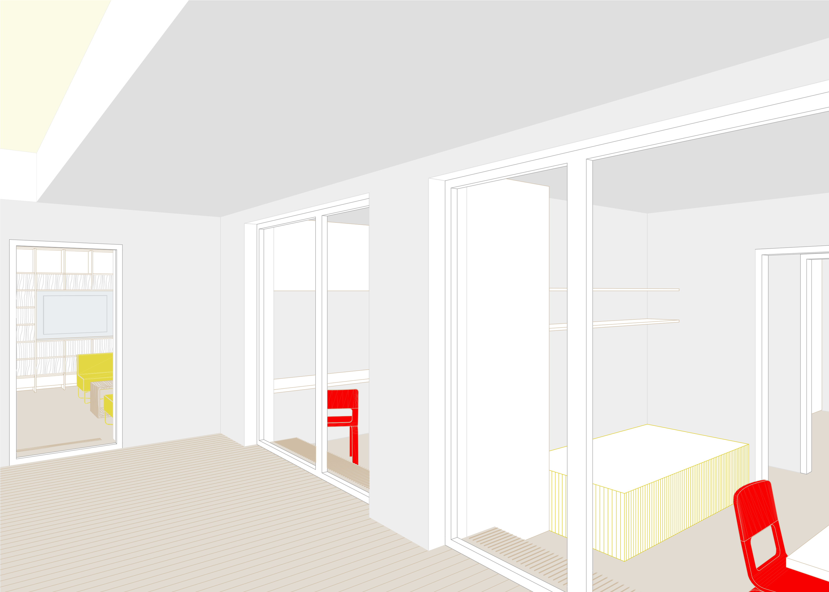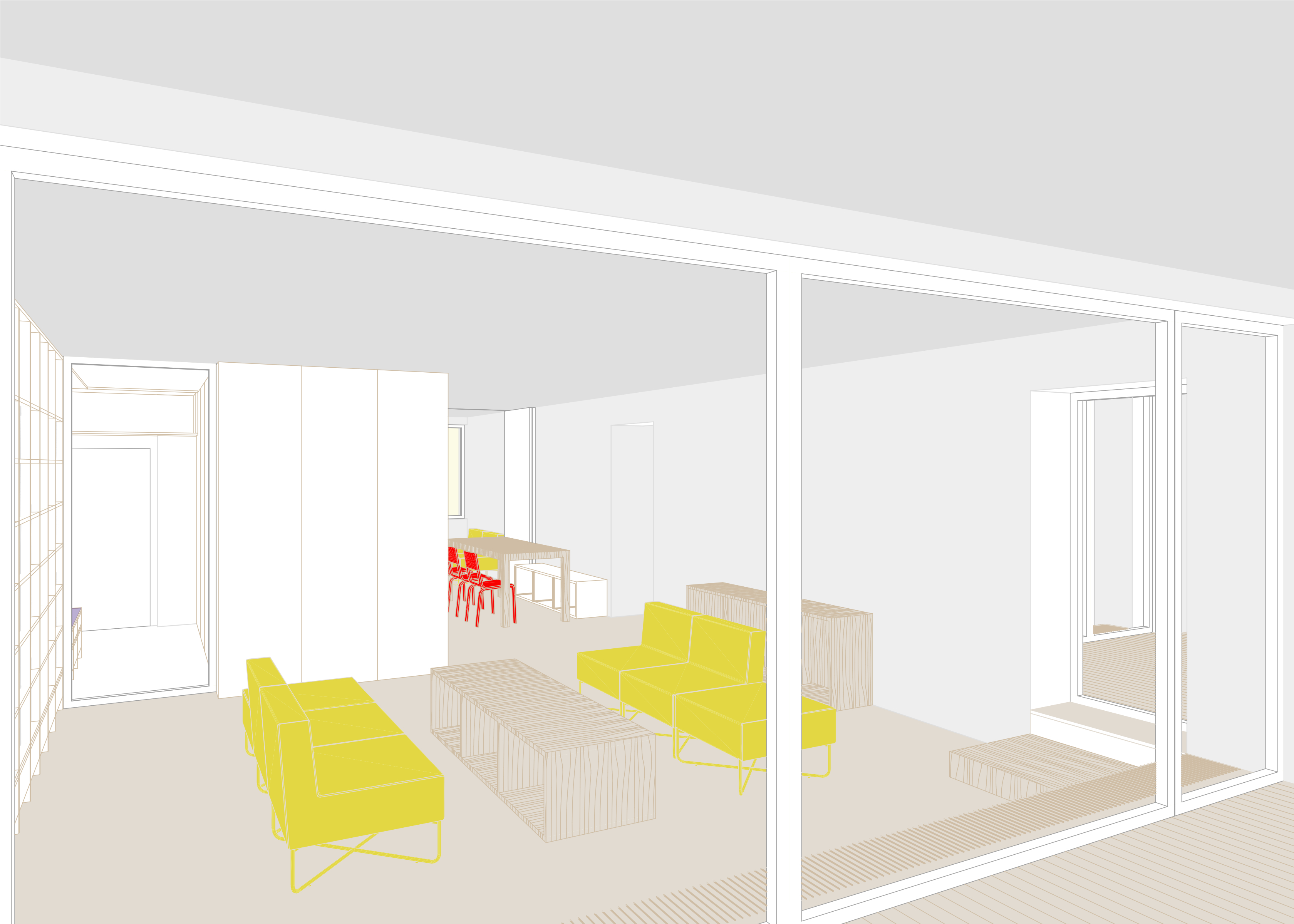 Zachováváme původní členění bytu na obytnou a klidovou část, snažíme se však o jejich maximální prosvětlení a propojení s terasou a výhledem. V obytné části proto navrhujeme vybourání příček mezi třemi samostatnými místnostmi, rozšíření okna na terasu a snížení jeho parapetu na úroveň balkonových dveří. Sjednocený prostor obytné části tak získává osvětlení z obou stran a velkorysým oknem se rozšiřuje také o plochu terasy. Záměrem je byt co nejvíce prosvětlit a to jak dispozičním řešením, tak volbou materiálů a barev. Bílá výmalba, světlé podlahy a bílý vestavěný nábytek společně vymezují prostor, do kterého je možné vkládat nábytkové solitéry bohaté tvarově, barevně i materiálově.