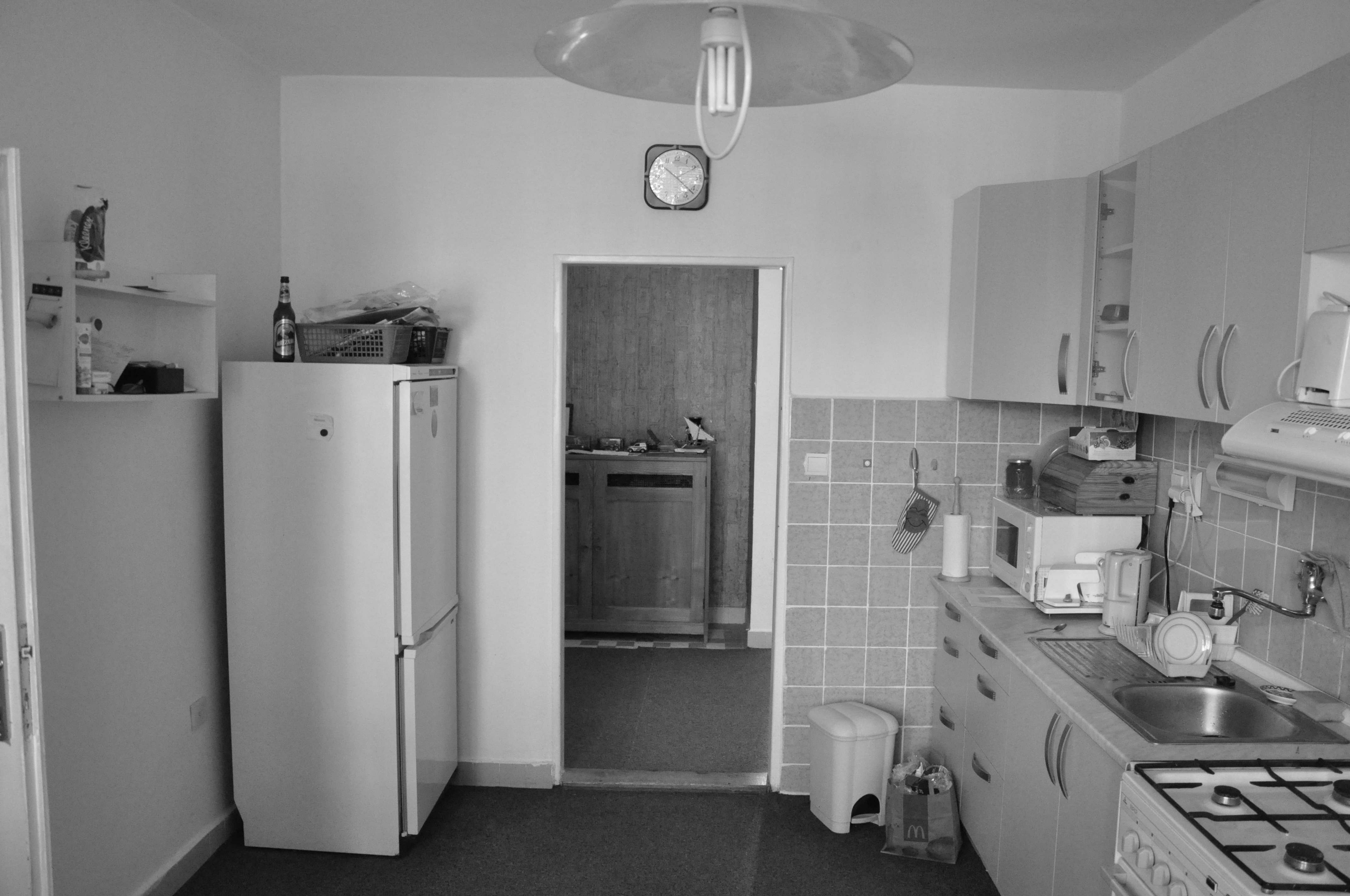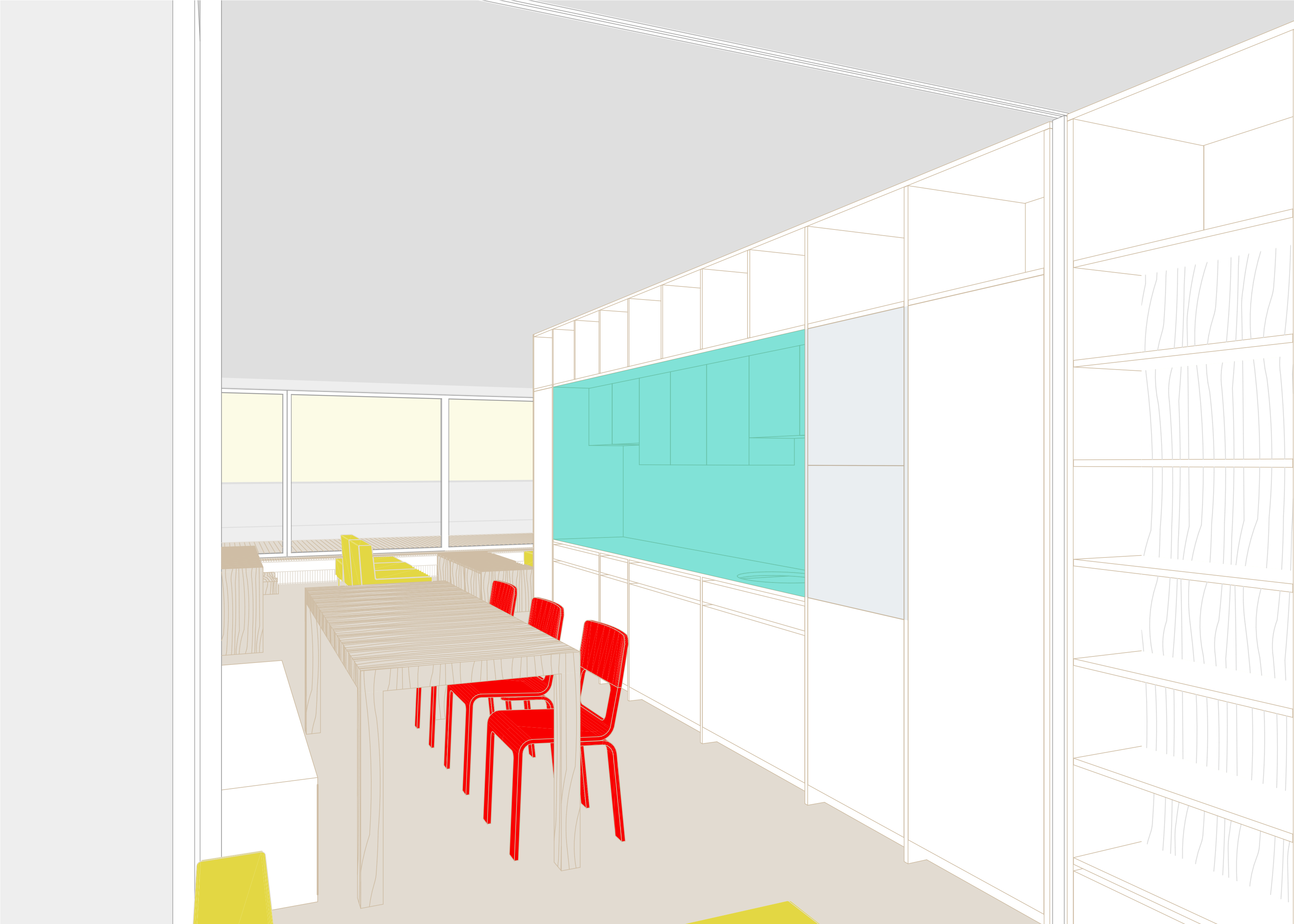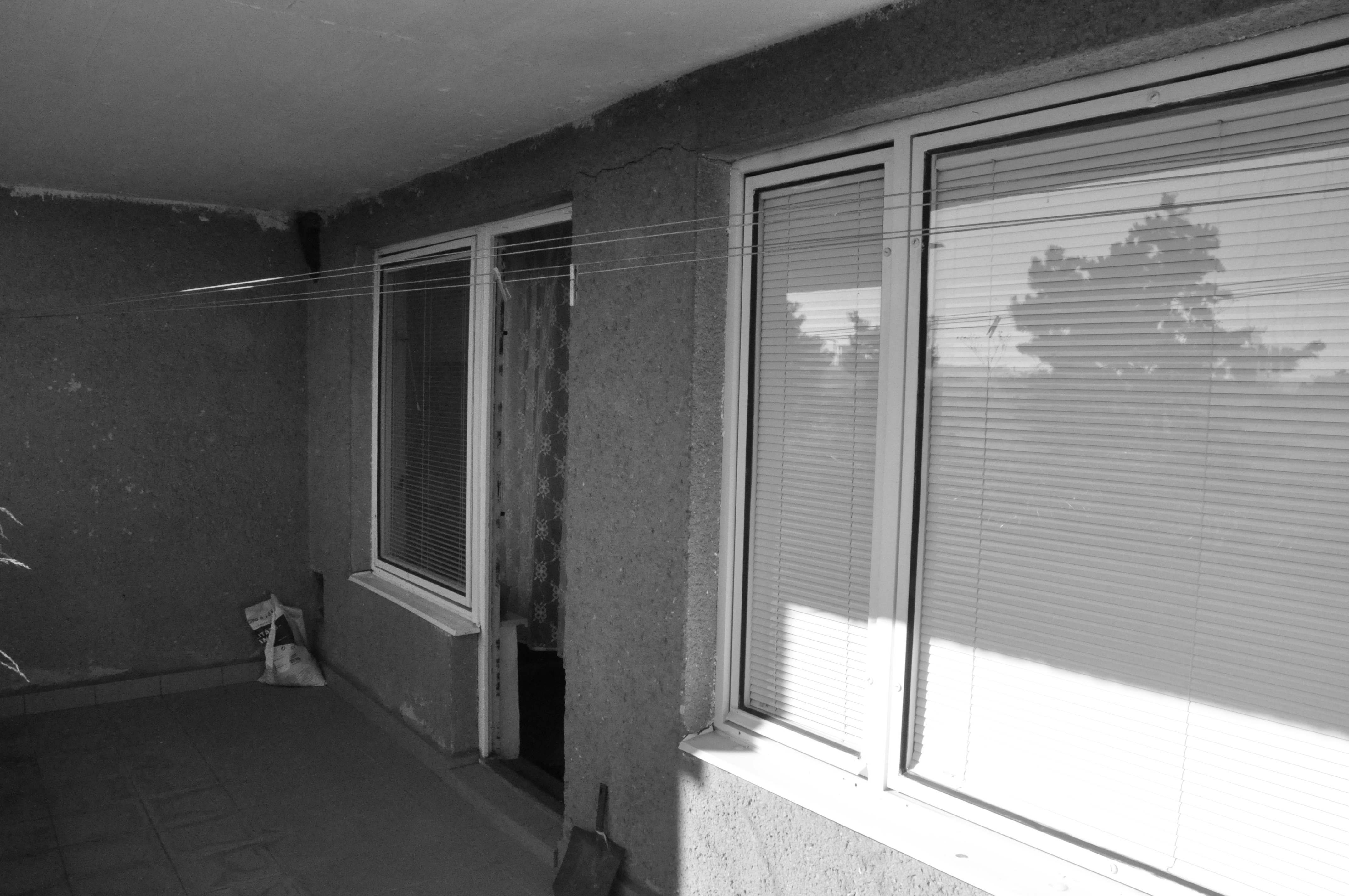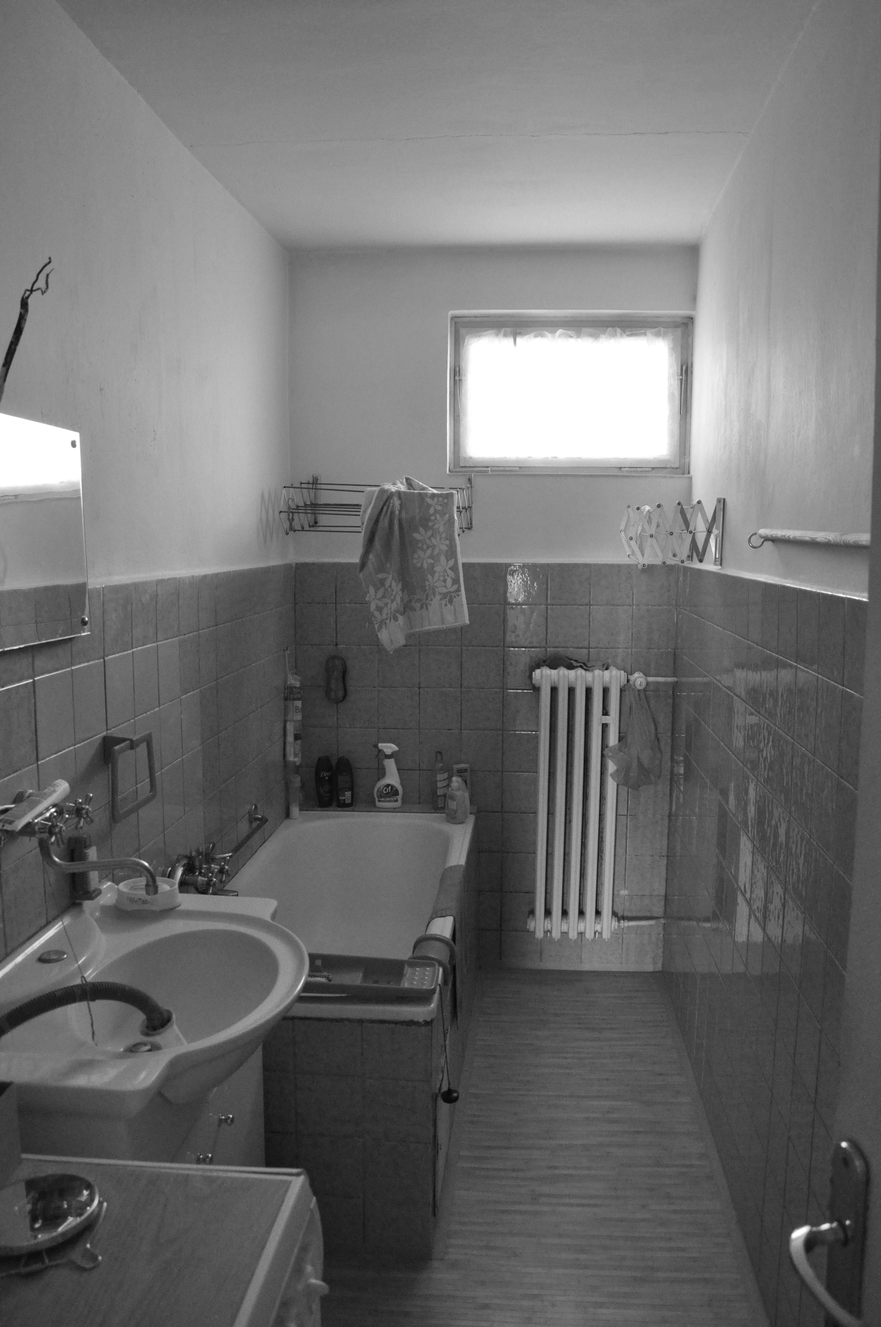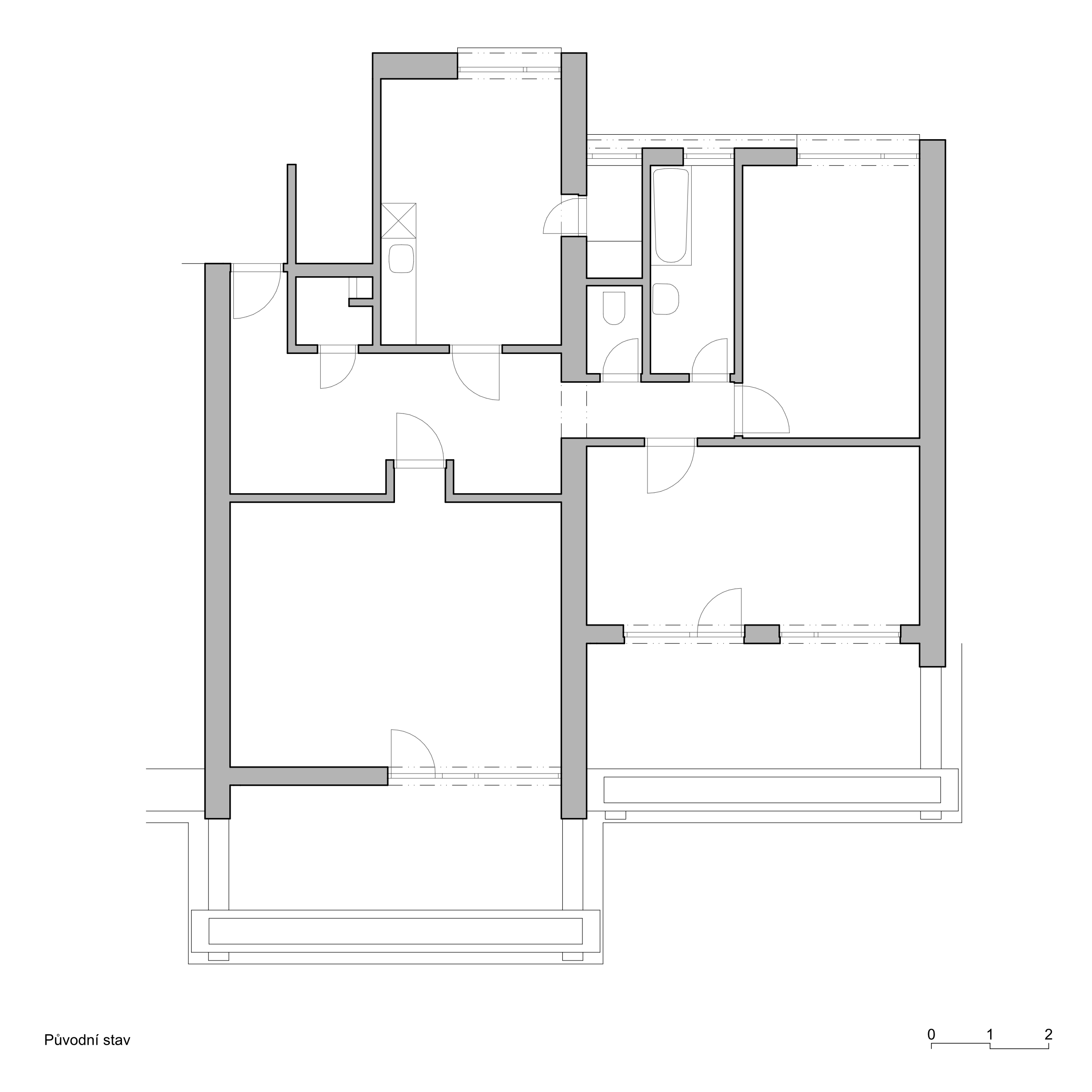 Zachováváme původní členění bytu na obytnou a klidovou část, snažíme se však o jejich maximální prosvětlení a propojení s terasou a výhledem. V obytné části proto navrhujeme vybourání příček mezi třemi samostatnými místnostmi, rozšíření okna na terasu a snížení jeho parapetu na úroveň balkonových dveří. Sjednocený prostor obytné části tak získává osvětlení z obou stran a velkorysým oknem se rozšiřuje také o plochu terasy. Záměrem je byt co nejvíce prosvětlit a to jak dispozičním řešením, tak volbou materiálů a barev. Bílá výmalba, světlé podlahy a bílý vestavěný nábytek společně vymezují prostor, do kterého je možné vkládat nábytkové solitéry bohaté tvarově, barevně i materiálově.