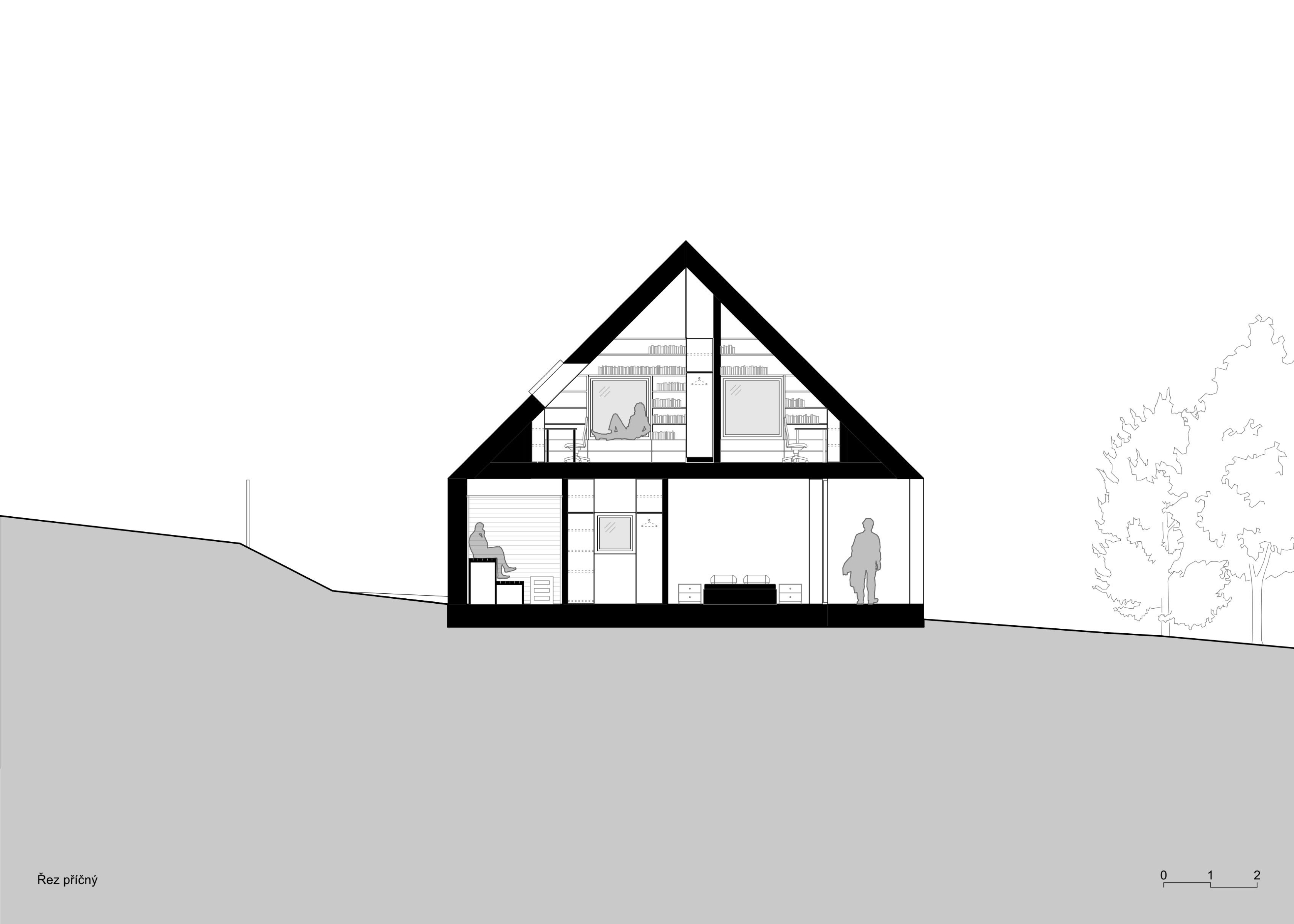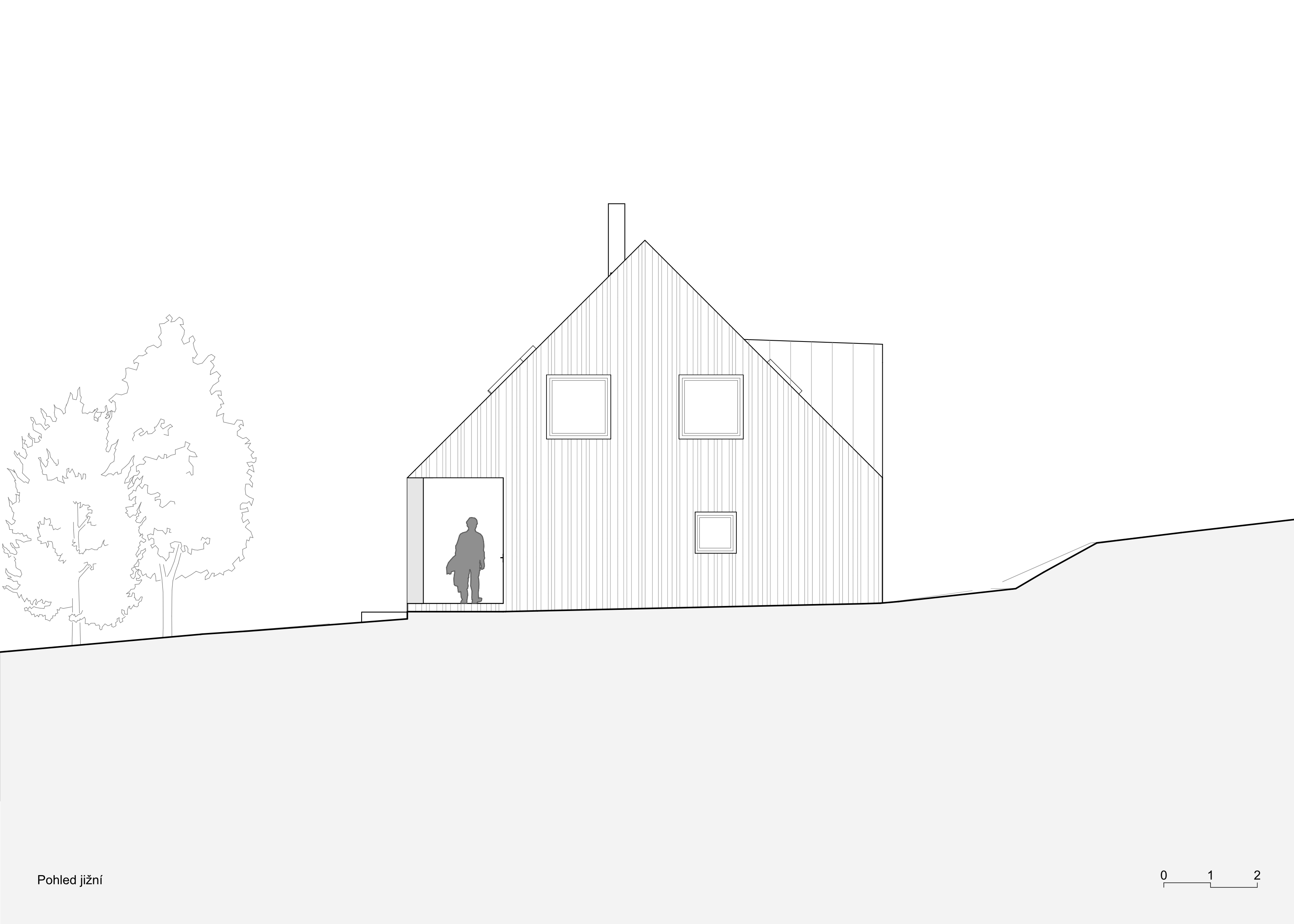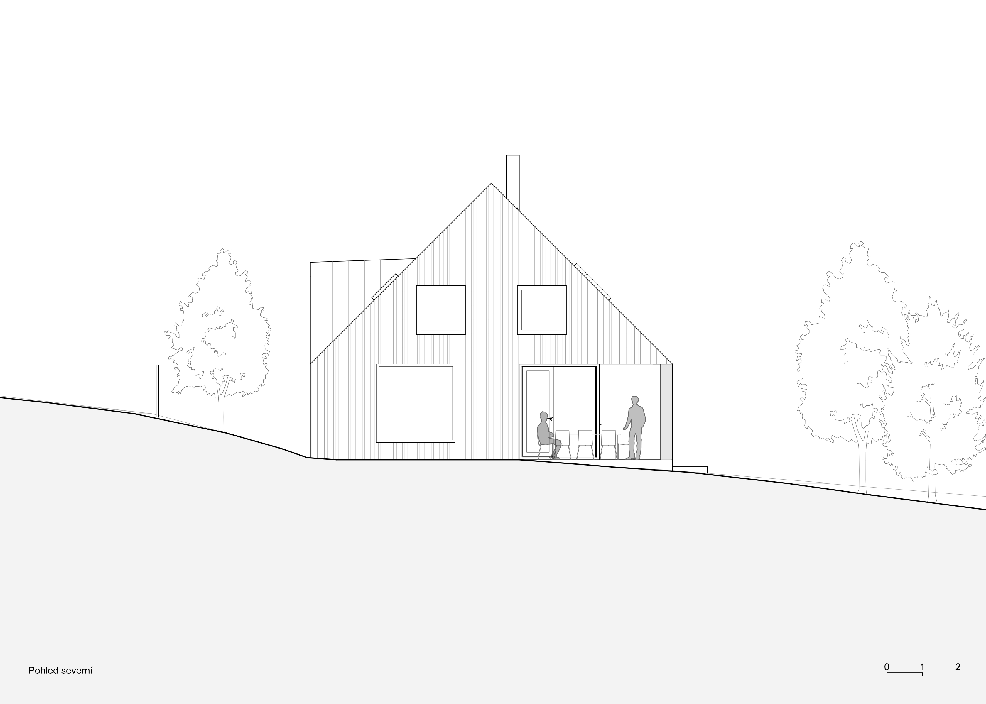 Dům s archetypální sedlovou střechou je pokusem o současné venkovské stavení pro podhůří Krkonoš propojující interiér s okolní přírodou. Západní část přízemí ustupuje a vytváří kryté zápraží. Hlavní obytný prostor tvoří světnice s kuchyní a jídelnou otevřenou na částečně krytou terasu propojenou se zahradou. Soukromá část přízemí skrývá ložnici, šatnu, koupelnu a saunu. Podkroví nabízí pokoj pro hosty, koupelnu a čtyři individuální pokoje s okny s nízkým sedacím parapetem, které nabízí výhled jak do zahrady, tak i do krajiny. Dům je postaven z převážně masivního dřeva. Obnažený strop v přízemí je modřínový stejně jako fasády. V interiéru bude modřín stárnout do teplého odstínu, kdežto fasády získají přirozený stříbrný nádech opršelého dřeva. Dojem útulného útočiště skrytého uprostřed zahrady se bude časem ještě posilovat. Zahrada se starými ovocnými stromy a jednou snad i novým sadem zůstává otevřená a bez oplocení, aby navázala na tradiční ráz podhorské krajiny.