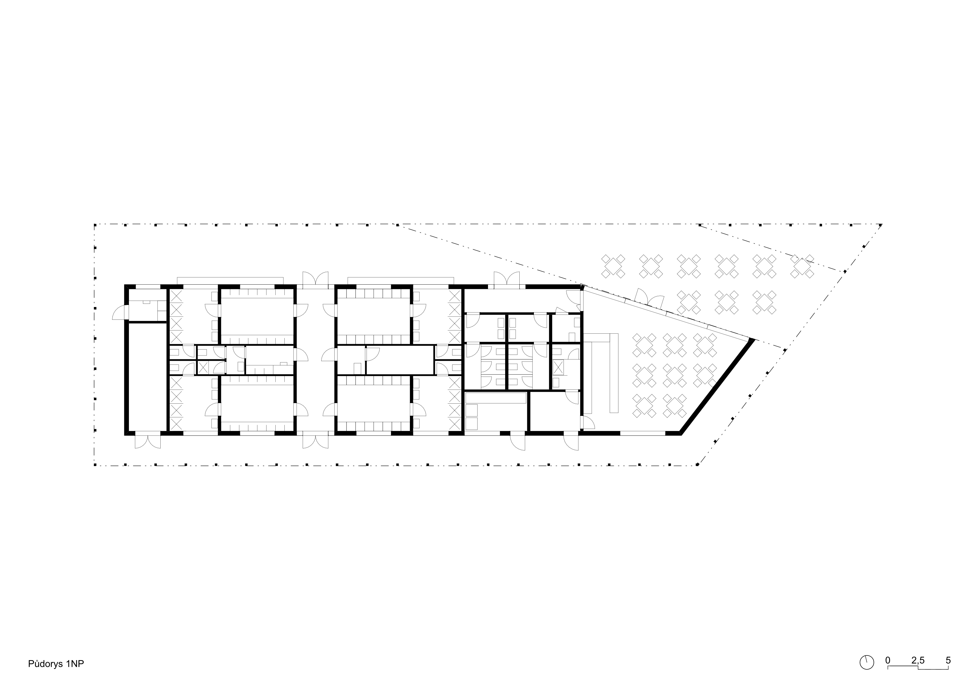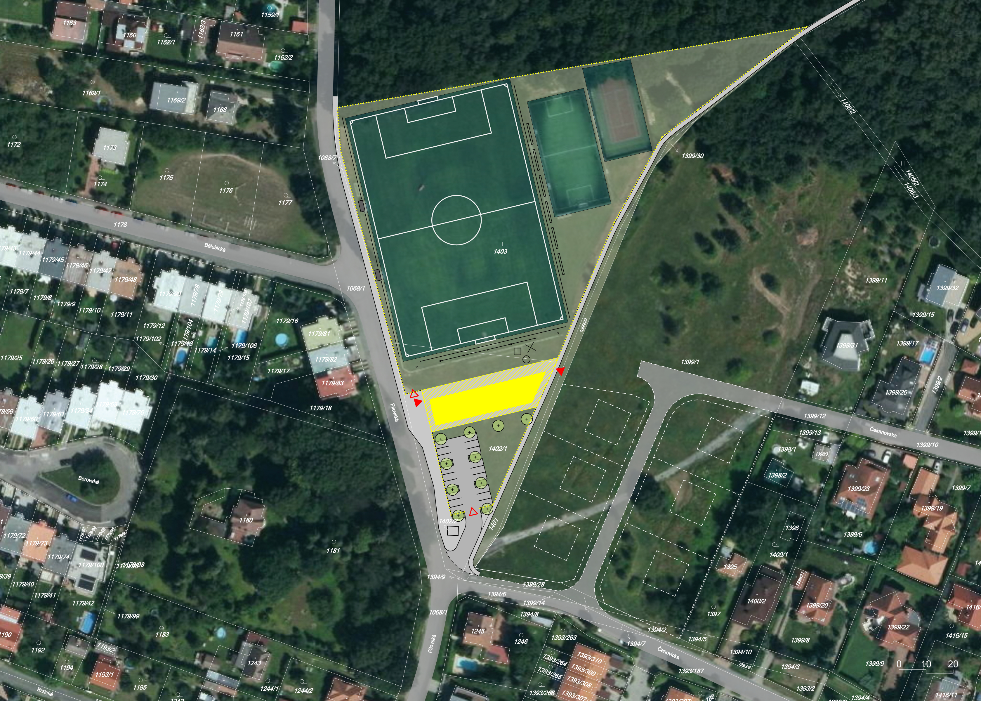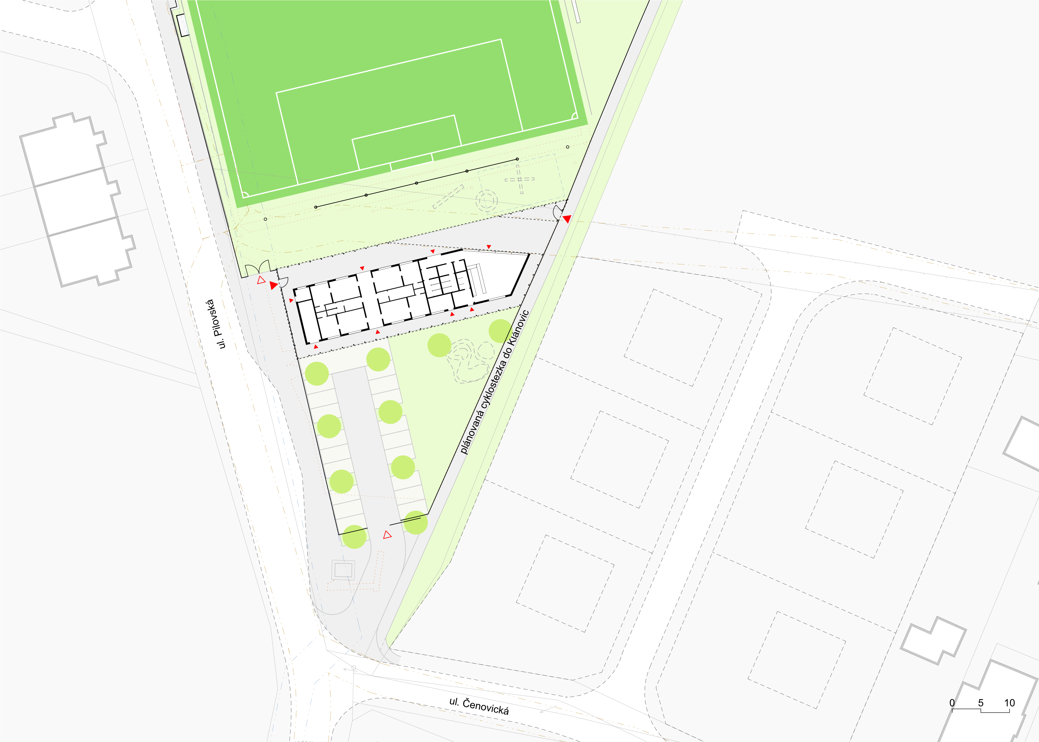 Místo na hraně Klánovického lesa, v sousedství rozvíjející se vilové zástavby. Šatny a zázemí sportovního areálu přinese do lokality občanskou vybavenost i kultivaci souvisejících veřejných prostor. V kooperaci s městskou částí usilujeme také o koordinaci výstavby na souaseních pozemcích tak, aby byla maximálně využita sportovní funkce dotčených ploch definovaných v územním plánu. Objekt zázemí umisťujeme kolmo k ulici Pilovské, za jižní hranici hřiště. Od jedné hrany pozemku ke druhé. Dům má po celém svém obvodu ochoz, krytý subtilní střešní konstrukcí nesenou jemnou osnovou sloupů. Objem objektu je tak odlehčen a hranice mezi uvnitř a venku je záměrně znejasněna. Přesto dům uvnitř areálu čitelně vymezuje část sportovní od části více veřejné a obslužné.