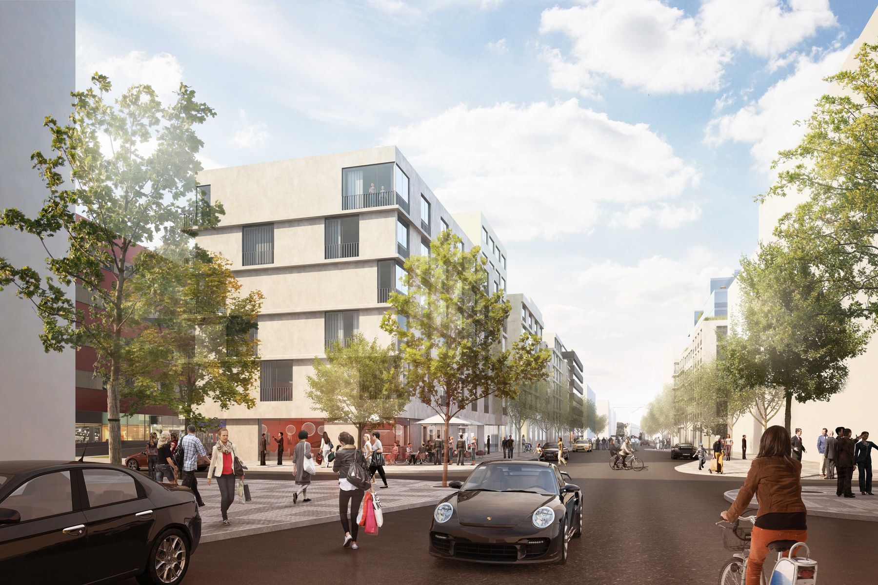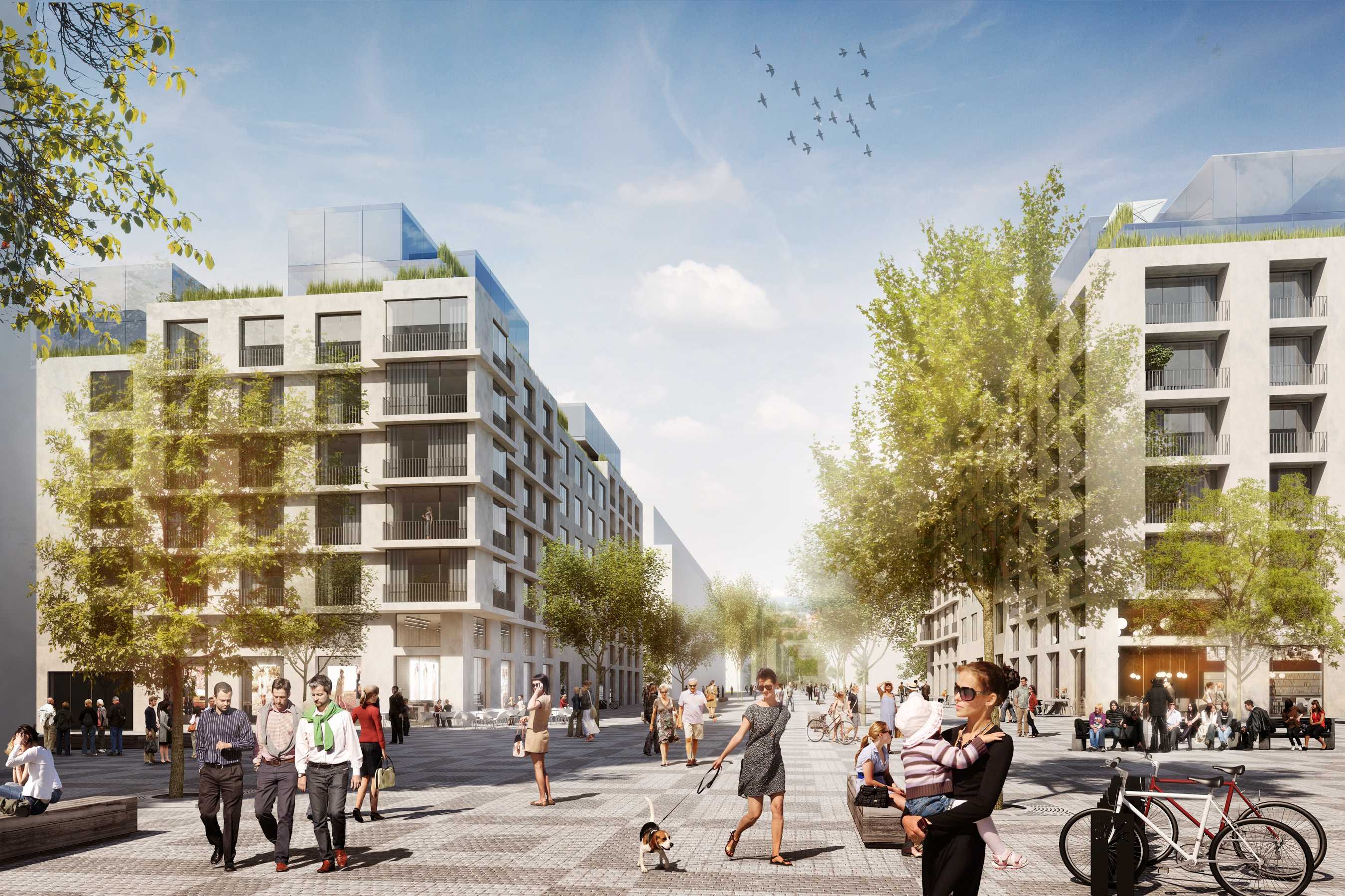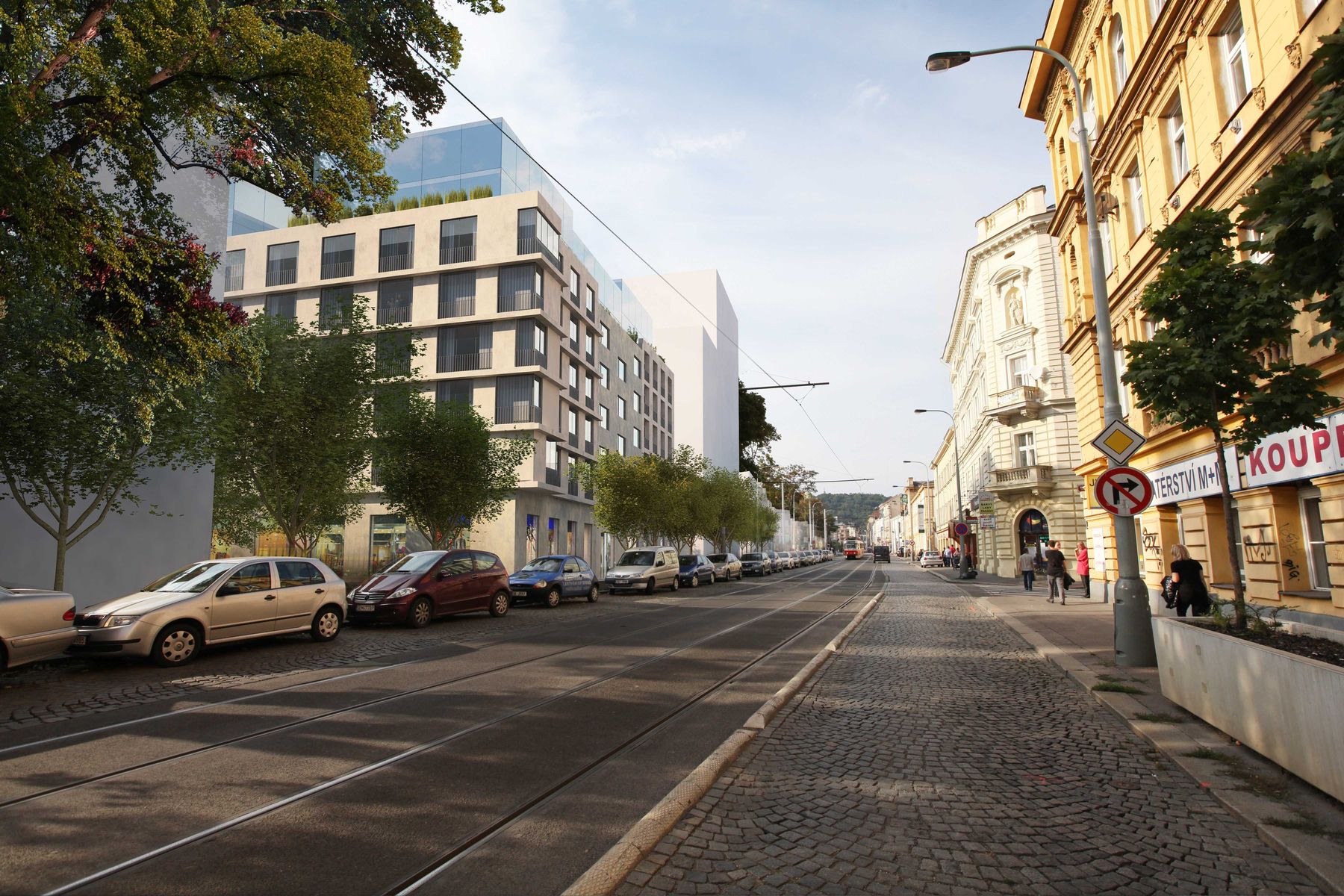 We design solid but generously lit houses up to the height of the main cornice and then place light or playful stepped extensions above it. The material design of the facades and entrances reflects the playfulness of the public spaces in which the houses are located. In the main boulevard, we use glass tiles in the parterre with reference to the quality architecture of the First Republic. For the side streets we use industrial painted sheet metal or traditional noble plaster. On the residential floors we work with solid wood motifs, matt glass, at the same time interpreted stone details of window lining and locksmith details of balconies or loggias. The construction is currently in progress.