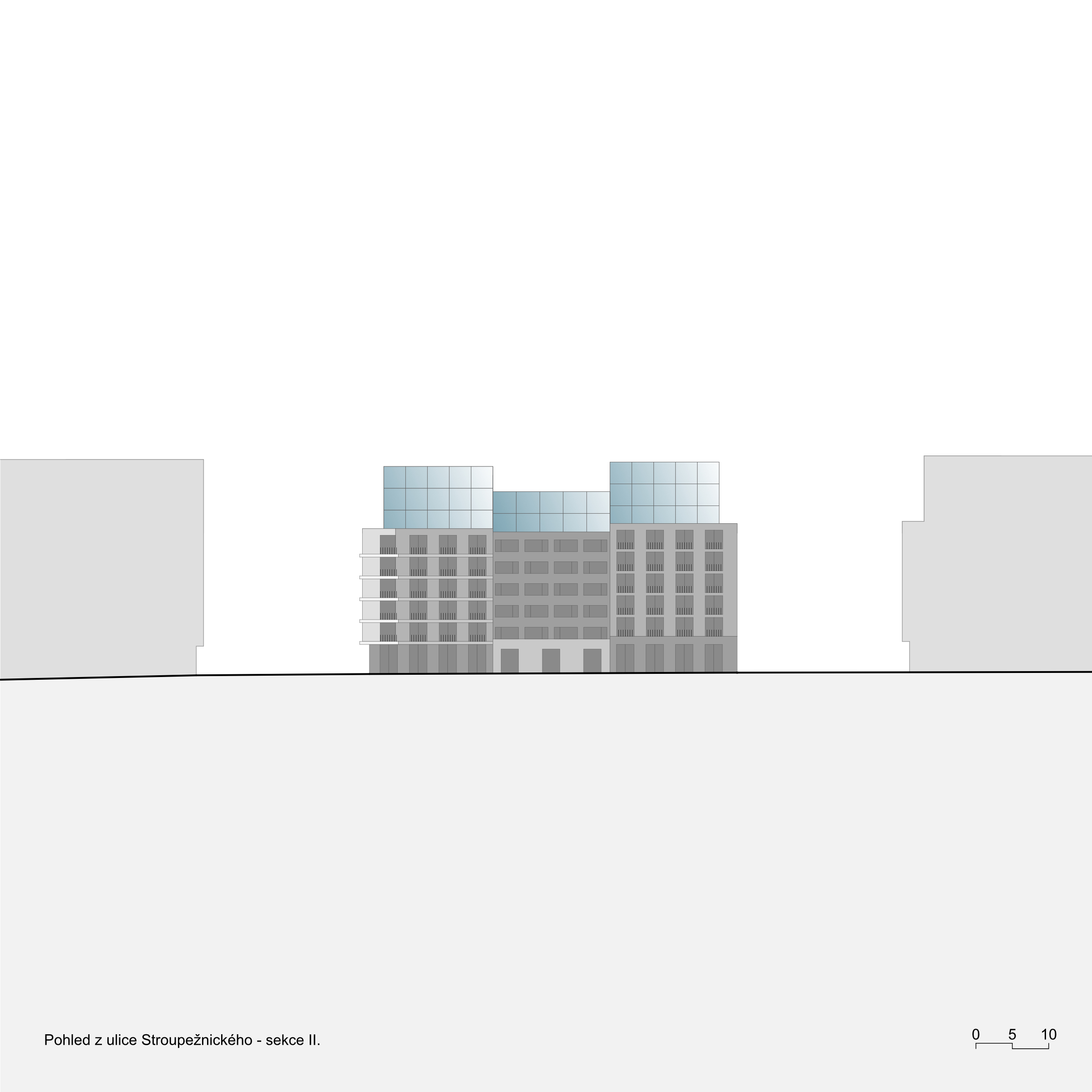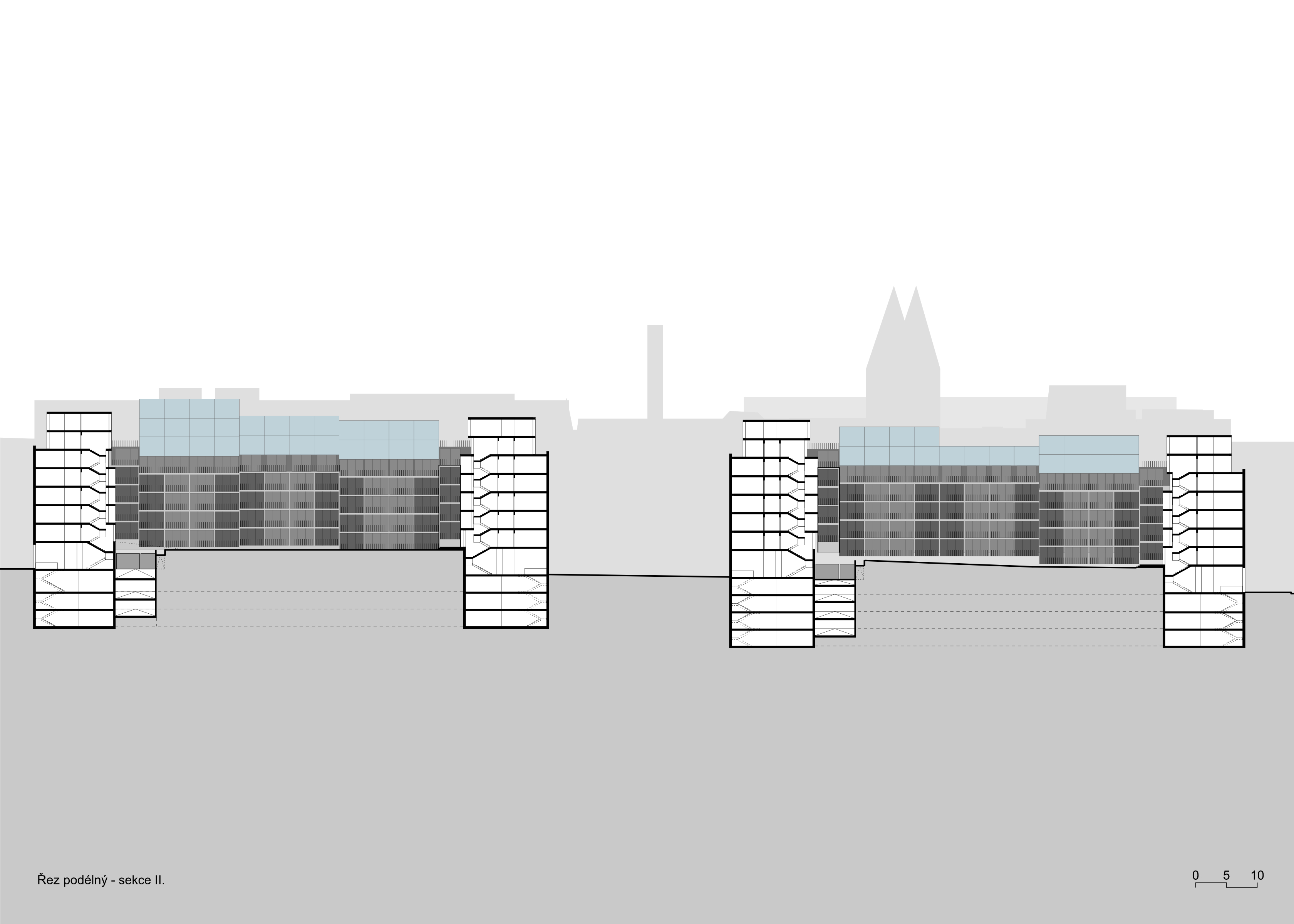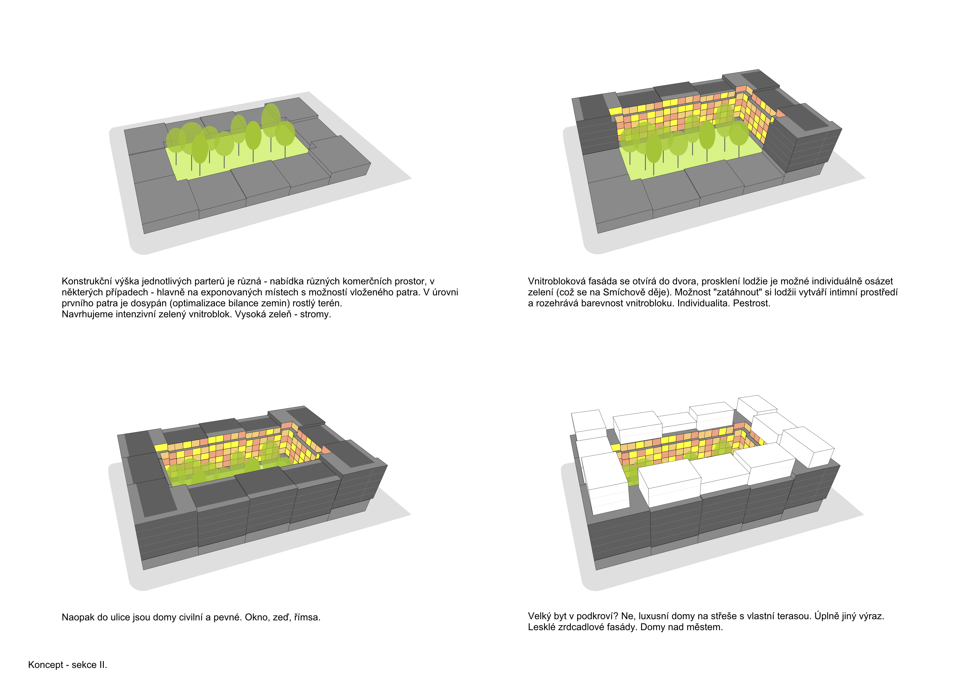 The Smíchov City project represents the transformation of the Smíchov North Station brownfield into a new urban district. It will offer almost 400,000 m2 of residential, administrative, commercial and public space. Following our successful participation in an international competition, we were invited to design three residential sections of one of the new city blocks. Smíchov for us are conservative apartment buildings with a small number of flats per floor, lively pavilions or generously lit functionalist houses set back from the street line. One thing is characteristic for all the houses - they have attics into which spacious atypical flats are built.
