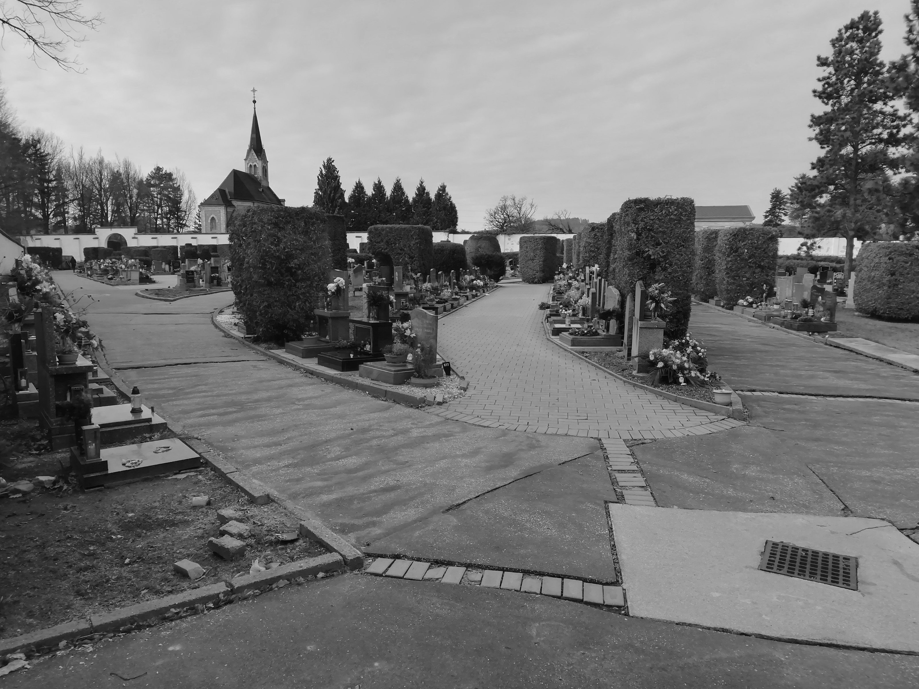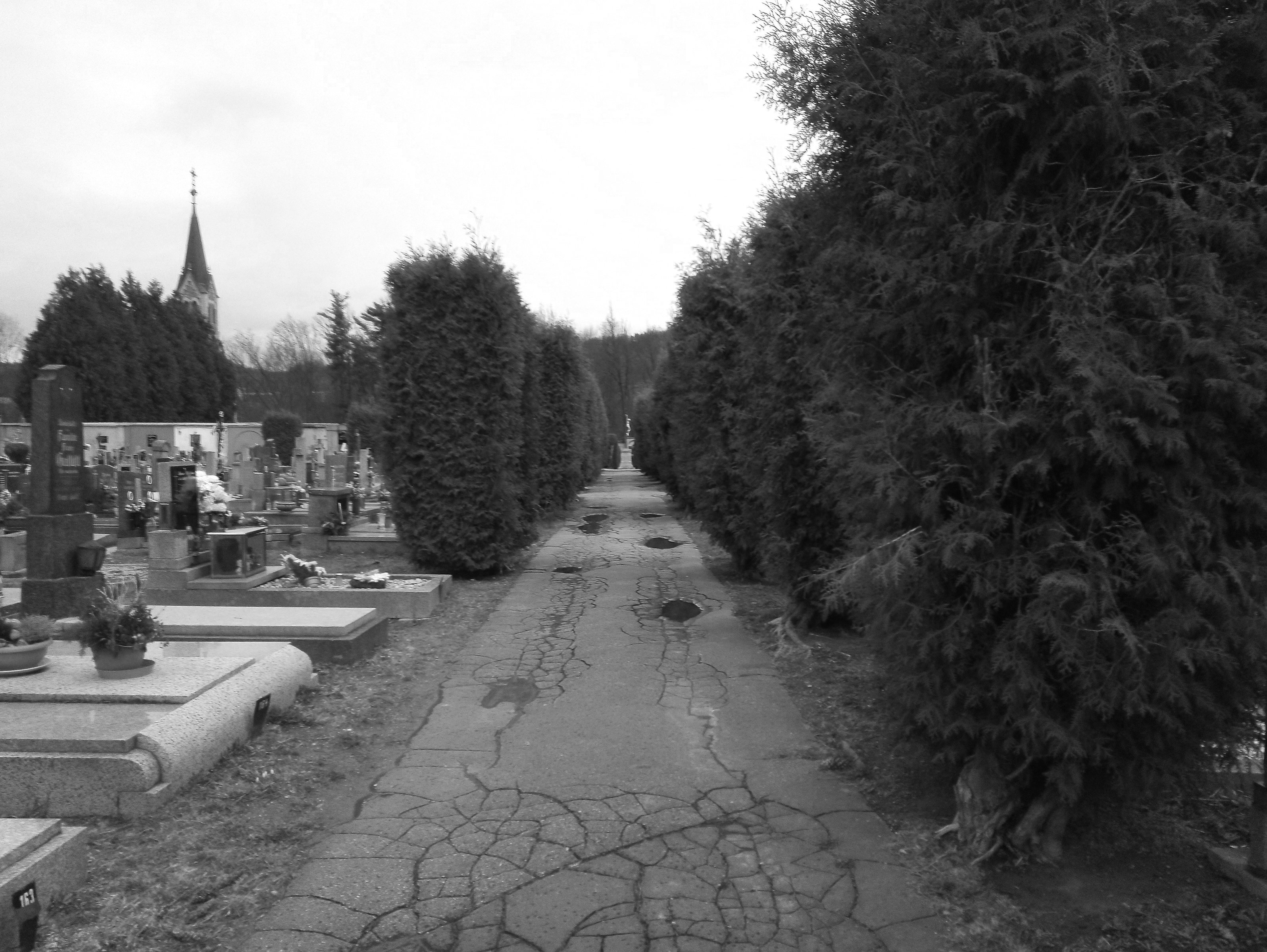V návaznosti na ideální plán rozvoje byla v první etapě navržena obnova cest a vegetace v celém prostoru stávajícího hřbitova. Původní asfaltové a betonové chodníky byly nahrazeny cestami z odsekové dlažby a pískového mlatu. Hierarchie cest byla podpořena nejen novou výsadbou stromů, které nahradily dožilé túje, ale i výtvarným návrhem malířky Lenky Vítkové. Lenka pracovala s dvojím odstínem žulové dlažby, aby vytvořila jemné křivky, které odkazují na motiv vlny či vibrace, nebo meandrující řeky. Cesty se stromy jsou doplněny lehkými dřevěnými lavičkami z krumlovského mobiliáře a ve strategických místech i těžkými lavicemi, které vyrůstají z žulové dlažby, aby definovaly či lemovaly důležité prostory. Urnový háj byl doplněn o množství stromů a hustá cestní síť byla výrazně zredukována, aby byl obnoven jeho přírodní charakter.