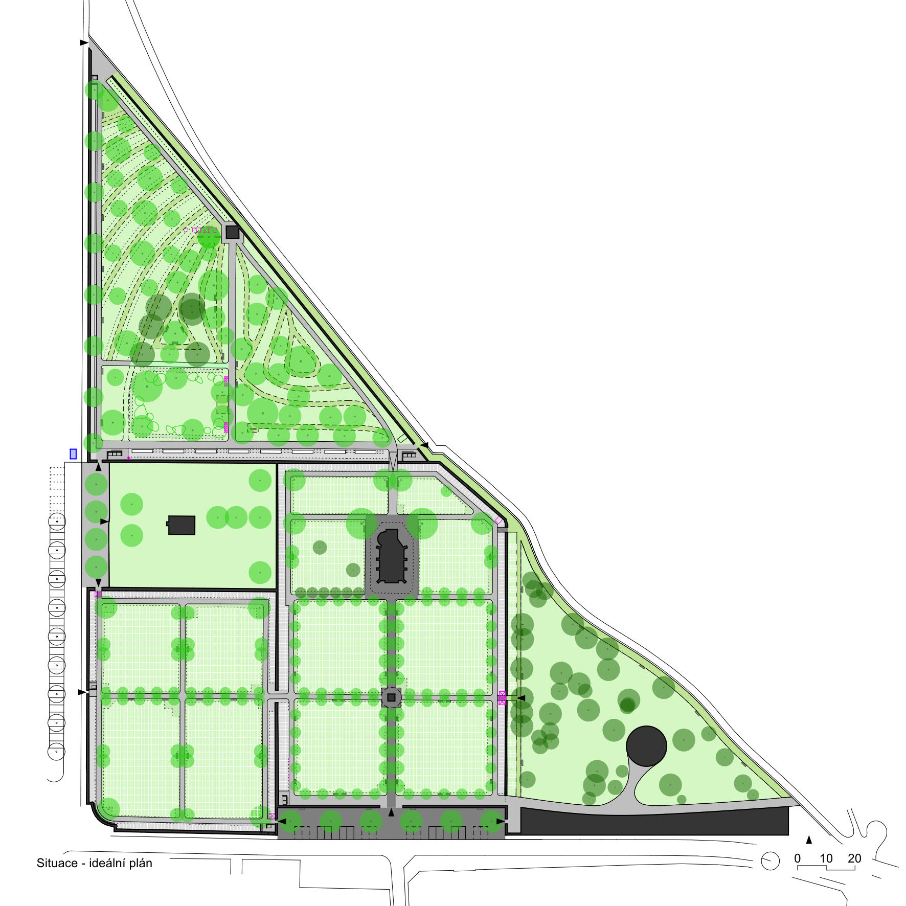 Cílem revitalizace městského hřbitova v Českém Krumlově bylo definovat limity pro jeho budoucí rozrůstání a hledat rovnováhu mezi městským prostředím a přírodou. Projekt přináší novou geometrickou koncepci, která spojuje původní hřbitov, parčík a rozšířený urnový háj do jednoho harmonického celku. Návrh dotváří stávající hranice do tvaru trojúhelníku, jehož kratší na sebe kolmé strany přesně vymezují pevné hranice města a hřbitova a delší strana navazující na svah Vltavy se volně přizpůsobuje přírodnímu charakteru místa. Záměr tak vědomě používá historickou analogii Krumlovského zámku, kde přesná geometrie zahrad kontrastuje s měkce tvarovanou přírodní strukturou skalního útesu. Součástí konceptu rozvoje je nové umístění obřadní síně a definice nových vstupů a cest tak, aby v budoucnu vznikla logická síť propojení.